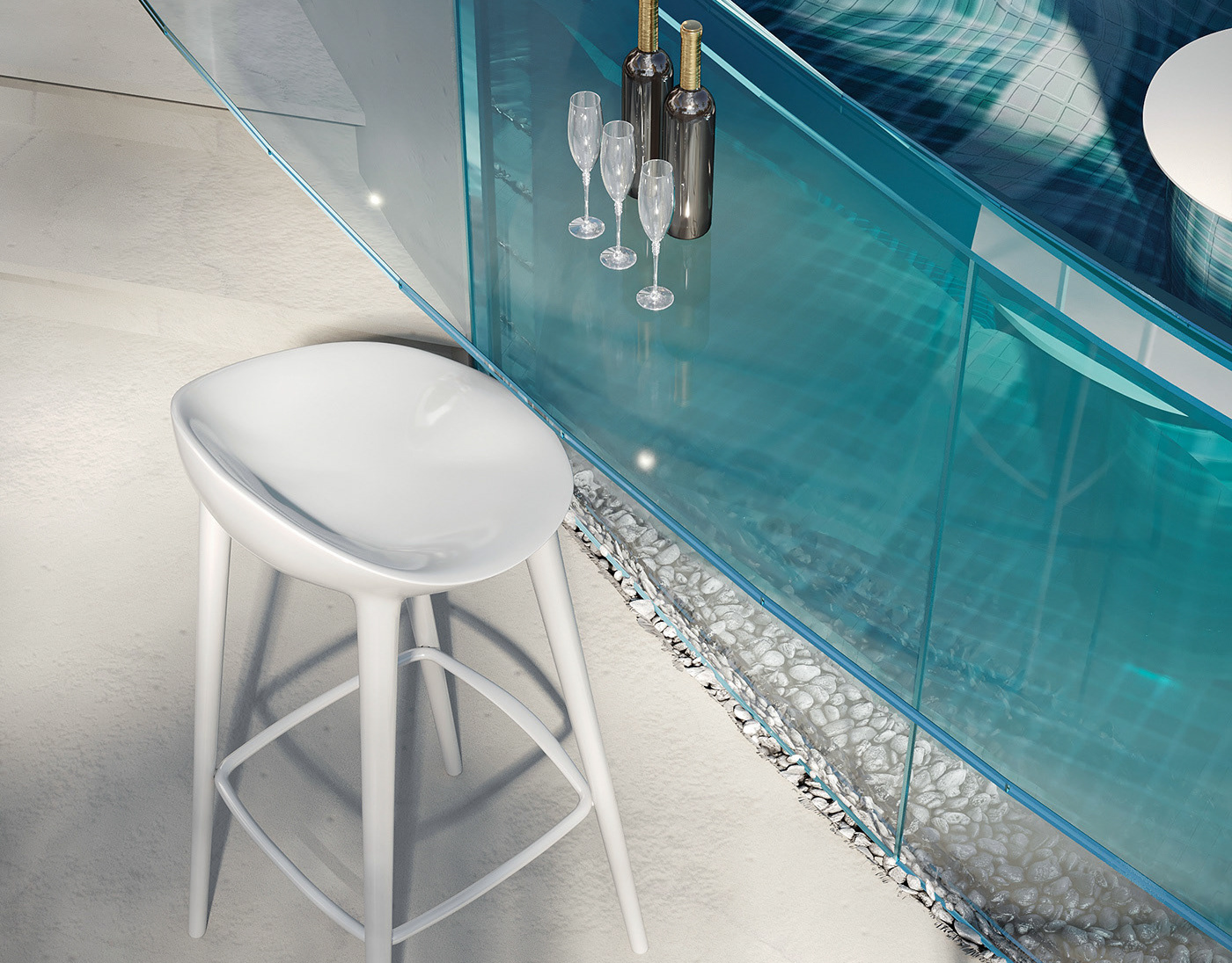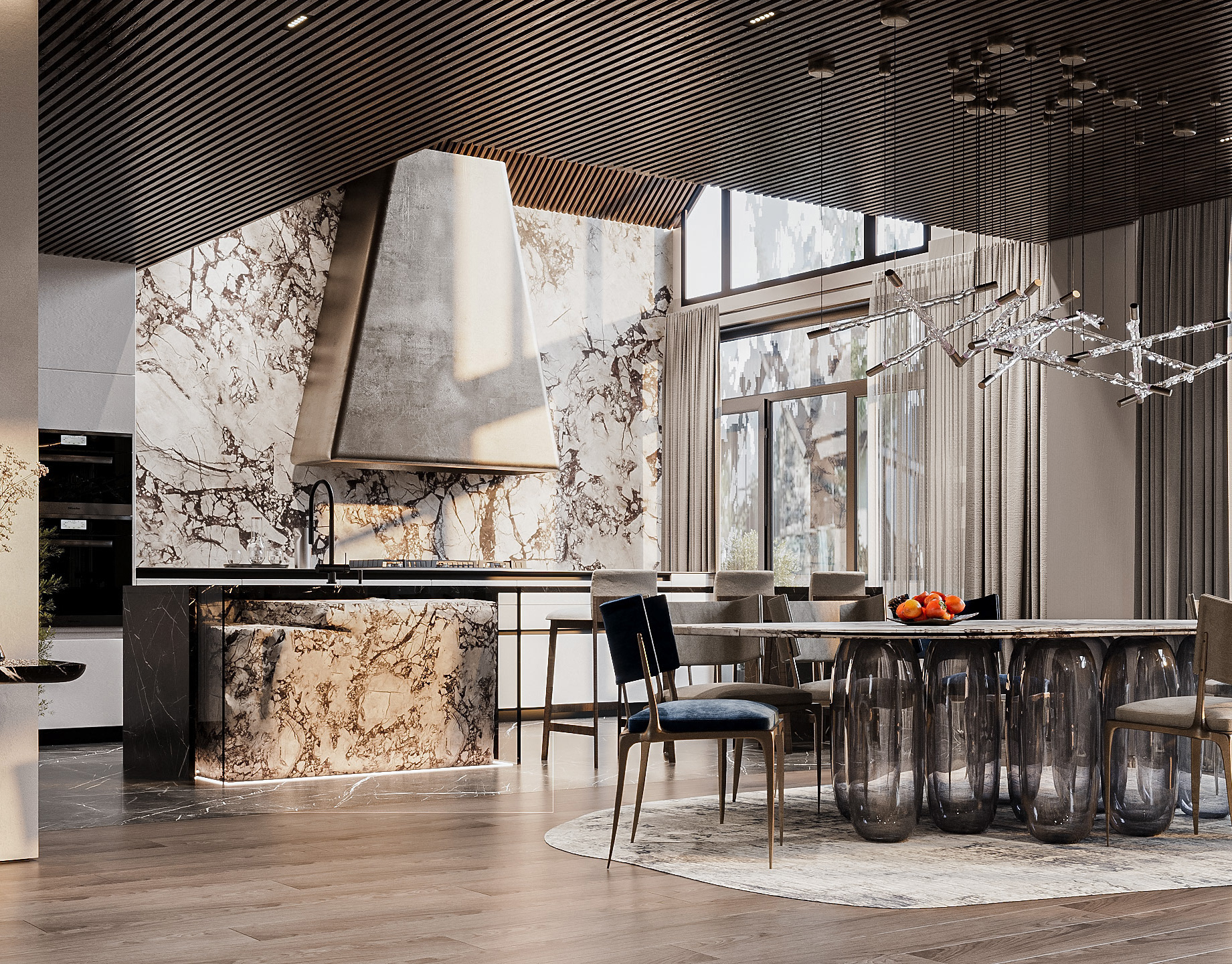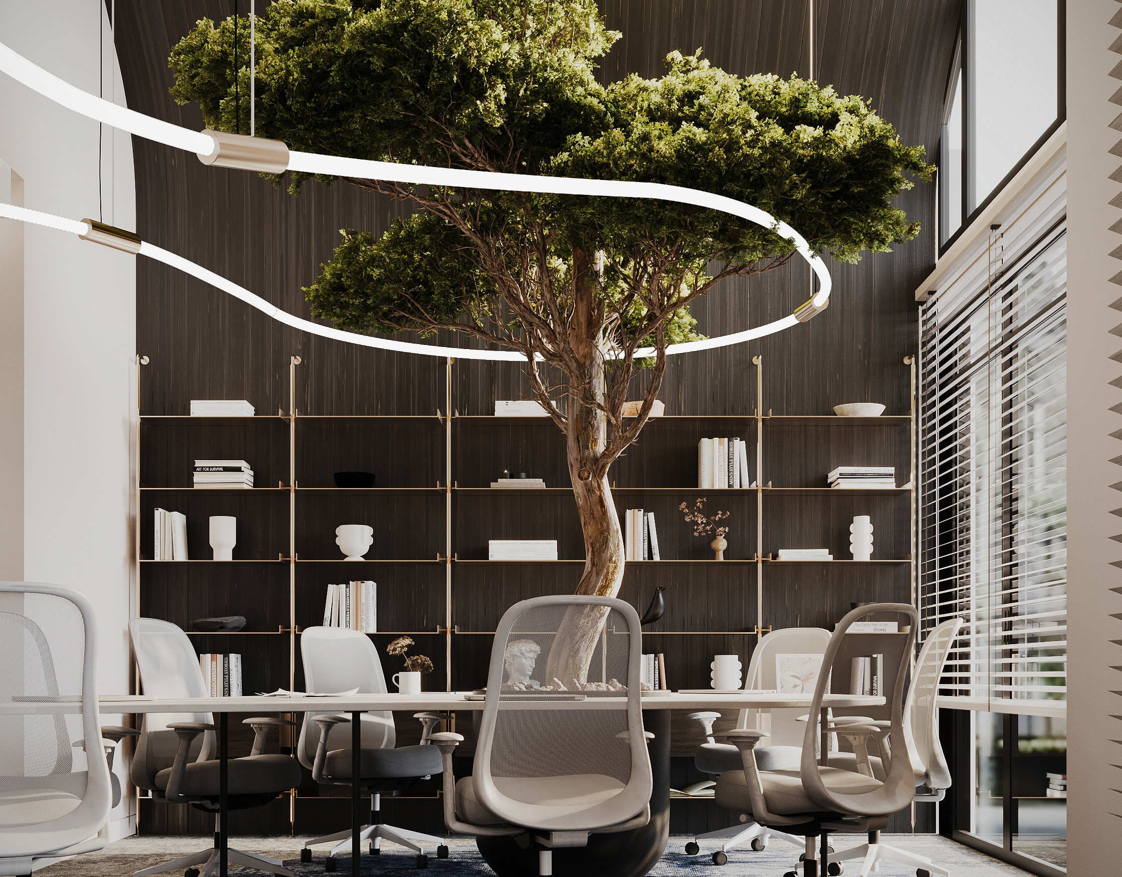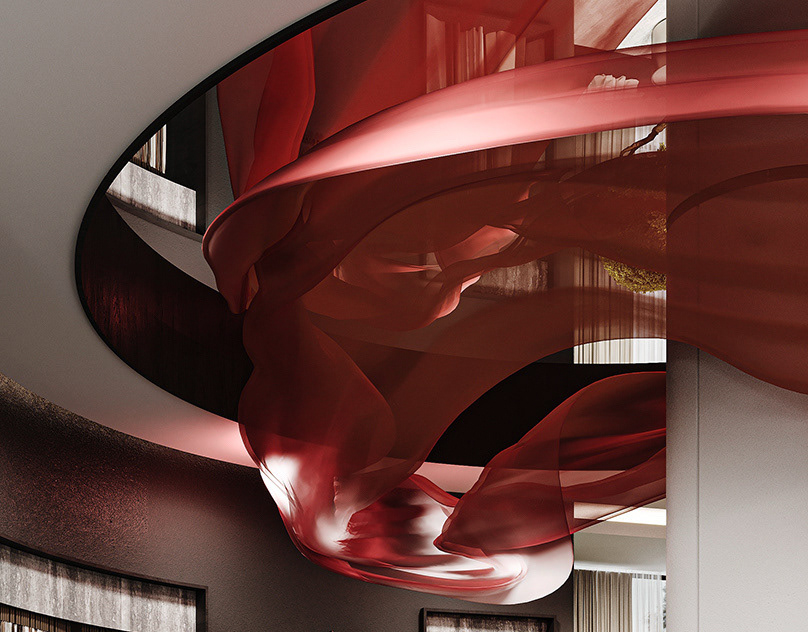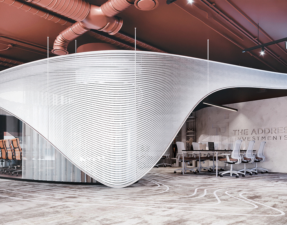 The core concept of the space is driven by the idea of a form-generating vertex, an imagined point in space pulled down from the ceiling to the ground. This gesture creates a fluid, down-bended ceiling that acts as a visual focal point and gives the space its unique identity.