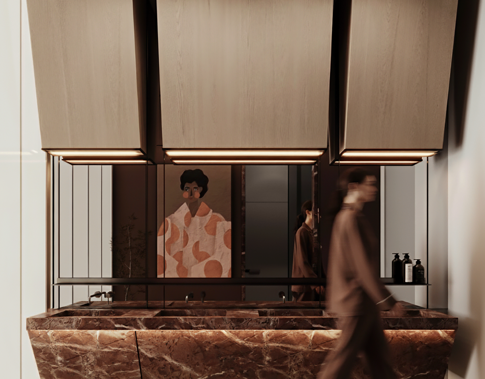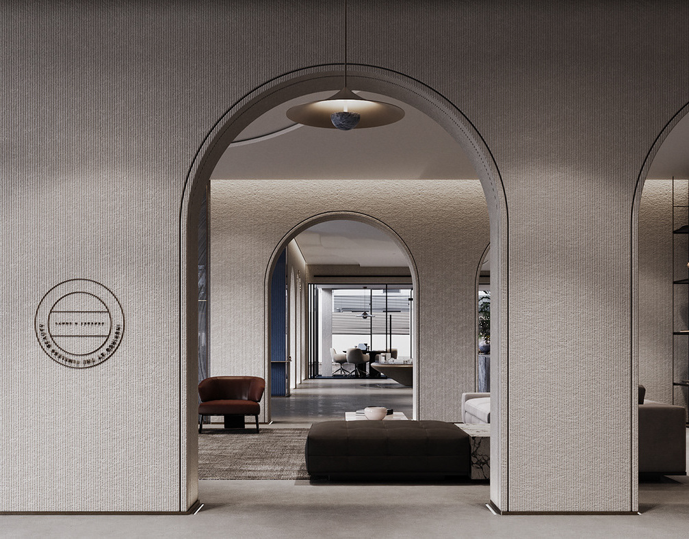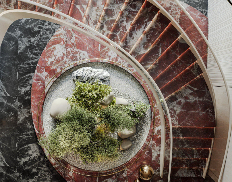 The journey begins at the entrance, where luxurious circular columns and high-end materials create an immediate sense of elegance. As visitors move through the showroom, they ascend a striking red marble staircase, symbolizing progression and discovery. The final destination is the chimney area, where a bronze fireplace adds warmth and coziness, completing the experience.