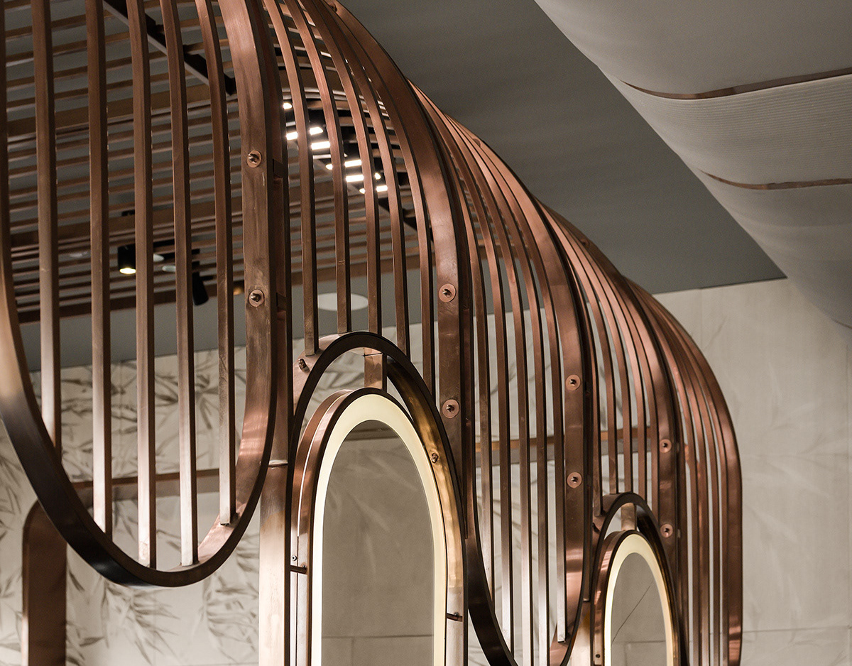 This sculptural form is then sliced to form the main lighting core, casting soft indirect light onto a display step directly beneath it. The interplay of ceiling curvature and lighting subtly guides the customer’s journey and creates moments of visual emphasis.