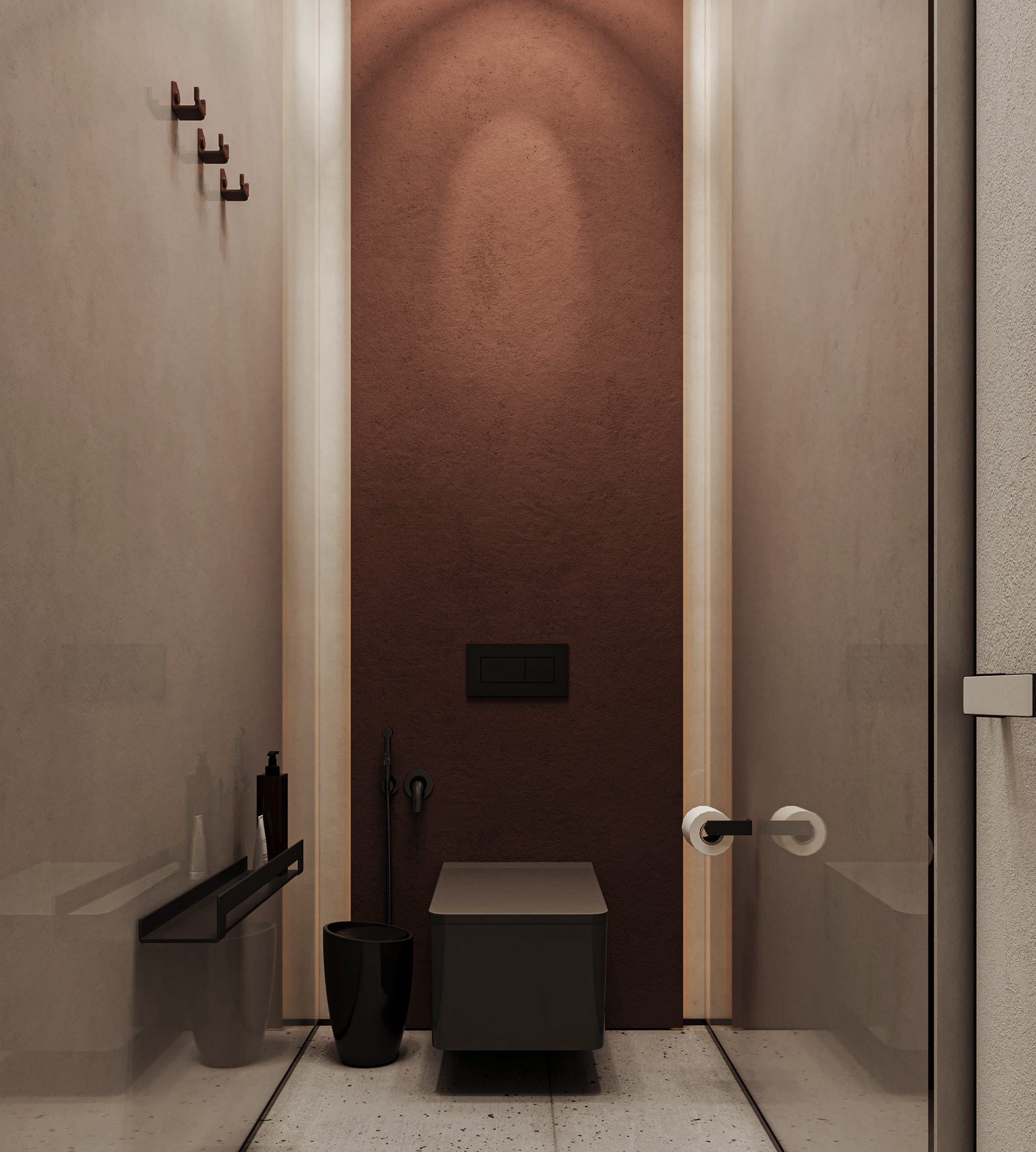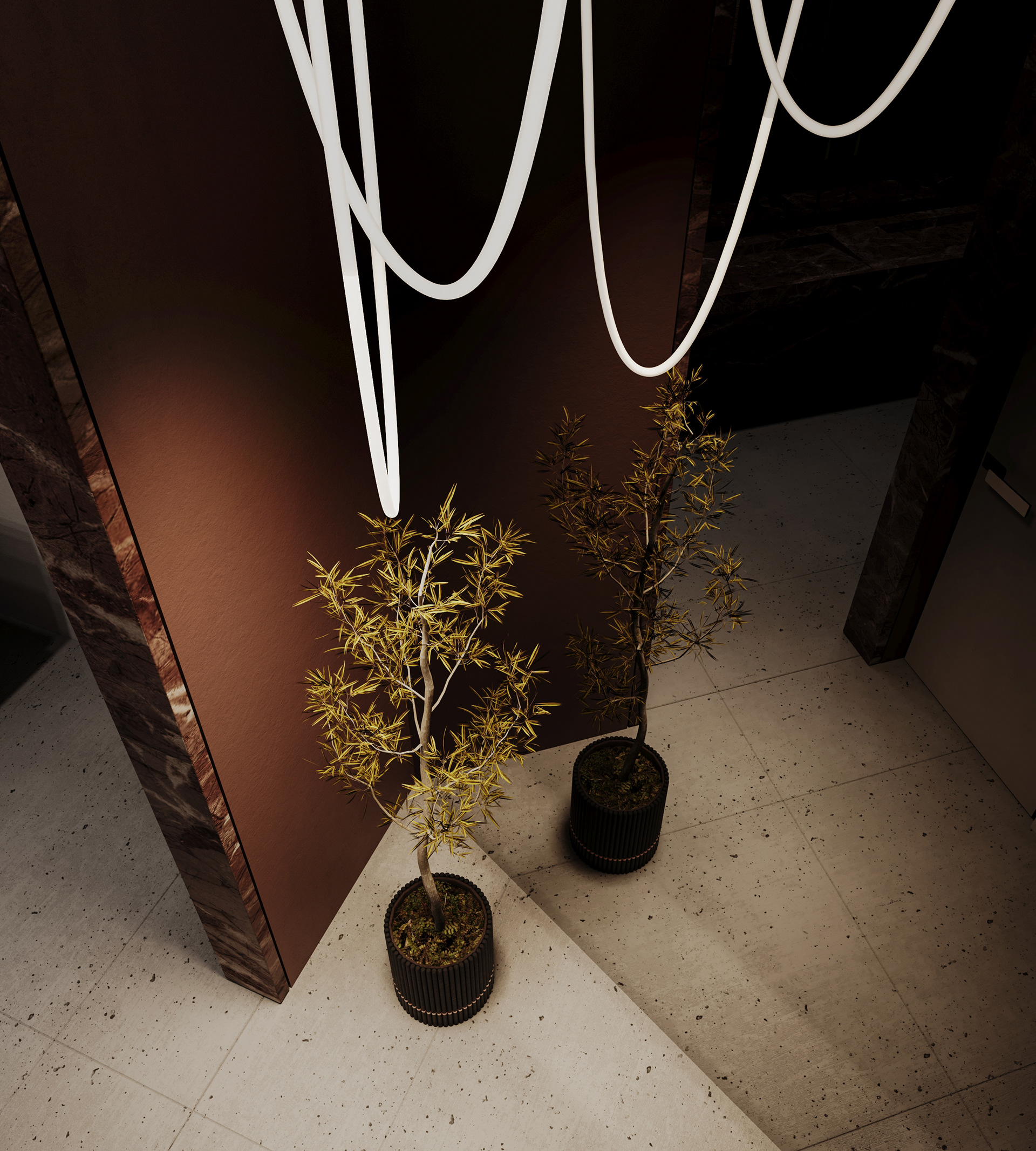The concept blends earthy elegance with artistic identity, creating a space that feels both luxurious and expressive.
