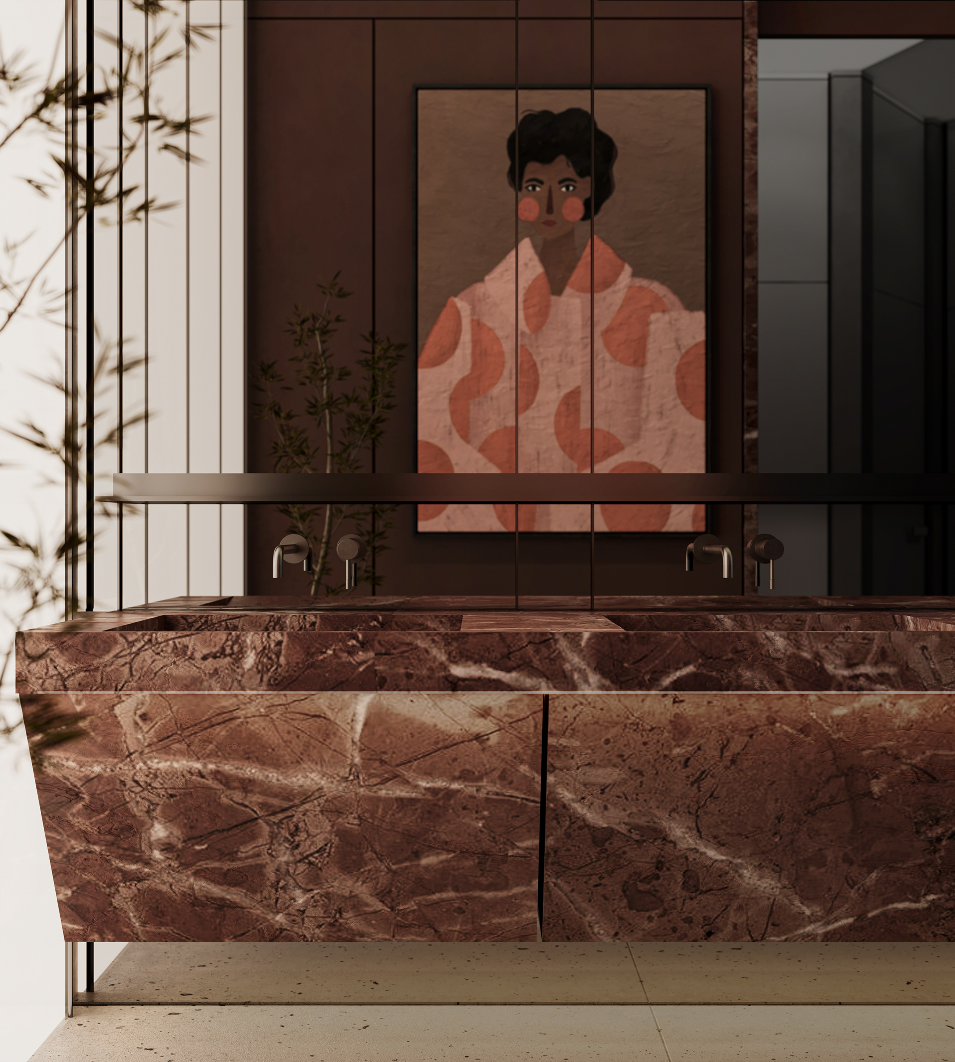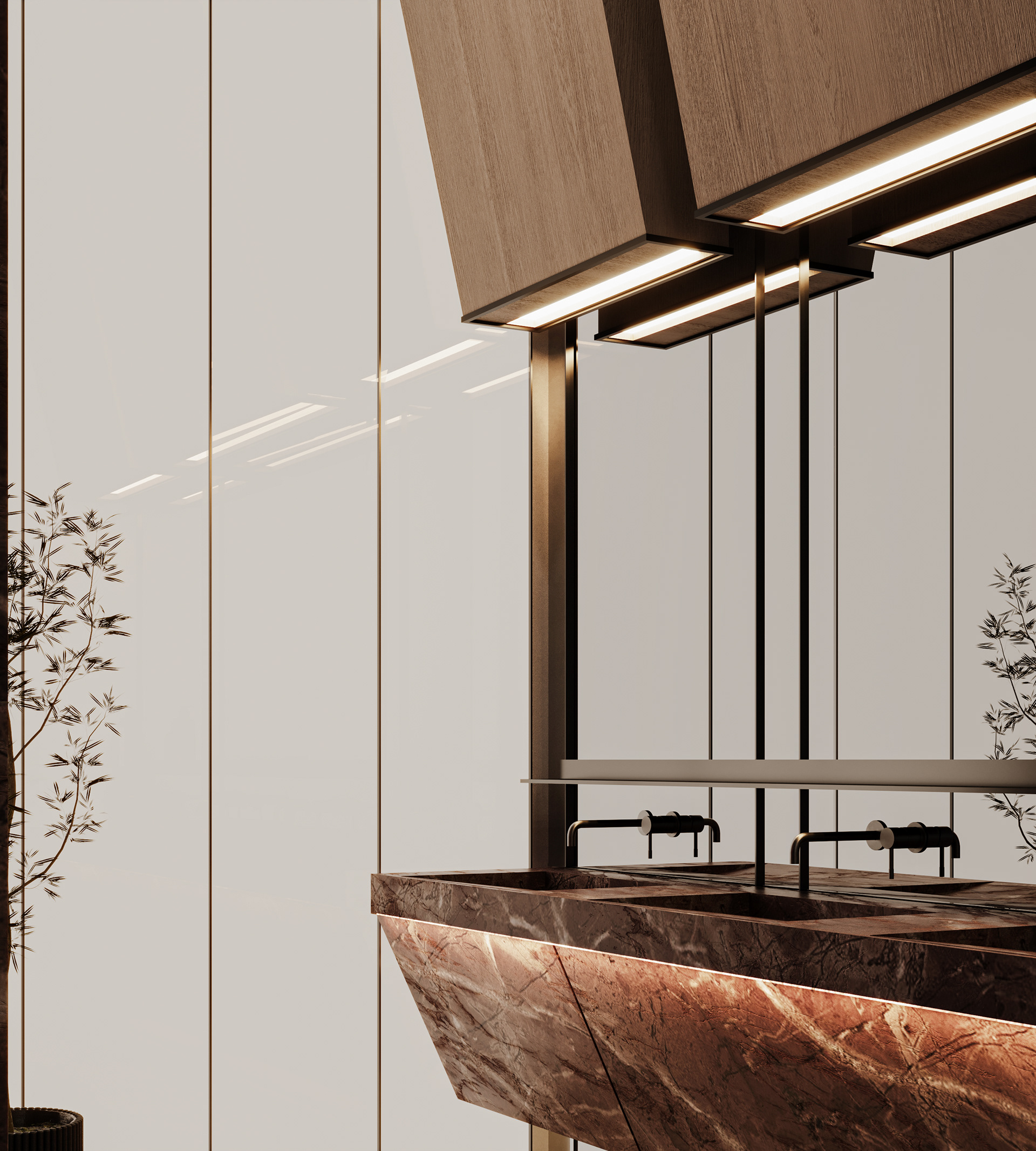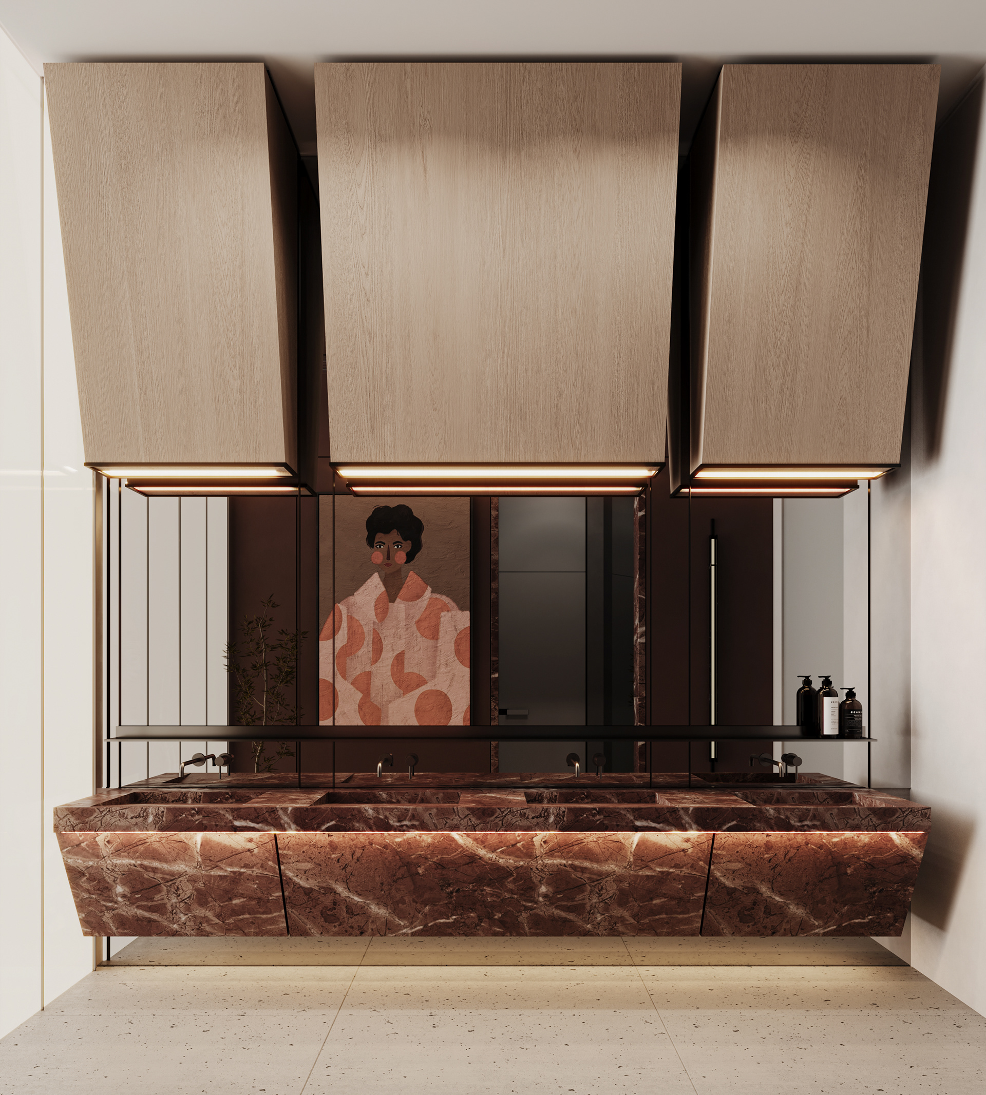 The design is anchored by warm red marble and muted beige tones, complemented by subtle lighting that enhances the depth and material richness of the surfaces. The floating marble vanity with integrated lighting creates a sense of sophistication and visual lightness, while the wooden upper cabinets add natural warmth and texture.