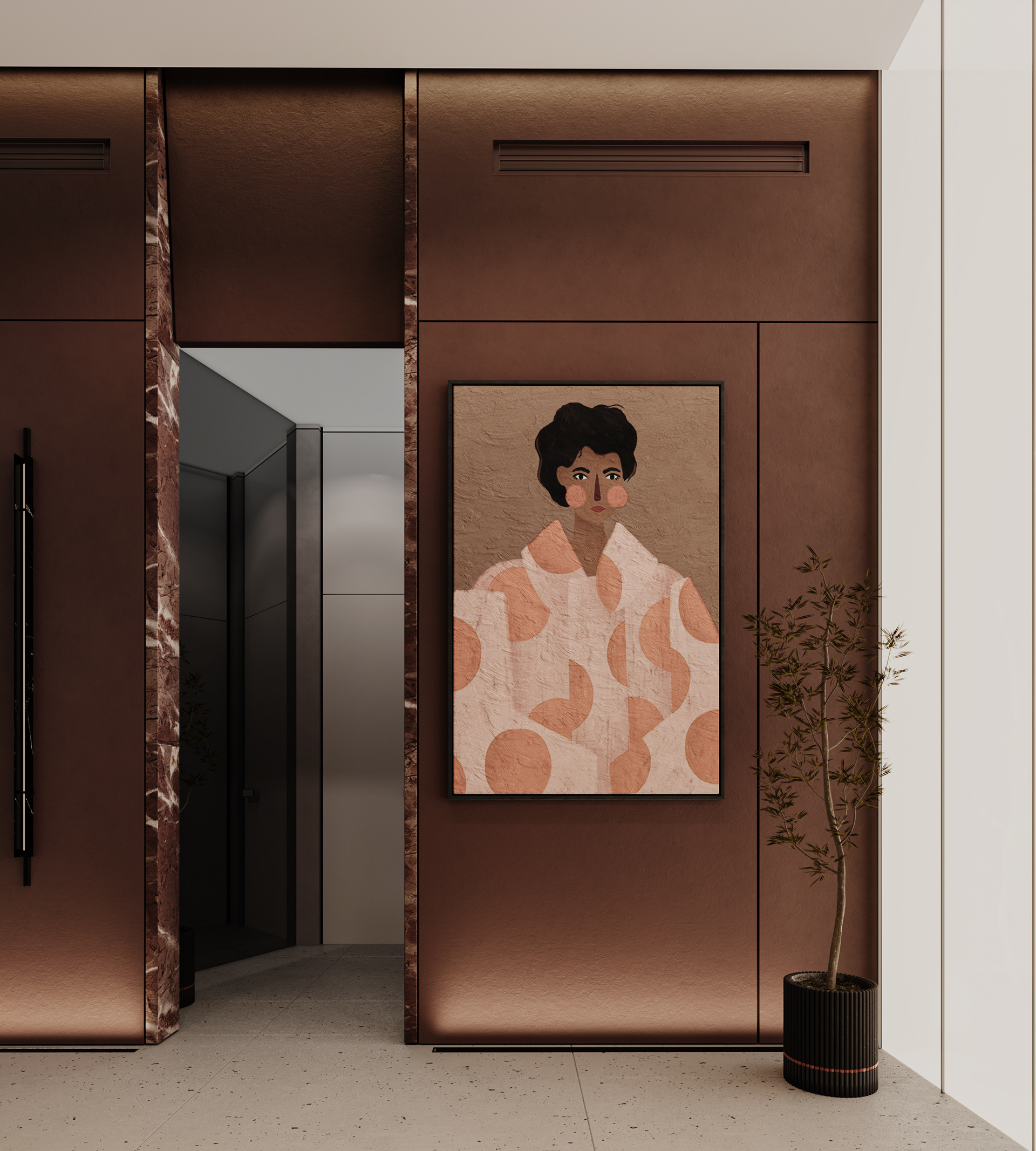 A key focal point of the space is the artwork featuring a stylized human portrait, introducing a cultural and emotional layer to the environment. This artistic touch transforms a functional zone into a space of aesthetic contemplation and visual comfort.