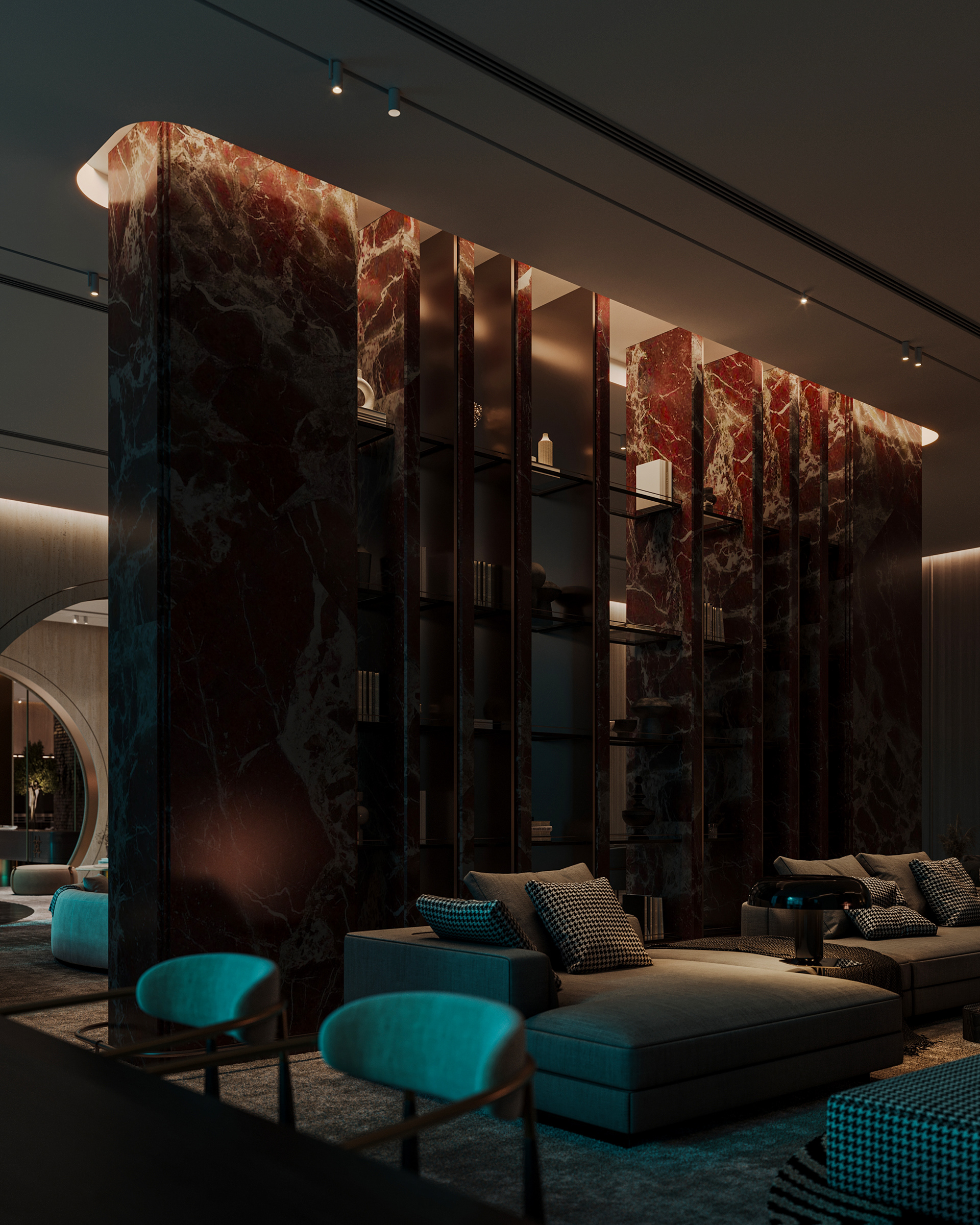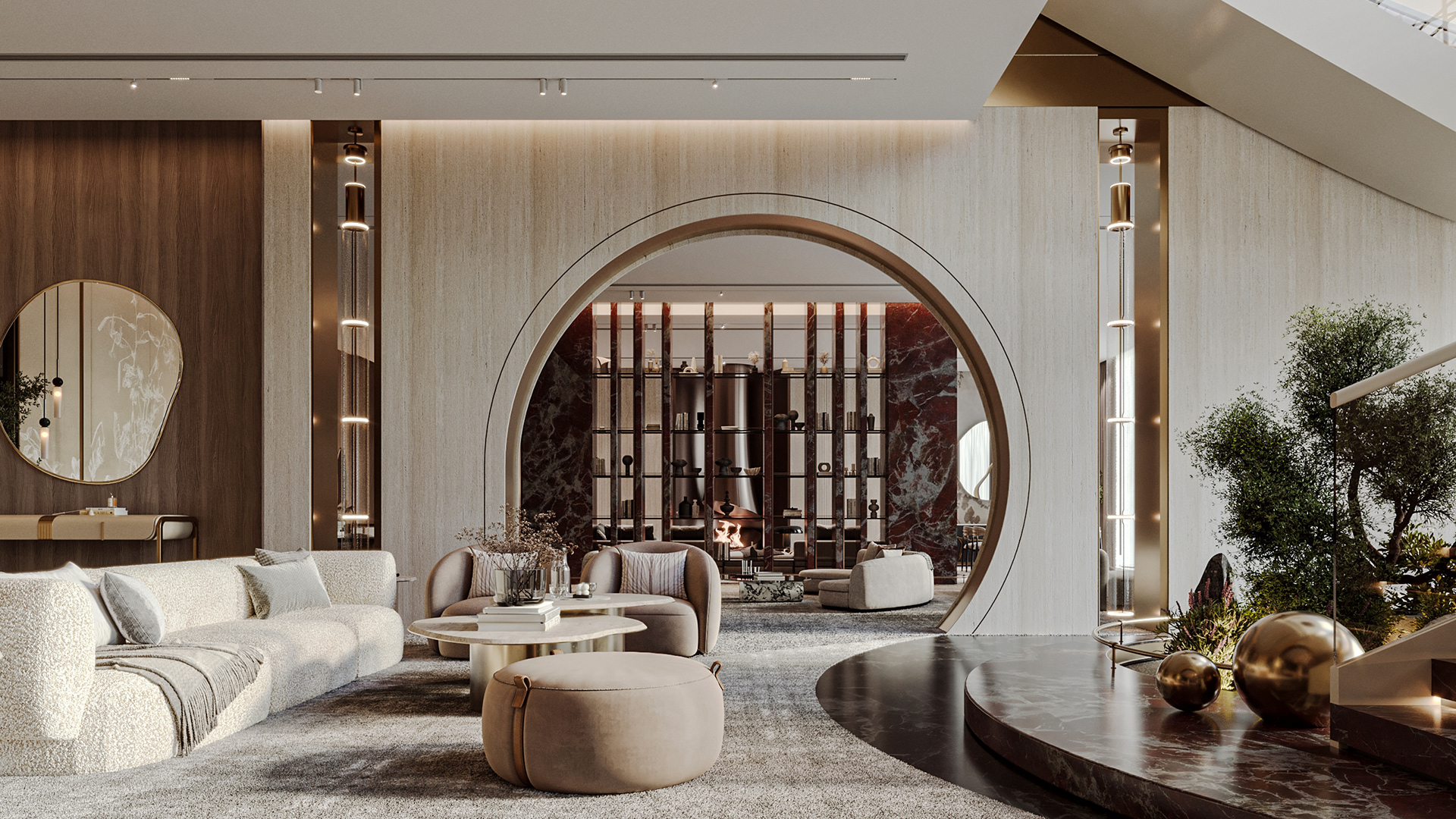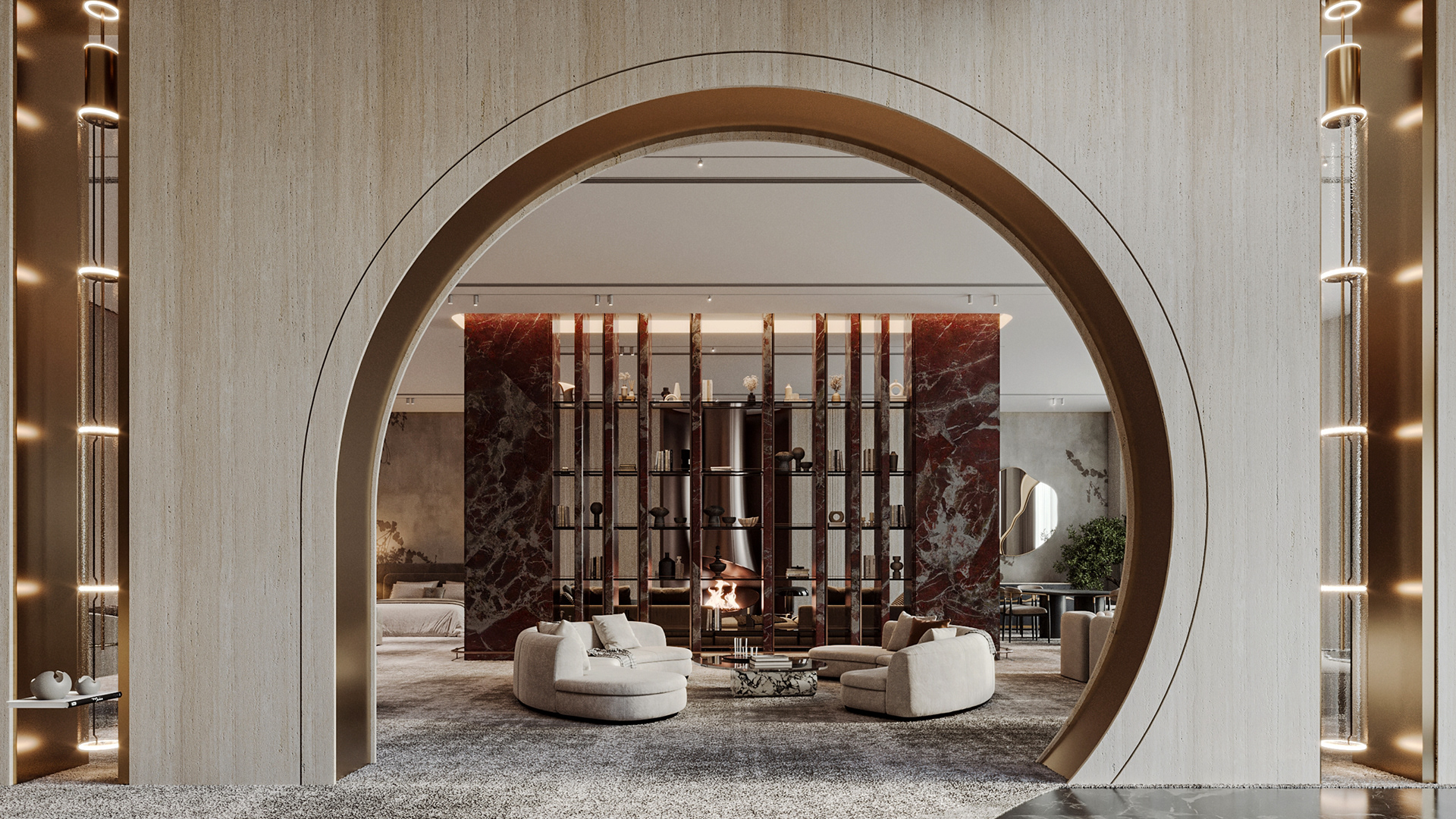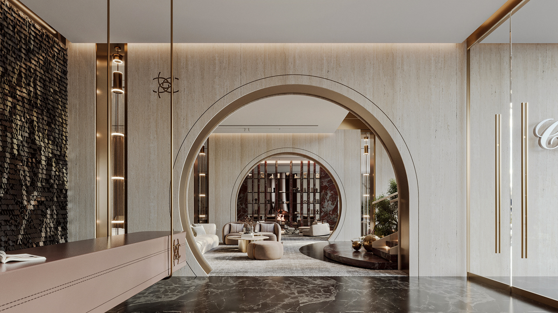 The journey begins at the entrance, where luxurious circular columns and high-end materials create an immediate sense of elegance. As visitors move through the showroom, they ascend a striking red marble staircase, symbolizing progression and discovery. The final destination is the chimney area, where a bronze fireplace adds warmth and coziness, completing the experience.