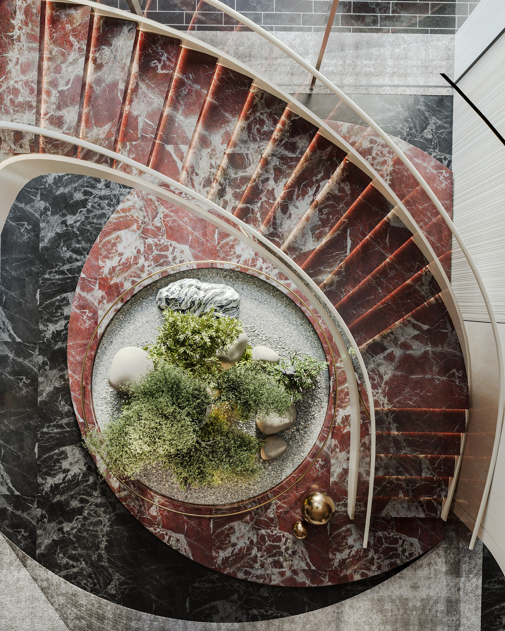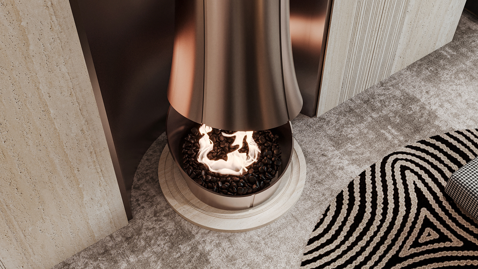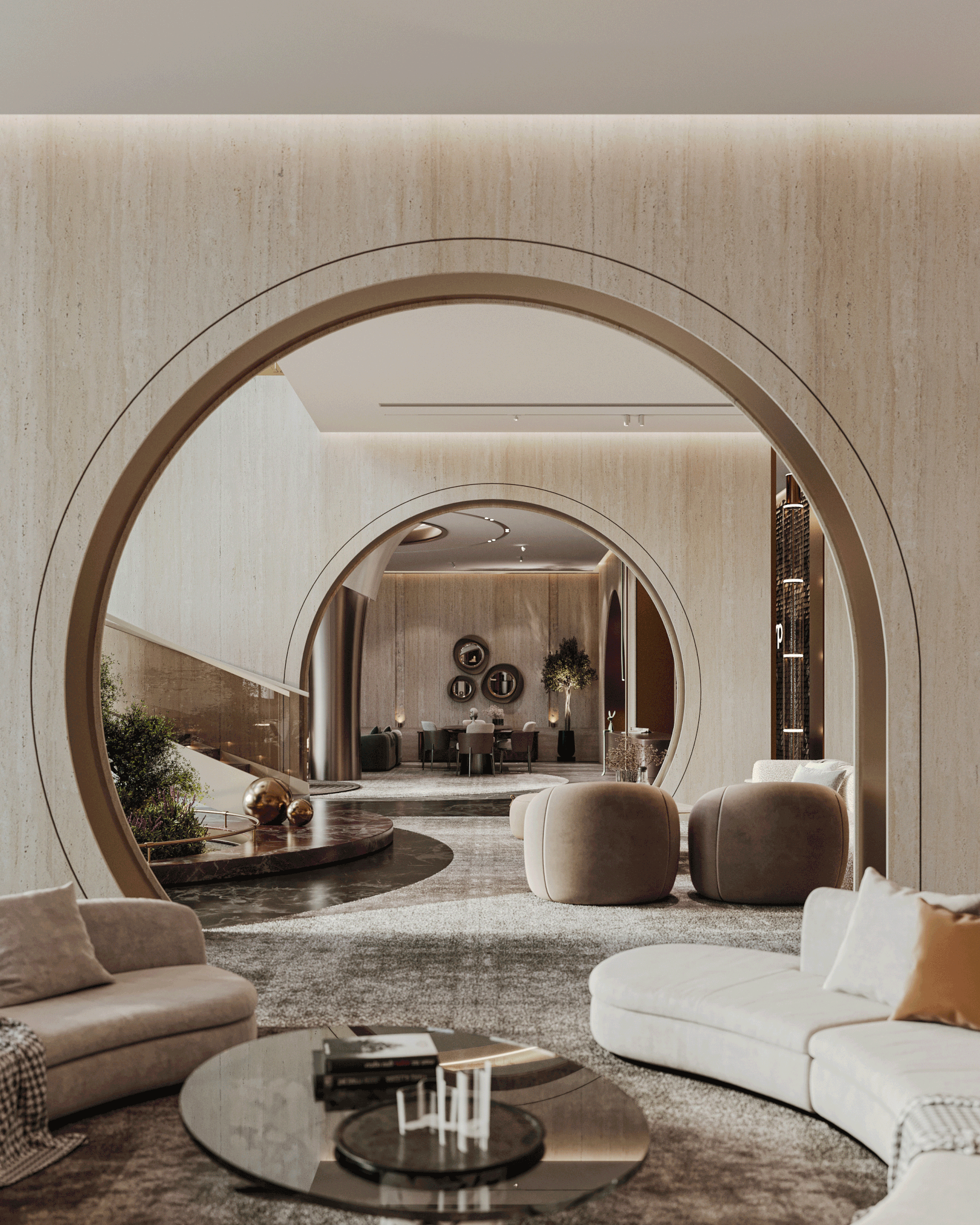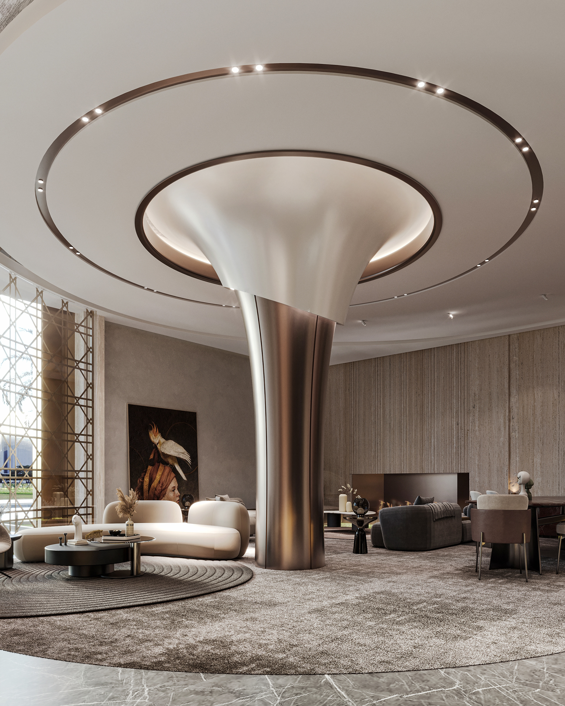 The journey begins at the entrance, where luxurious circular columns and high-end materials create an immediate sense of elegance. As visitors move through the showroom, they ascend a striking red marble staircase, symbolizing progression and discovery. The final destination is the chimney area, where a bronze fireplace adds warmth and coziness, completing the experience.