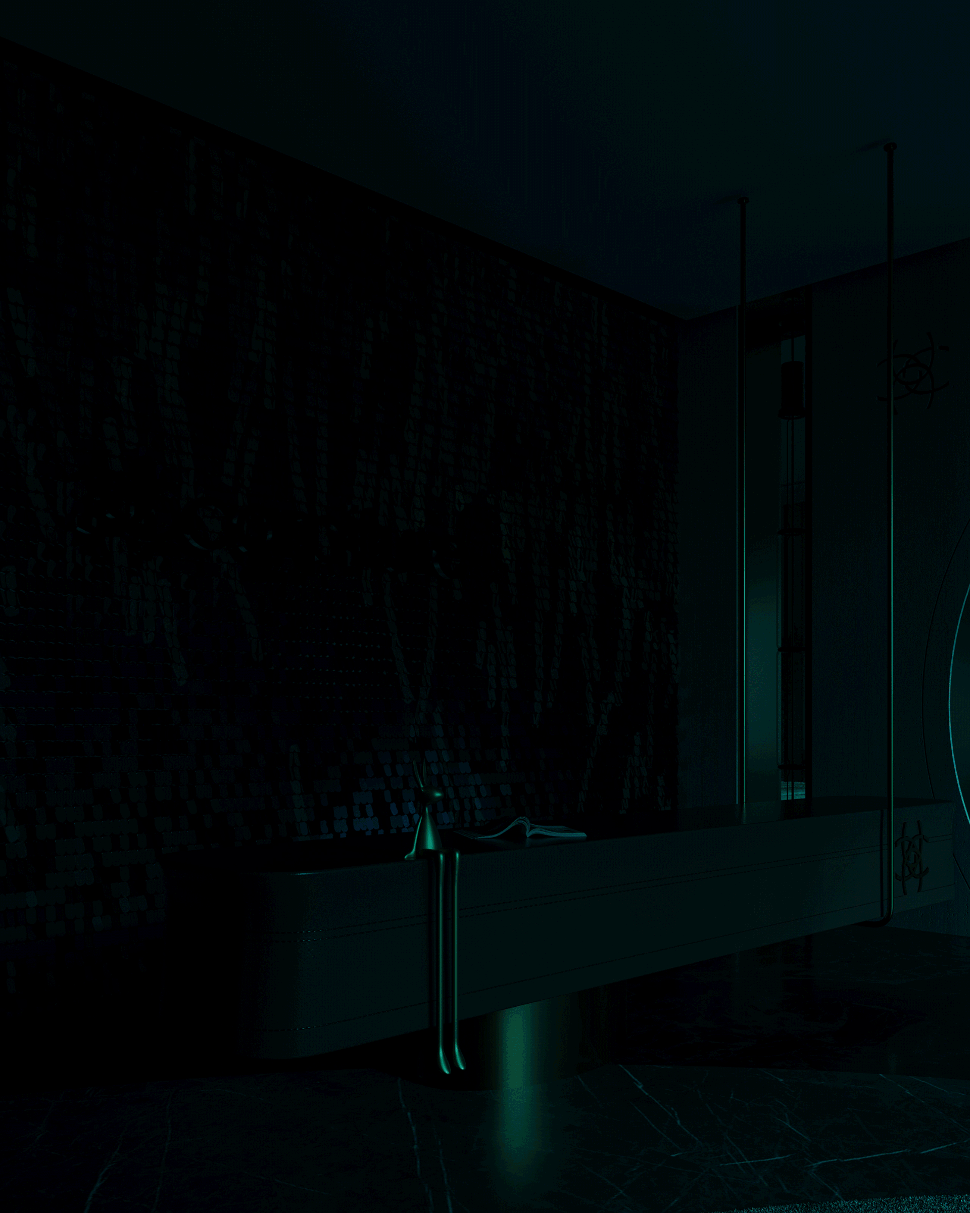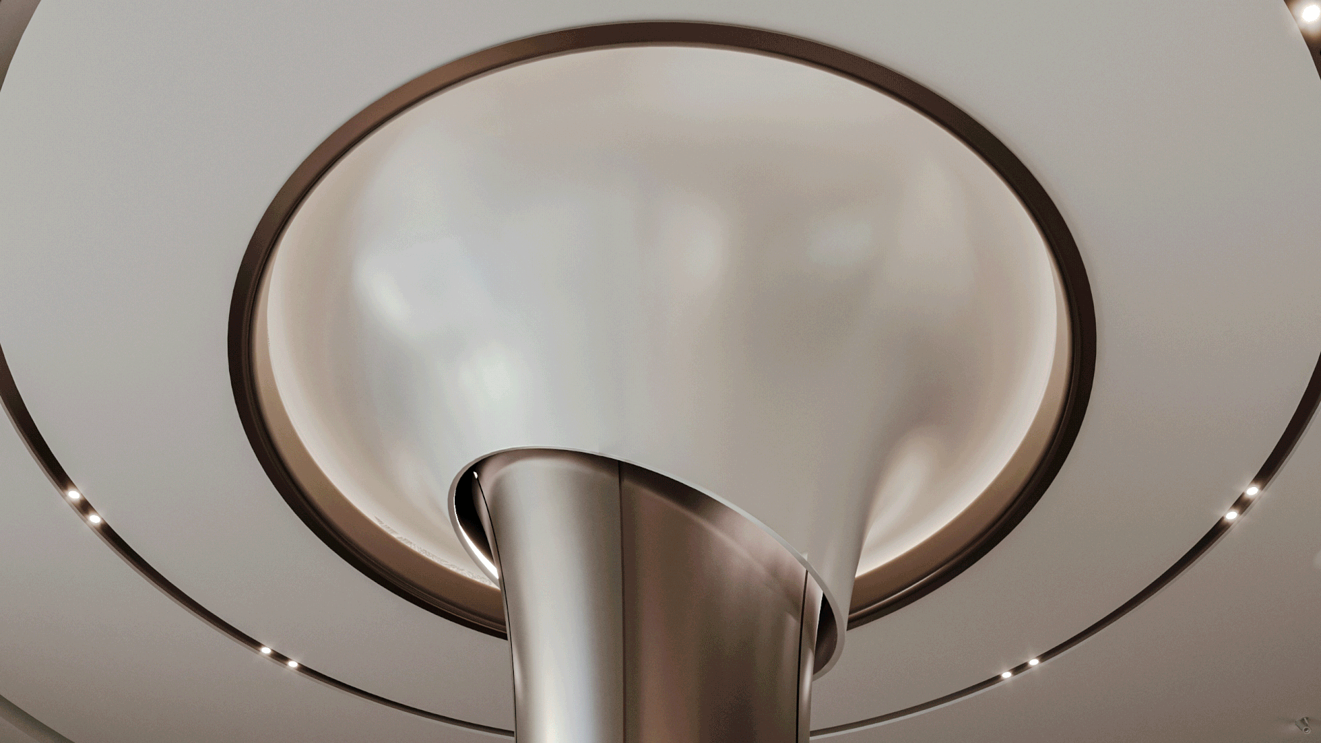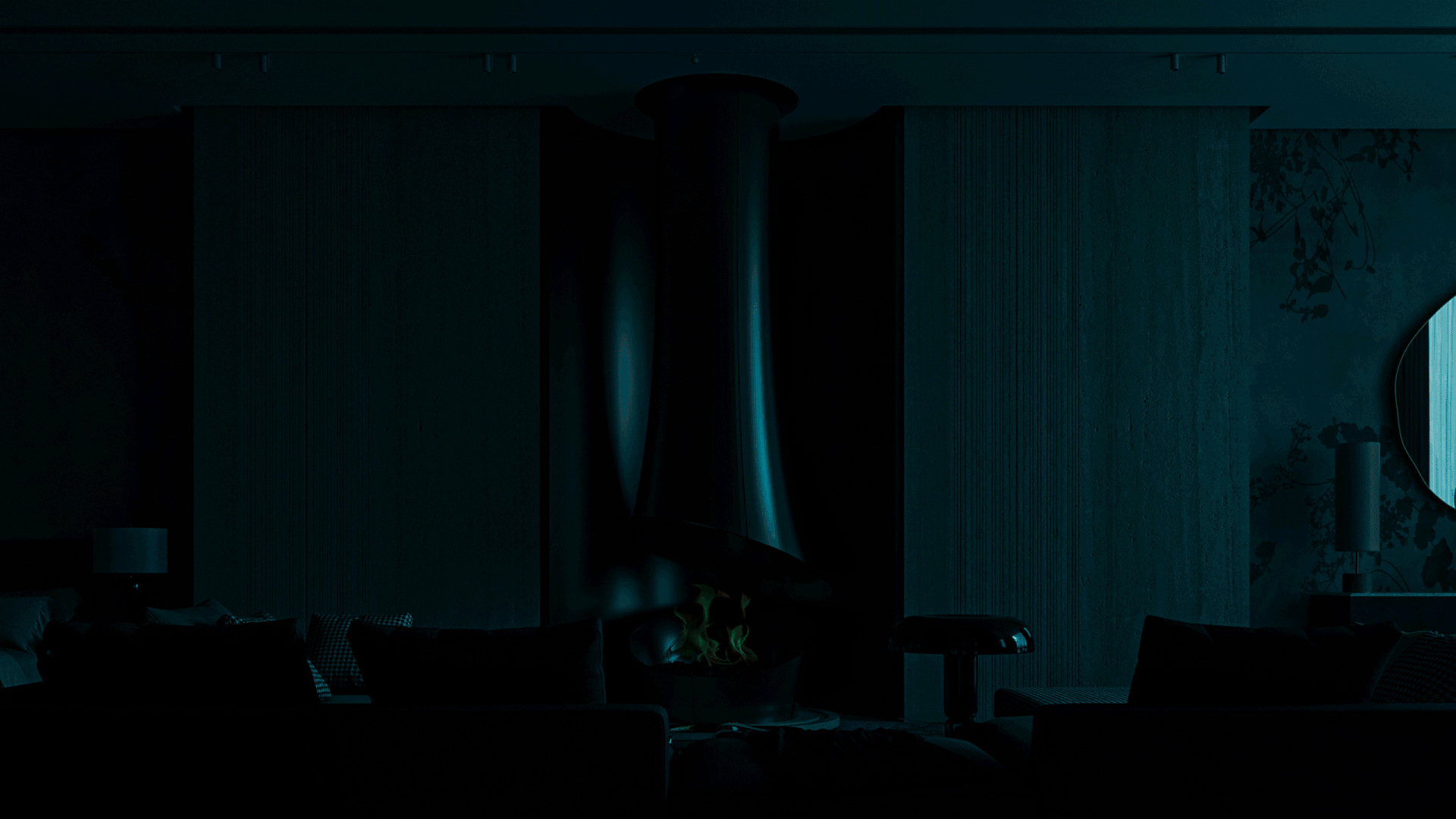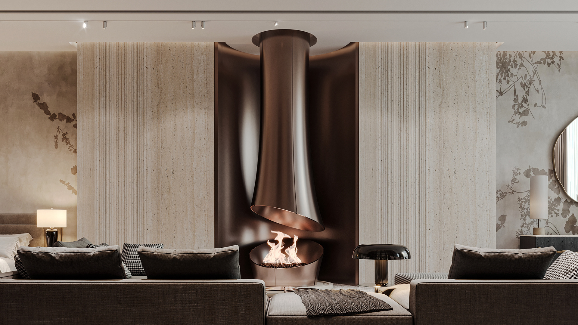 The journey begins at the entrance, where luxurious circular columns and high-end materials create an immediate sense of elegance. As visitors move through the showroom, they ascend a striking red marble staircase, symbolizing progression and discovery. The final destination is the chimney area, where a bronze fireplace adds warmth and coziness, completing the experience.