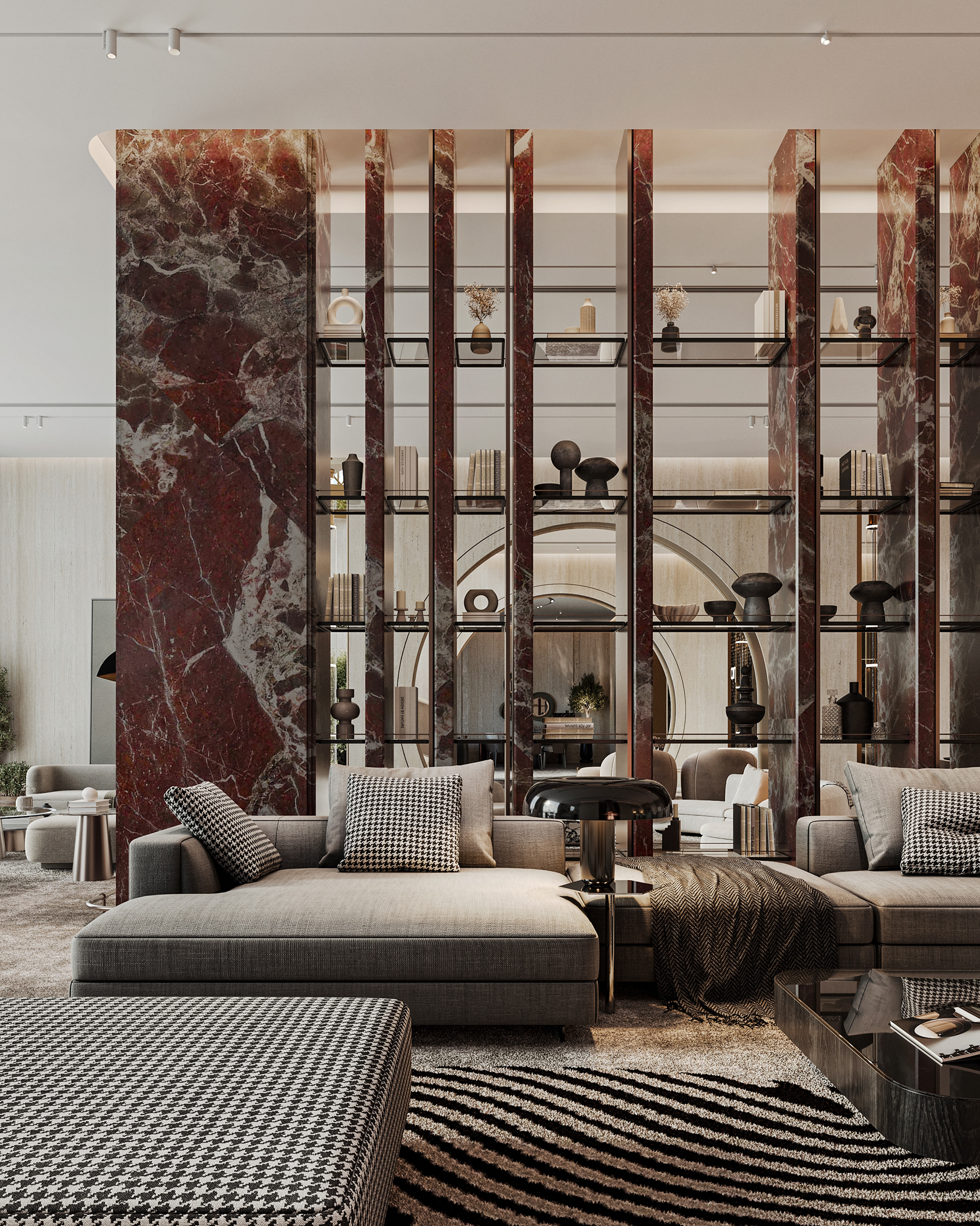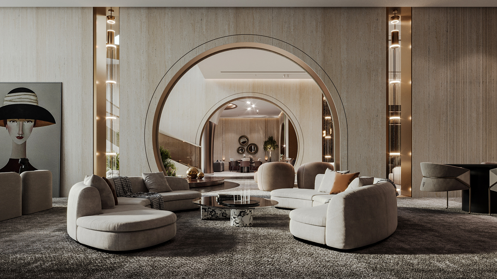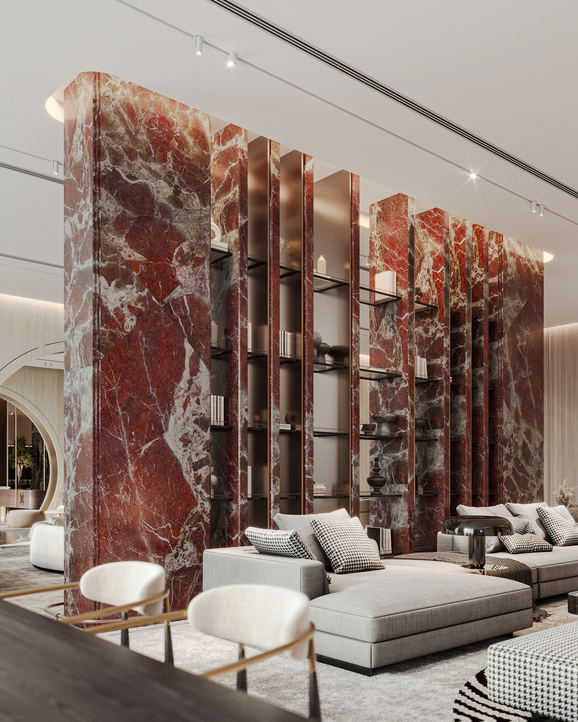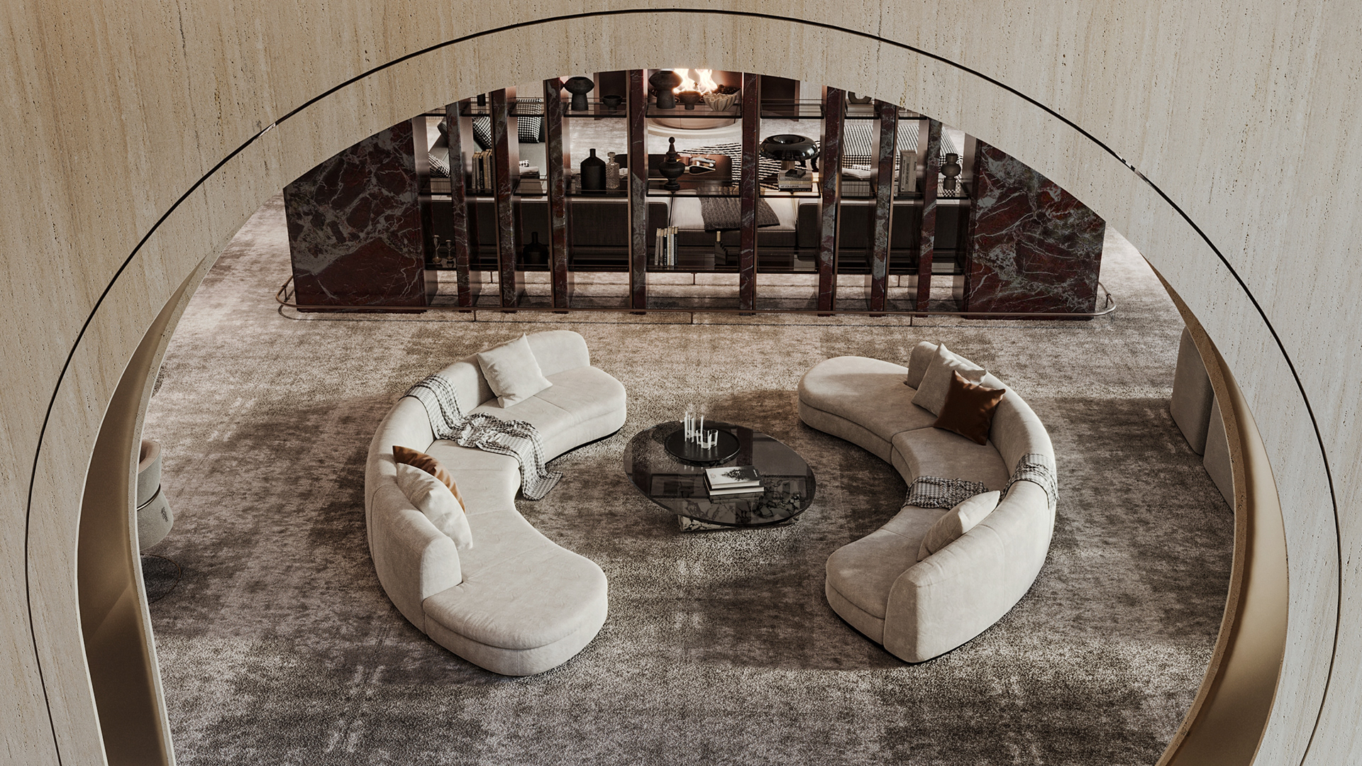 Carpiture furniture showroom (C.F.S), a furniture showroom located in Sheikh Zayed, Cairo, is designed to reflect the human journey through the universe, using the moon as its guiding concept. This theme is expressed through three key areas: the entrance, the staircase, and the chimney, each represented by a circular, moon-like form. The journey begins at the entrance, where luxurious circular columns and high-end materials create an immediate sense of elegance. As visitors move through the showroom, they ascend a striking red marble staircase, symbolizing progression and discovery. The final destination is the chimney area, where a bronze fireplace adds warmth and coziness, completing the experience. This design beautifully aligns with the brand’s vision of combining luxury with a narrative journey, making each step through the showroom a unique experience.