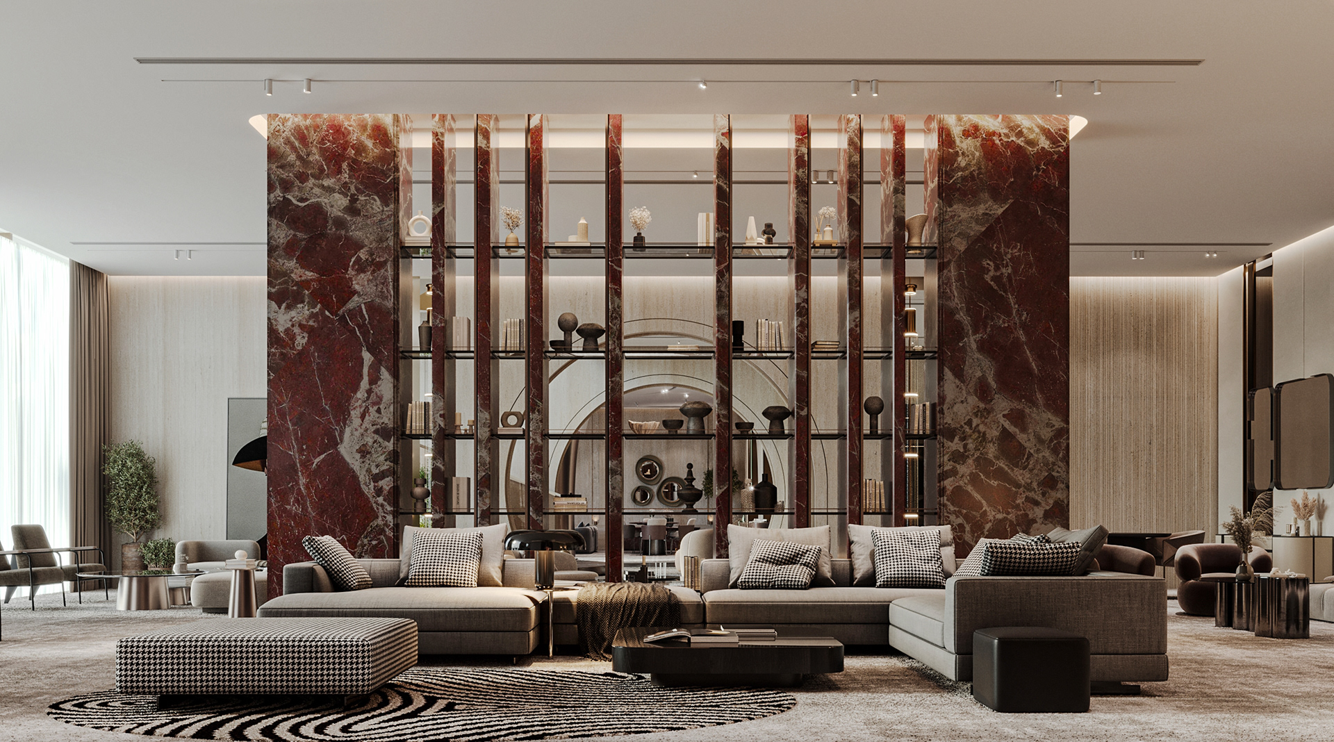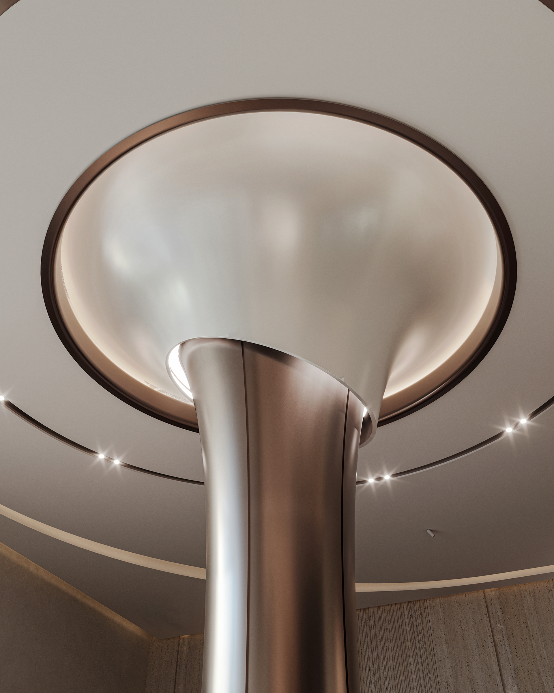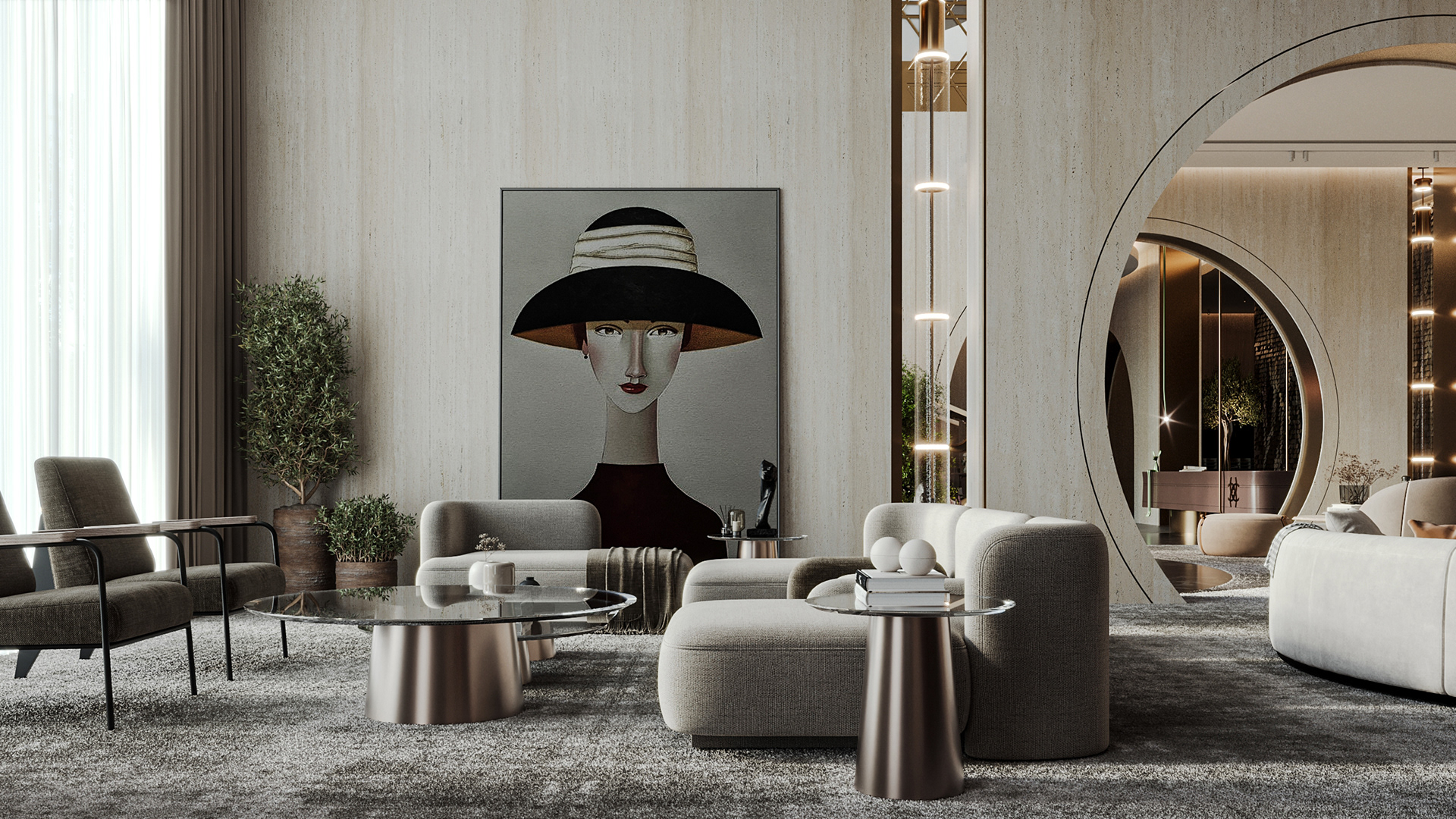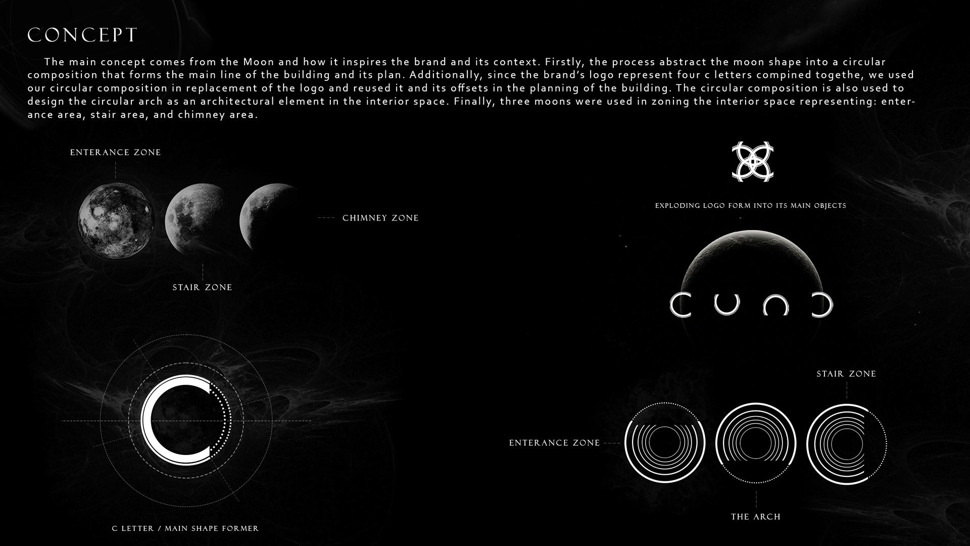 Carpiture furniture showroom (C.F.S), a furniture showroom located in Sheikh Zayed, Cairo, is designed to reflect the human journey through the universe, using the moon as its guiding concept. This theme is expressed through three key areas: the entrance, the staircase, and the chimney, each represented by a circular, moon-like form. The journey begins at the entrance, where luxurious circular columns and high-end materials create an immediate sense of elegance. As visitors move through the showroom, they ascend a striking red marble staircase, symbolizing progression and discovery. The final destination is the chimney area, where a bronze fireplace adds warmth and coziness, completing the experience. This design beautifully aligns with the brand’s vision of combining luxury with a narrative journey, making each step through the showroom a unique experience.