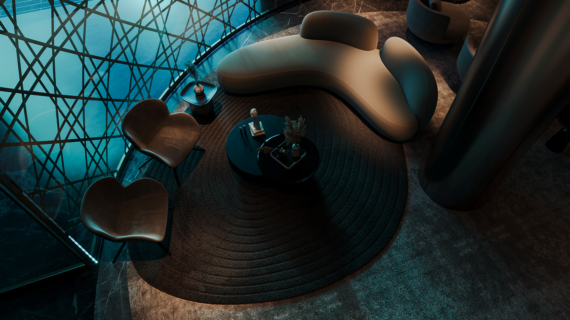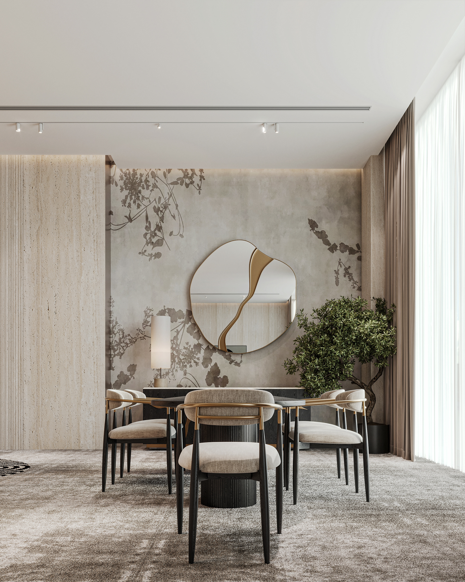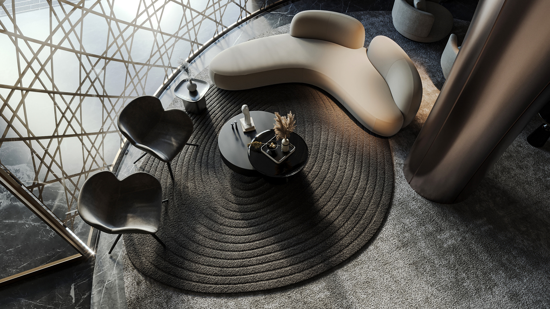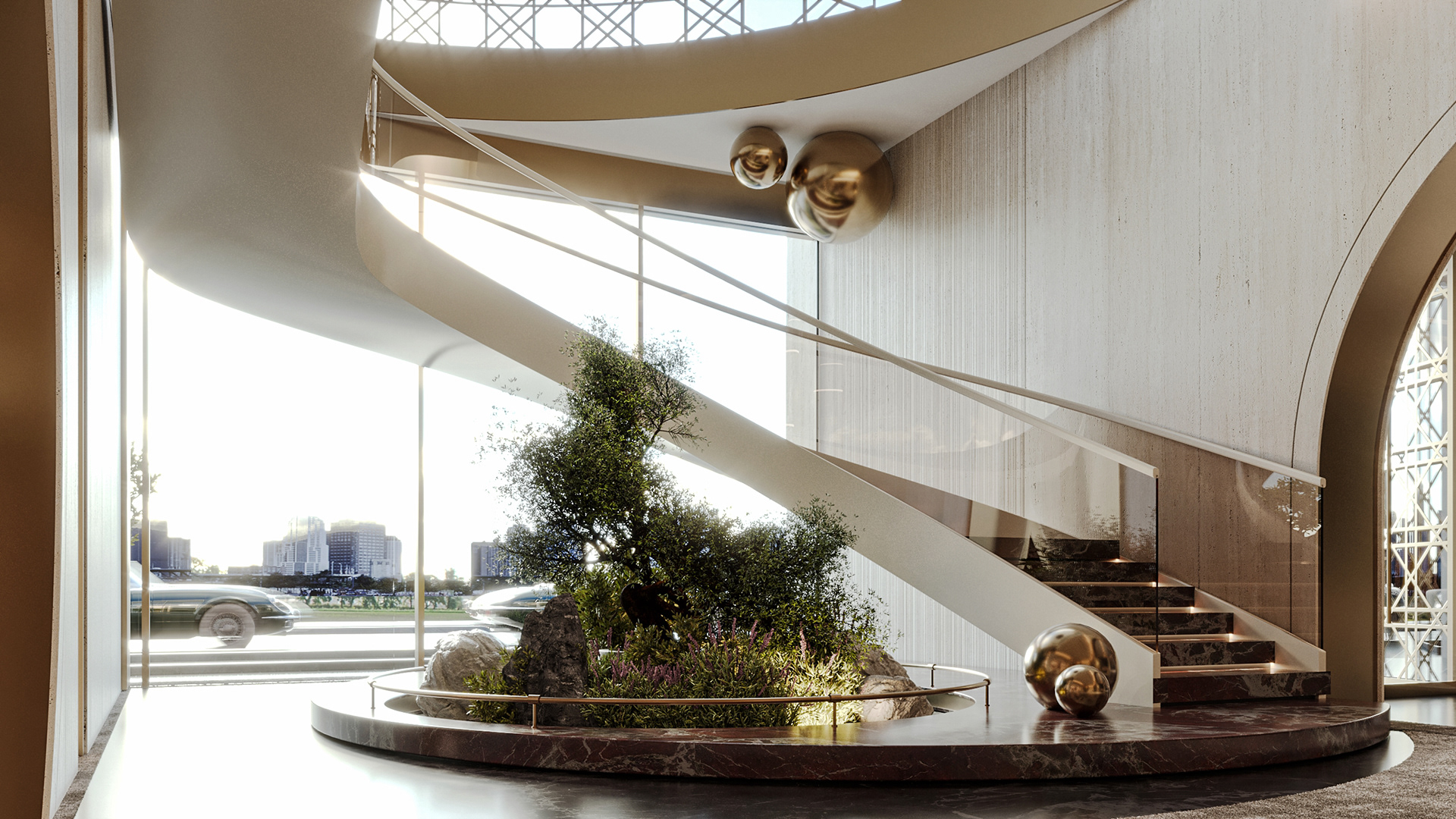 Carpiture furniture showroom (C.F.S), a furniture showroom located in Sheikh Zayed, Cairo, is designed to reflect the human journey through the universe, using the moon as its guiding concept. This theme is expressed through three key areas: the entrance, the staircase, and the chimney, each represented by a circular, moon-like form. The journey begins at the entrance, where luxurious circular columns and high-end materials create an immediate sense of elegance. As visitors move through the showroom, they ascend a striking red marble staircase, symbolizing progression and discovery. The final destination is the chimney area, where a bronze fireplace adds warmth and coziness, completing the experience. This design beautifully aligns with the brand’s vision of combining luxury with a narrative journey, making each step through the showroom a unique experience.