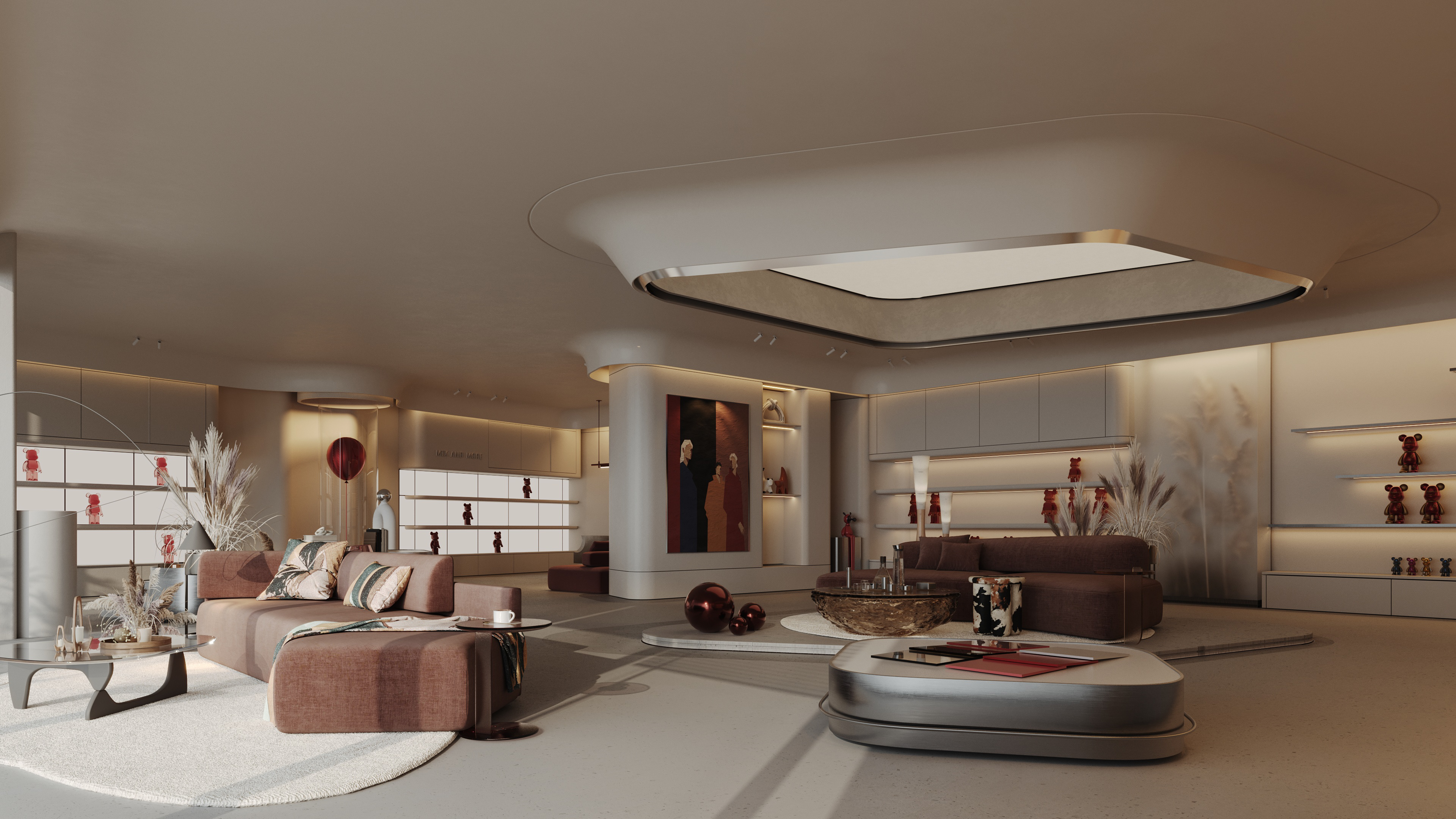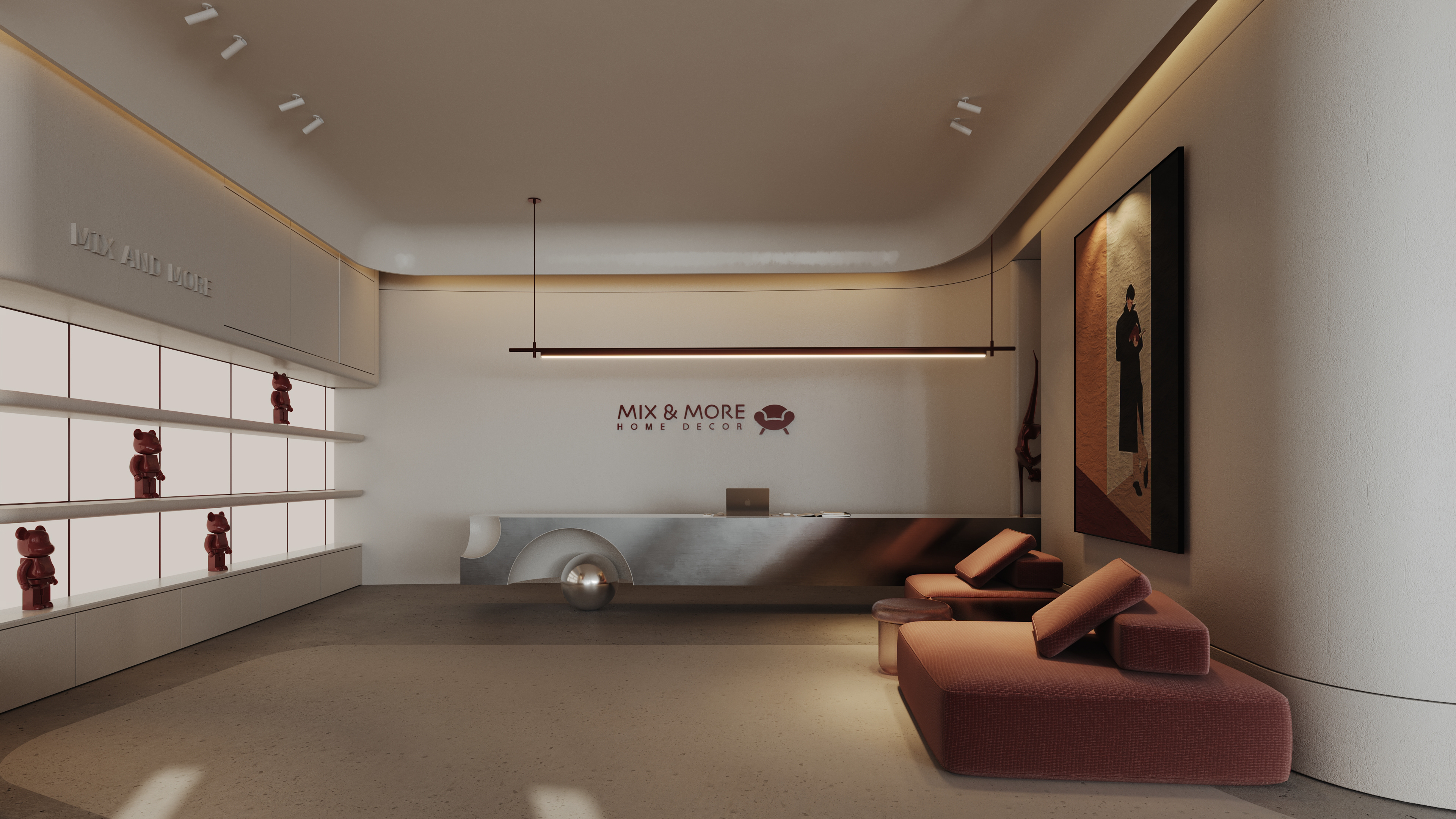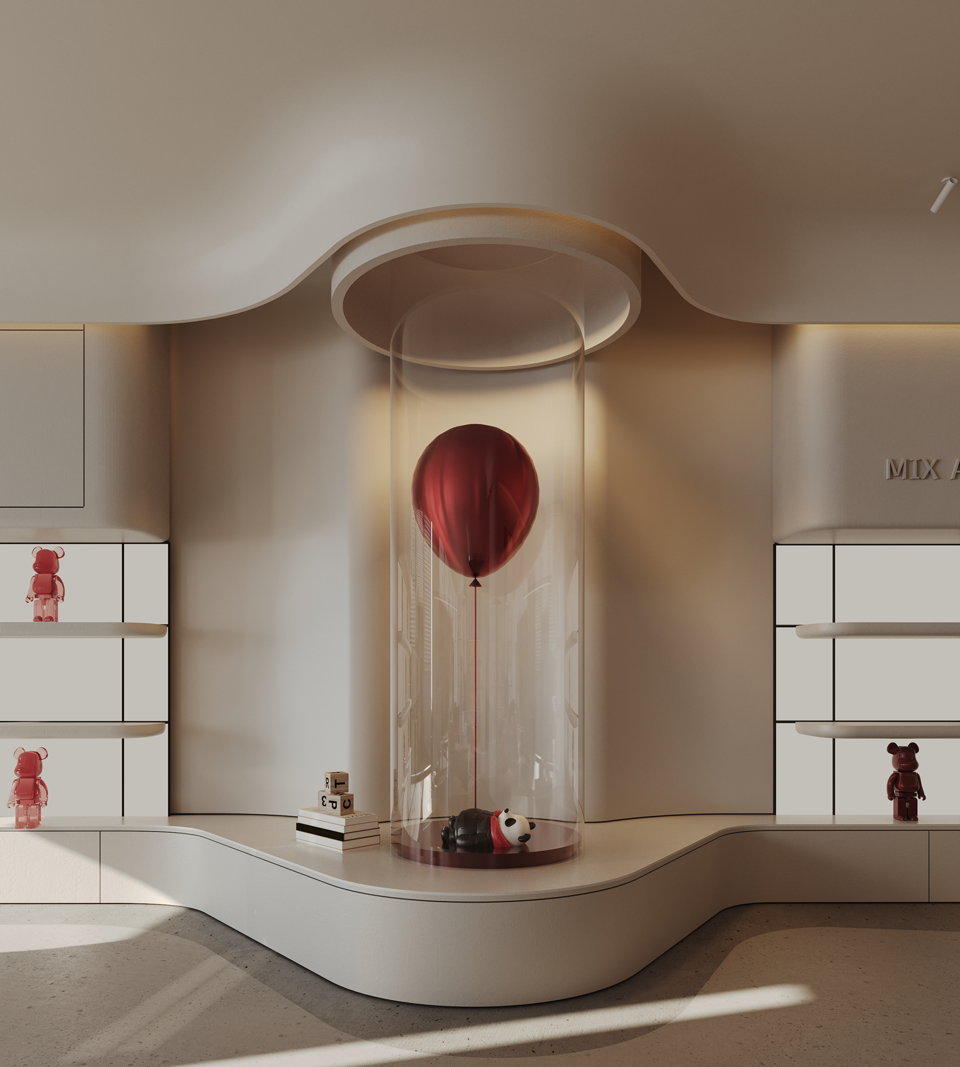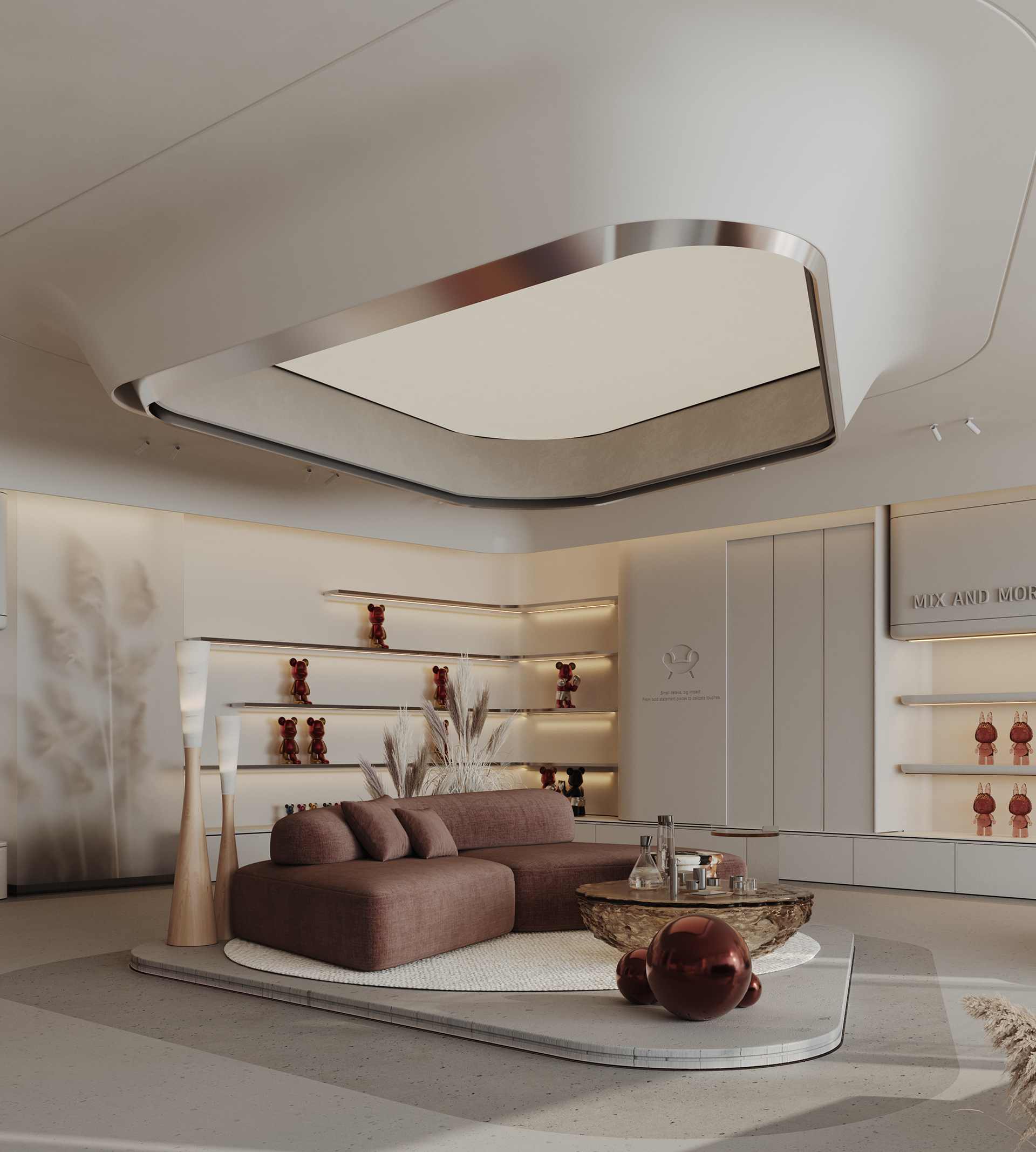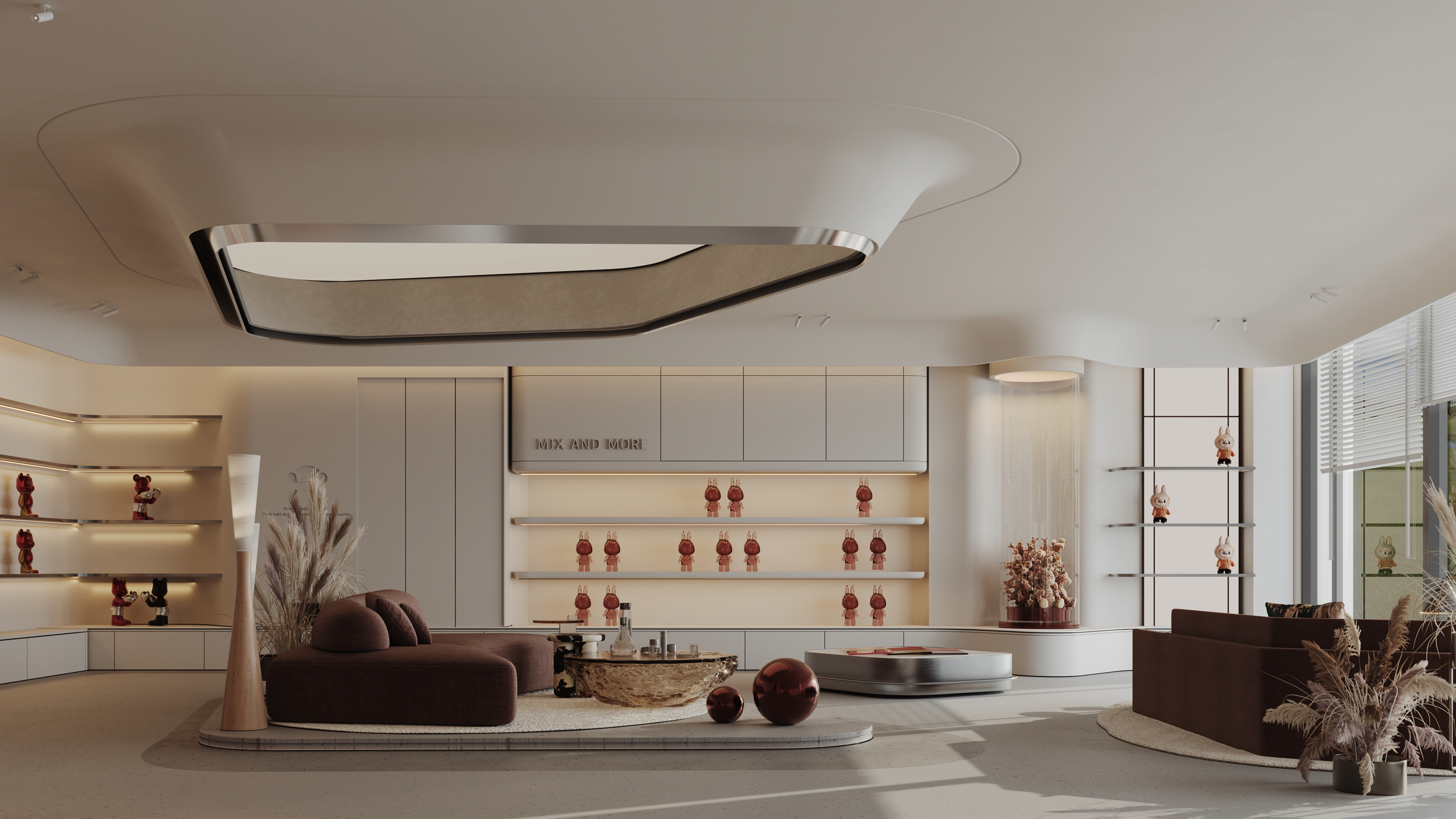 Mix and More is a home accessories and lifestyle store located in Sway Mall, New Cairo. The interior design aims to reflect the brand’s eclectic and cozy spirit, creating a welcoming space where diverse home items, from vibrant toys to elegant accessories, can be displayed harmoniously. Design Concept The core concept of the space is driven by the idea of a form-generating vertex, an imagined point in space pulled down from the ceiling to the ground. This gesture creates a fluid, down-bended ceiling that acts as a visual focal point and gives the space its unique identity. This sculptural form is then sliced to form the main lighting core, casting soft indirect light onto a display step directly beneath it. The interplay of ceiling curvature and lighting subtly guides the customer’s journey and creates moments of visual emphasis.