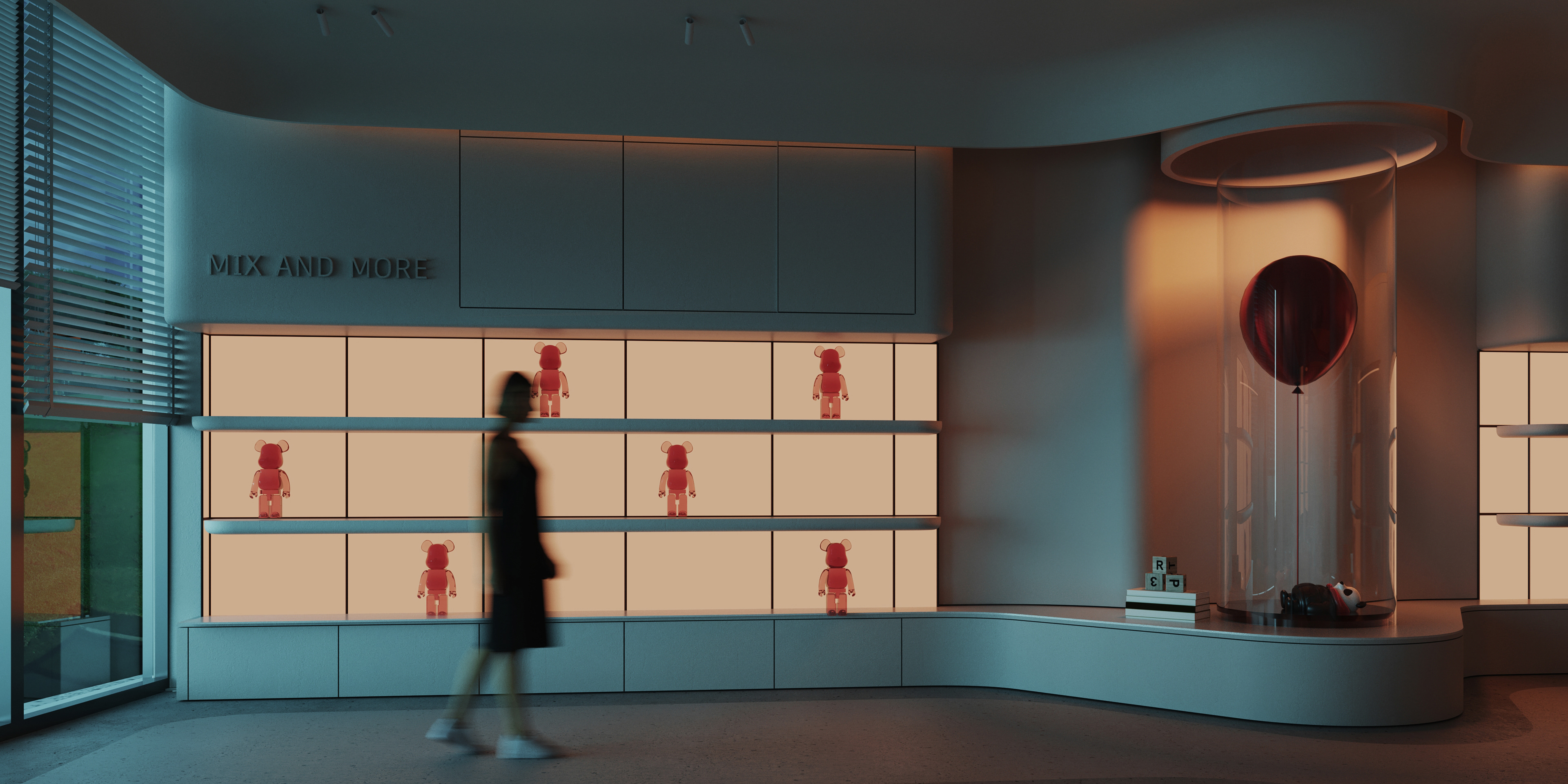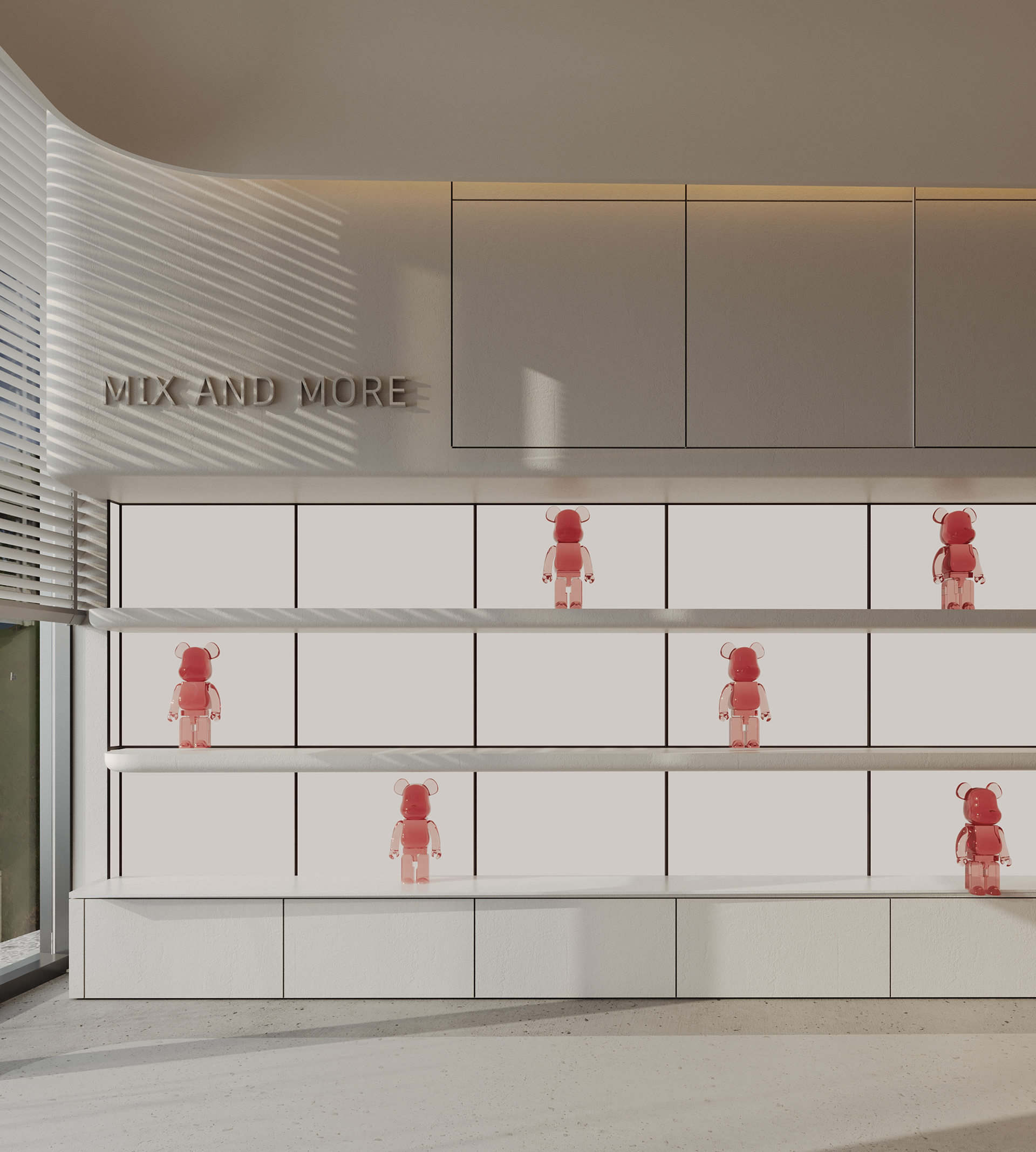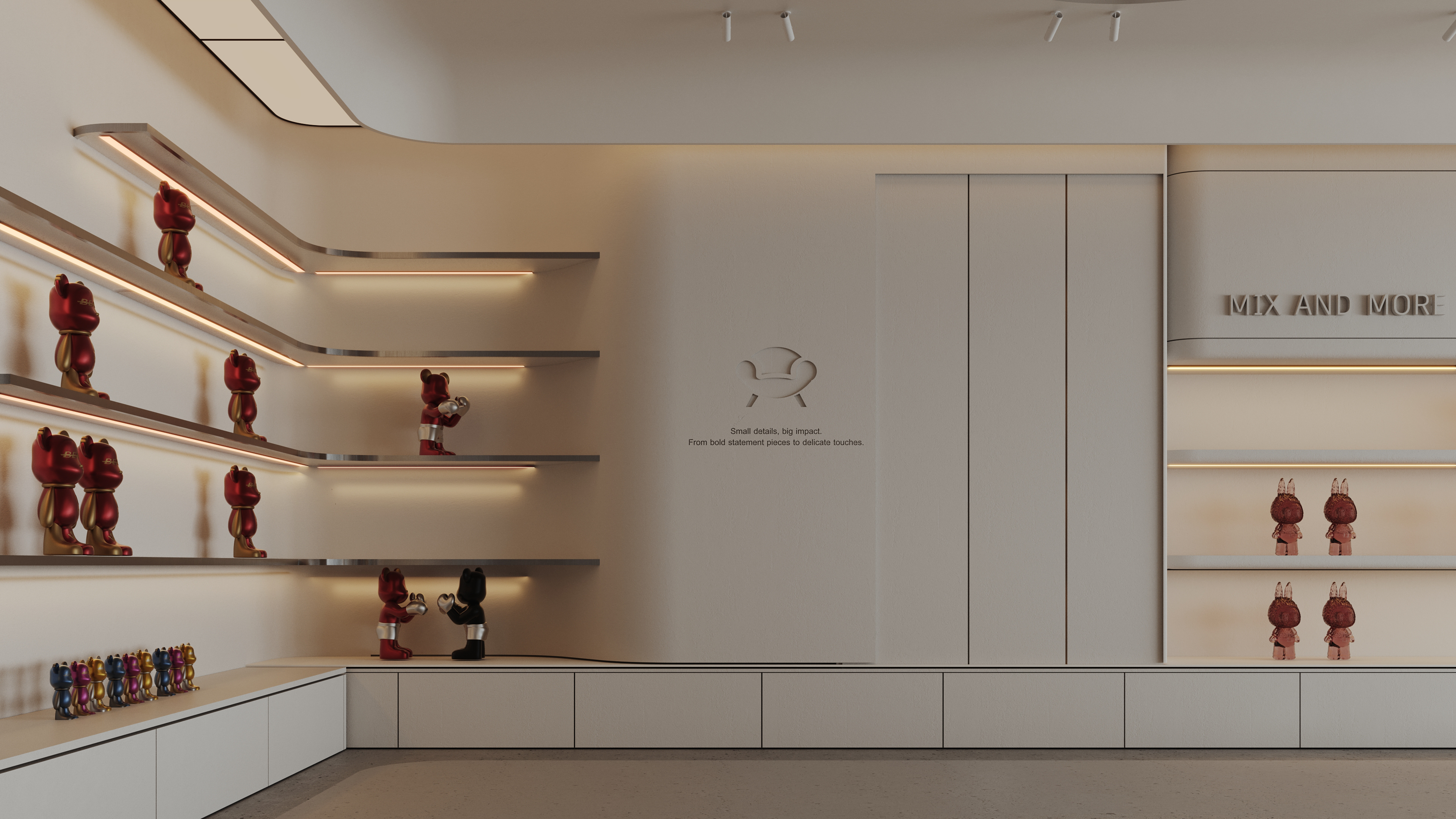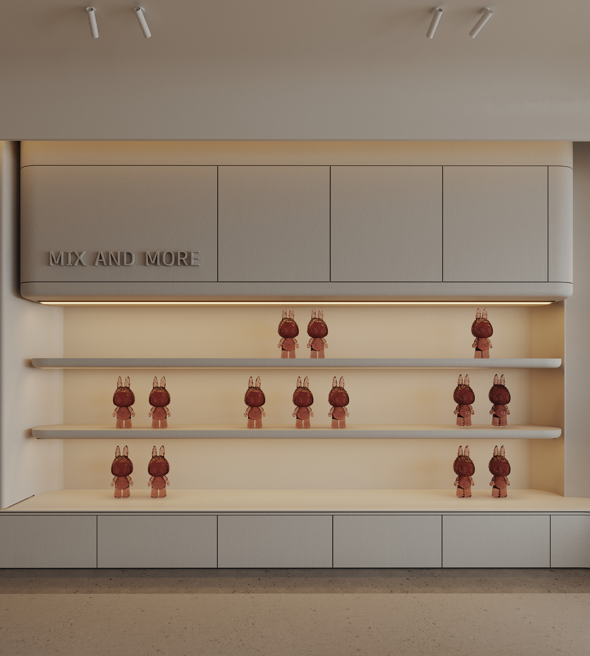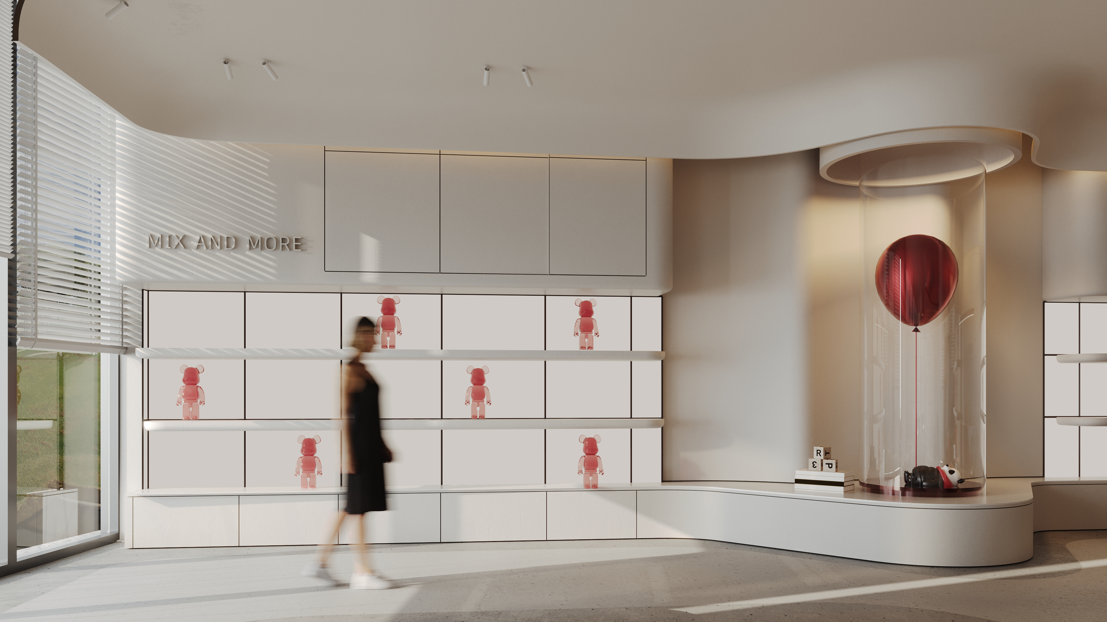 Mix and More is a home accessories and lifestyle store located in Sway Mall, New Cairo. The interior design aims to reflect the brand’s eclectic and cozy spirit, creating a welcoming space where diverse home items, from vibrant toys to elegant accessories, can be displayed harmoniously. Design Concept The core concept of the space is driven by the idea of a form-generating vertex, an imagined point in space pulled down from the ceiling to the ground. This gesture creates a fluid, down-bended ceiling that acts as a visual focal point and gives the space its unique identity. This sculptural form is then sliced to form the main lighting core, casting soft indirect light onto a display step directly beneath it. The interplay of ceiling curvature and lighting subtly guides the customer’s journey and creates moments of visual emphasis.