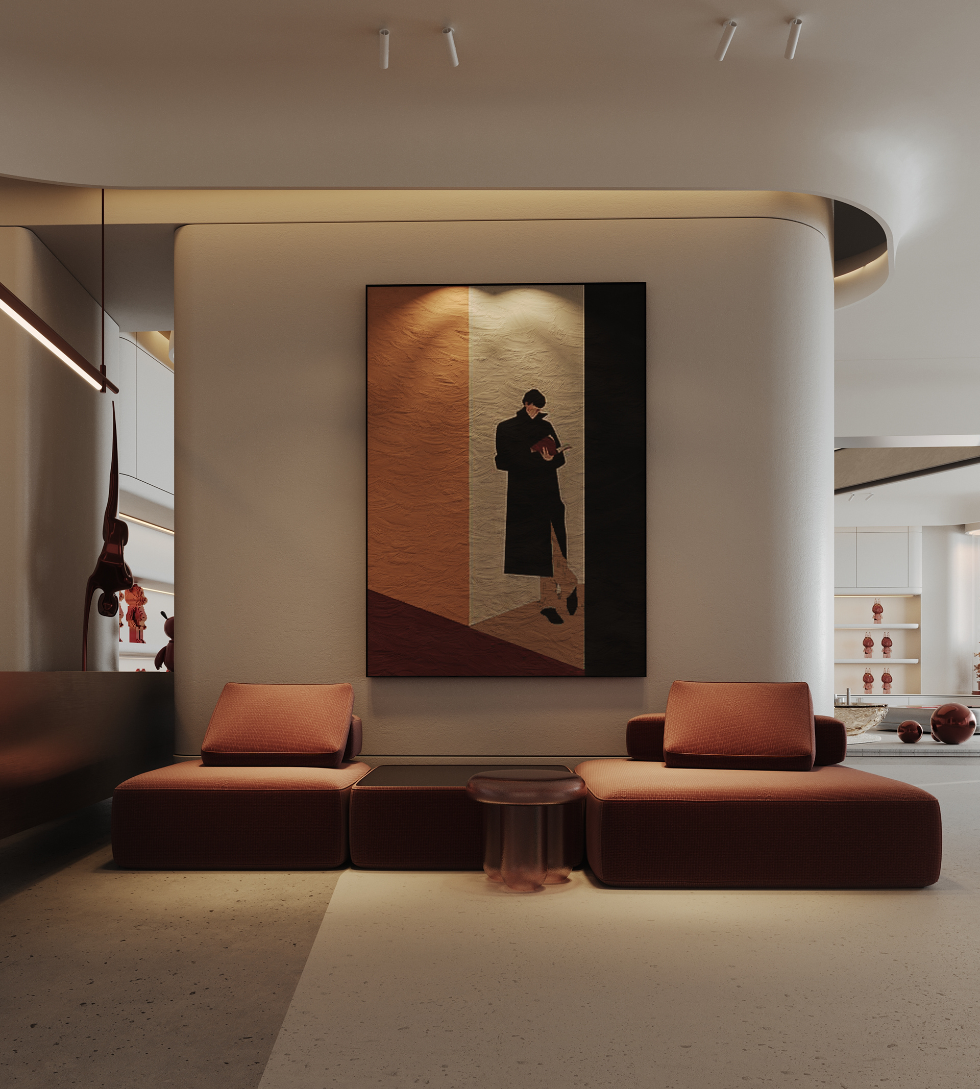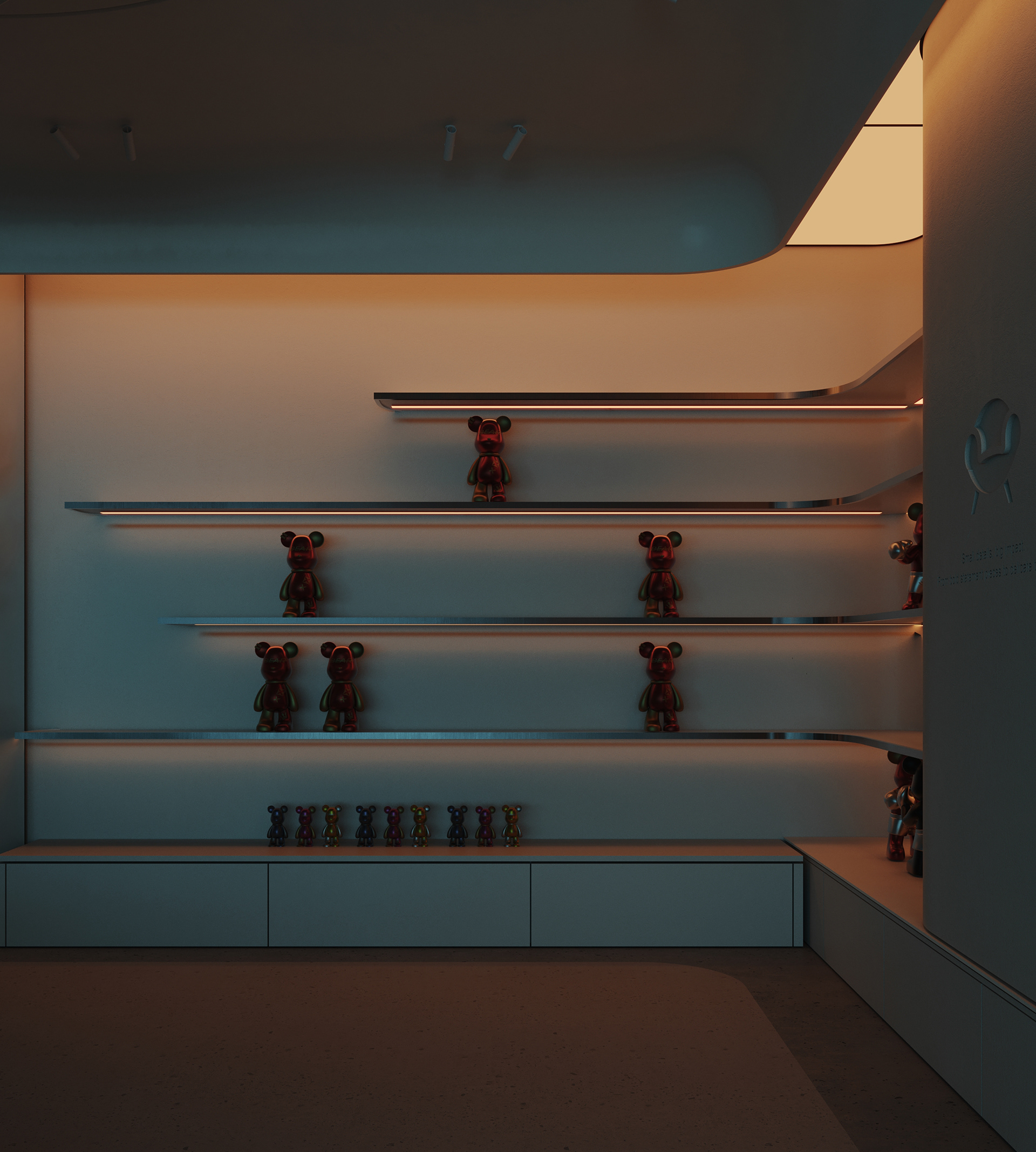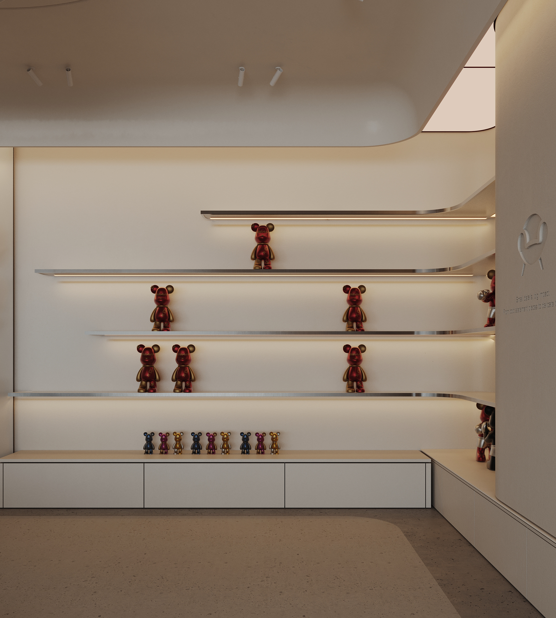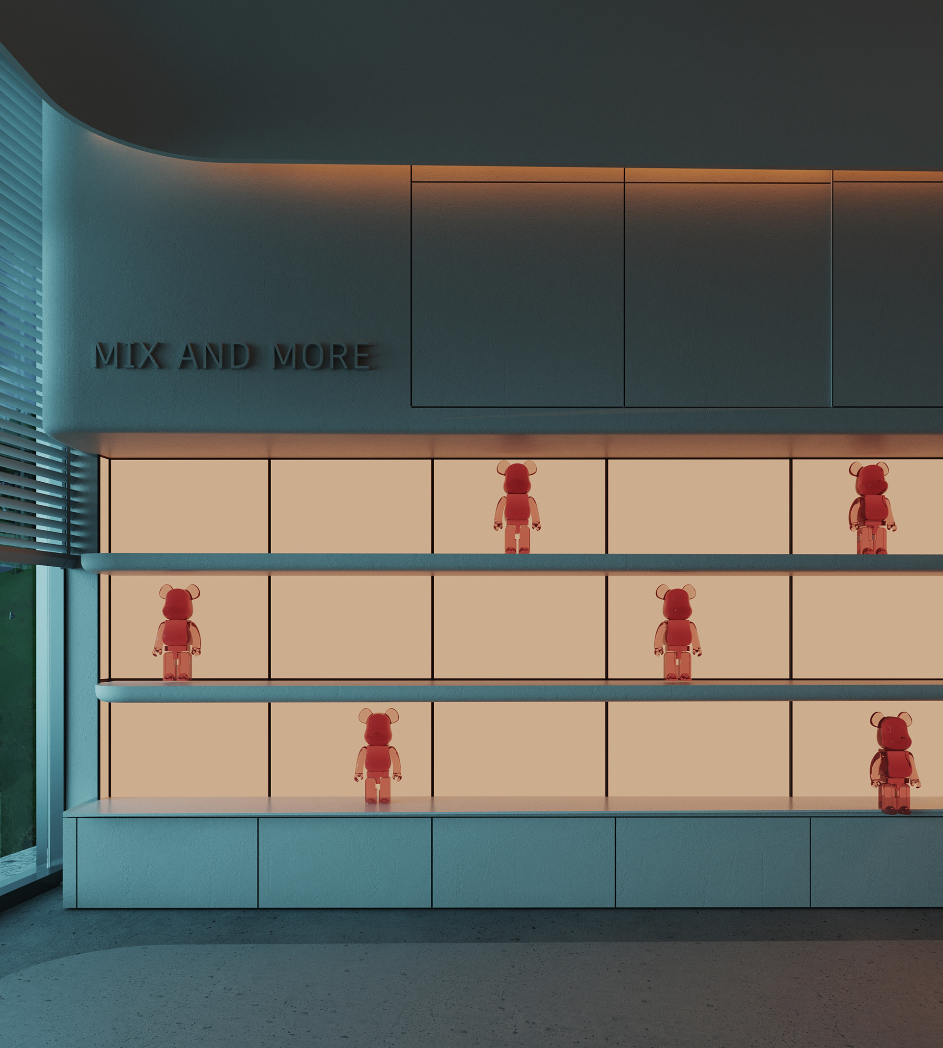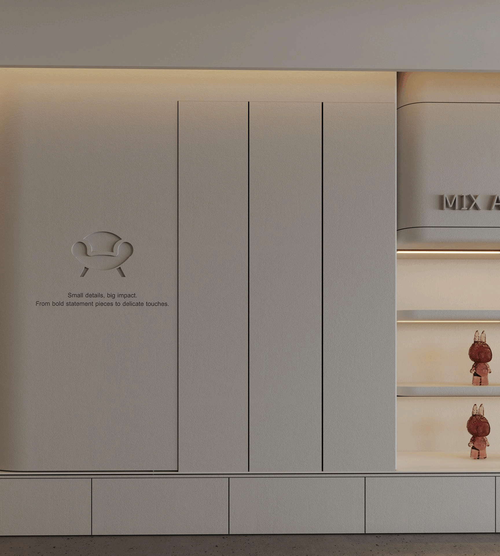 Mix and More is a home accessories and lifestyle store located in Sway Mall, New Cairo. The interior design aims to reflect the brand’s eclectic and cozy spirit, creating a welcoming space where diverse home items, from vibrant toys to elegant accessories, can be displayed harmoniously. Design Concept The core concept of the space is driven by the idea of a form-generating vertex, an imagined point in space pulled down from the ceiling to the ground. This gesture creates a fluid, down-bended ceiling that acts as a visual focal point and gives the space its unique identity. This sculptural form is then sliced to form the main lighting core, casting soft indirect light onto a display step directly beneath it. The interplay of ceiling curvature and lighting subtly guides the customer’s journey and creates moments of visual emphasis.