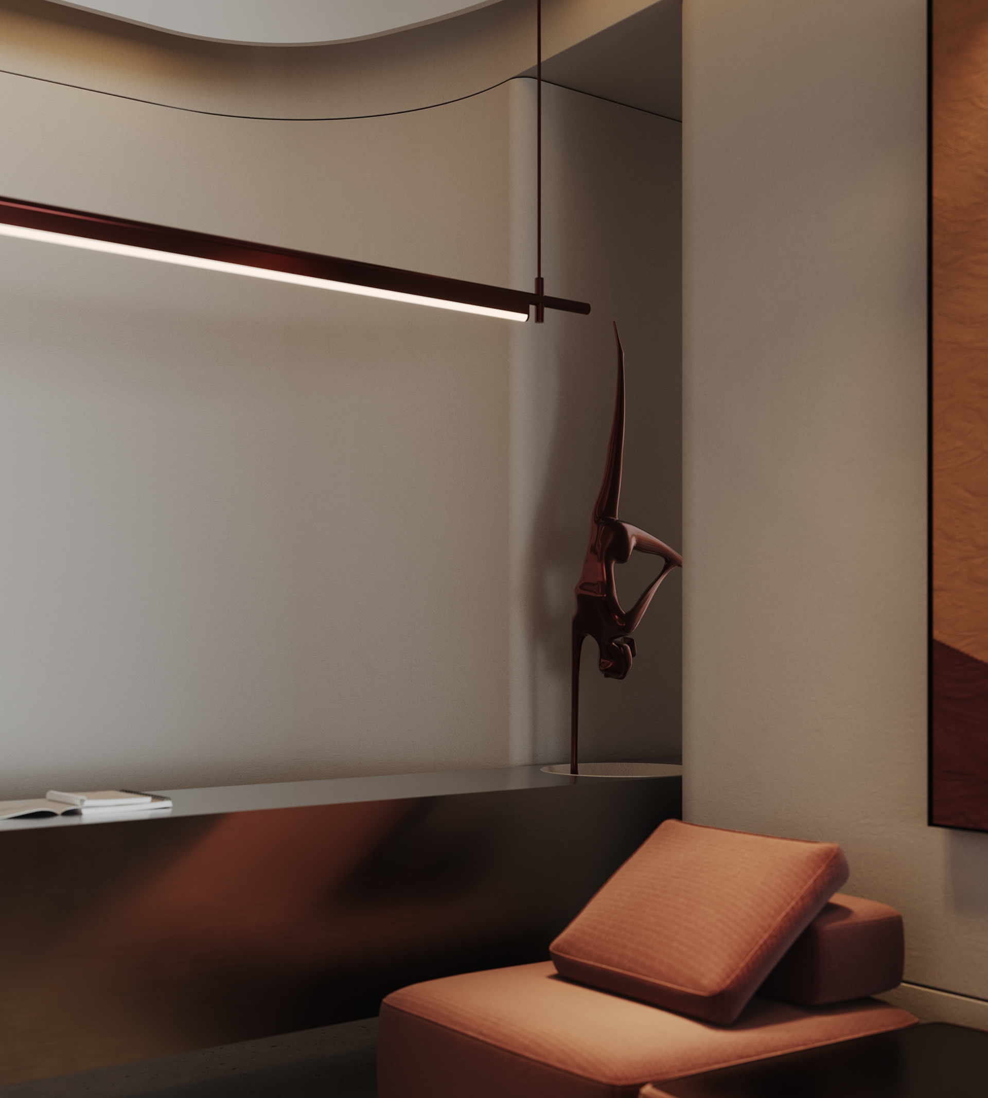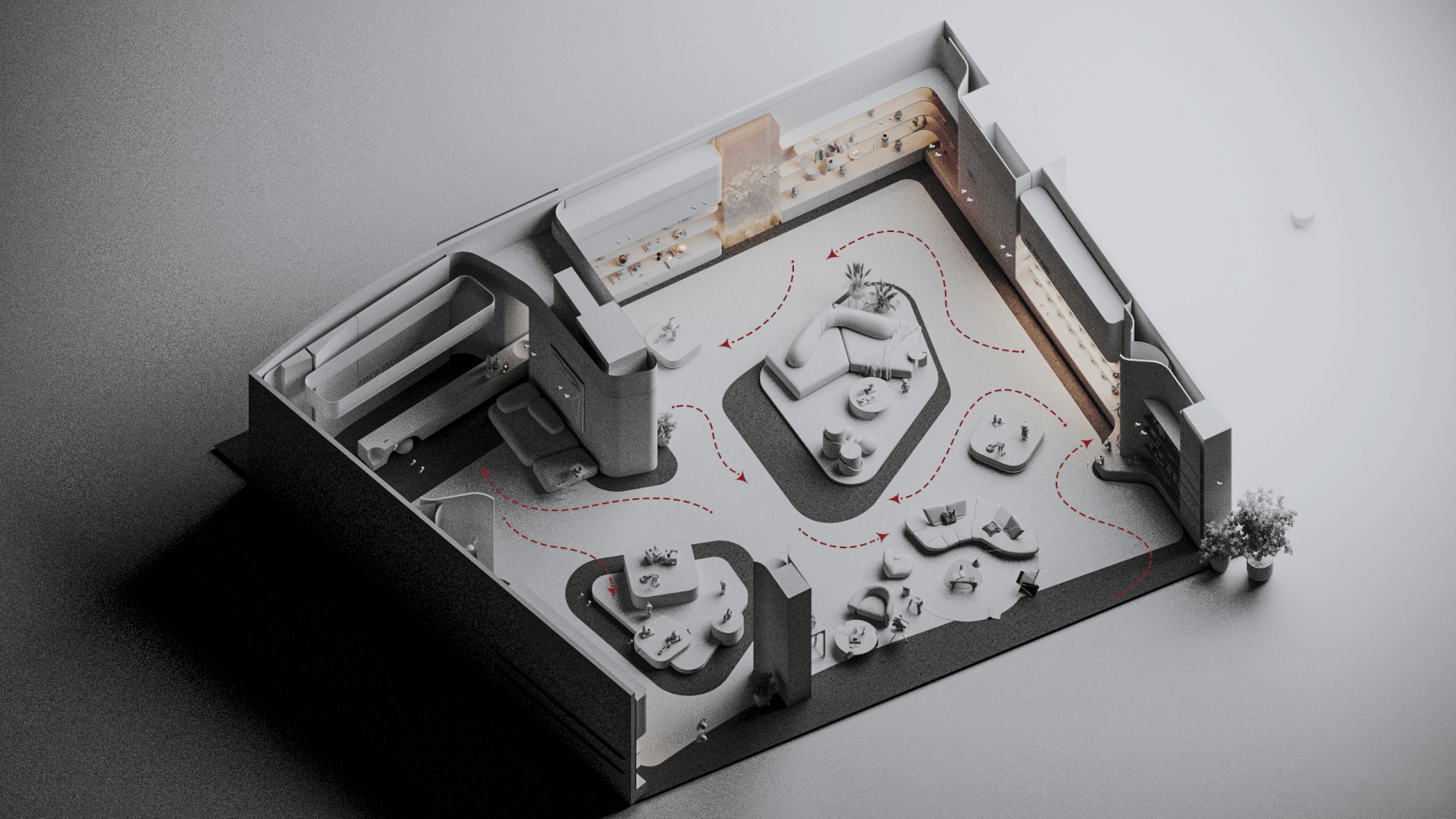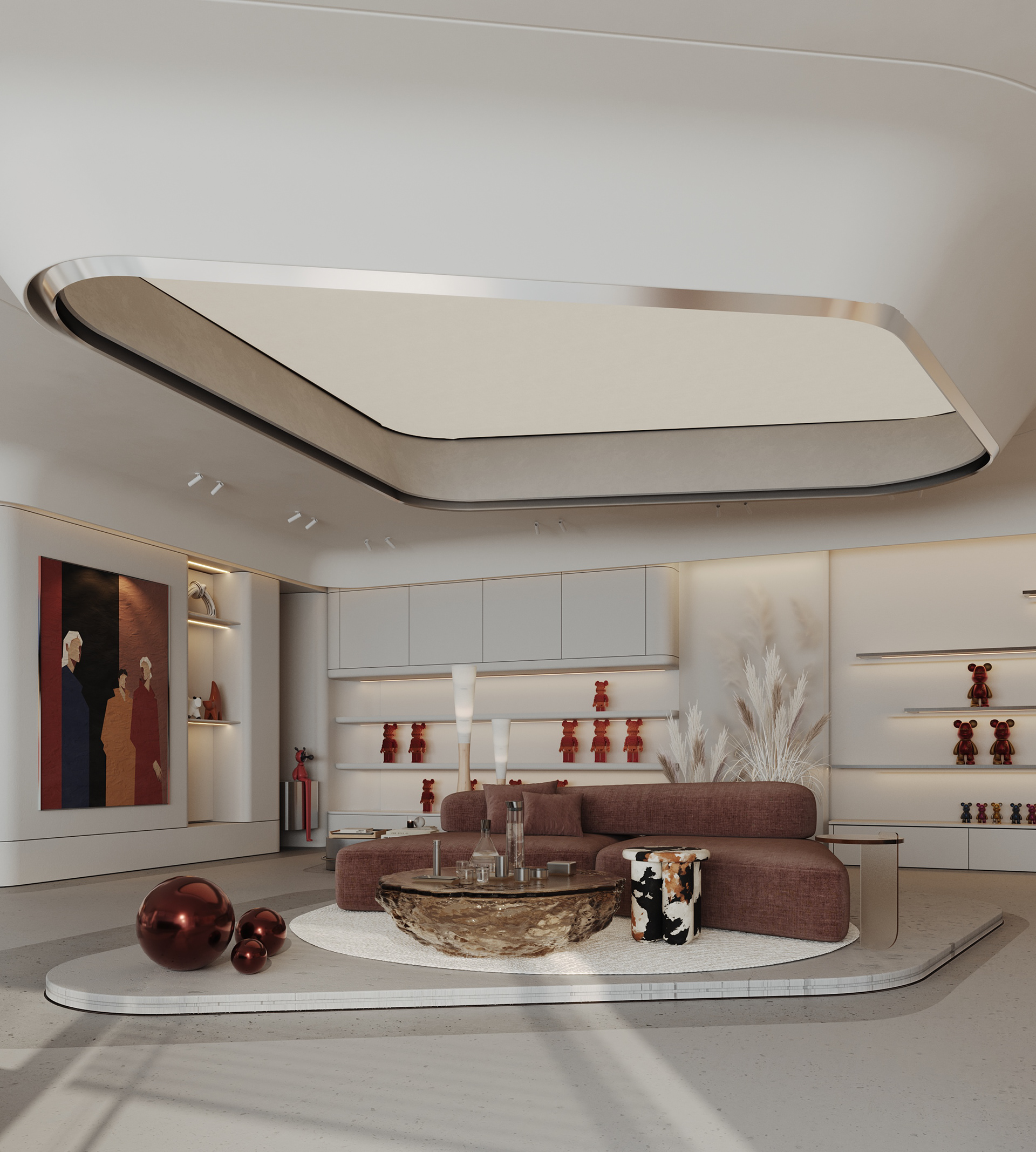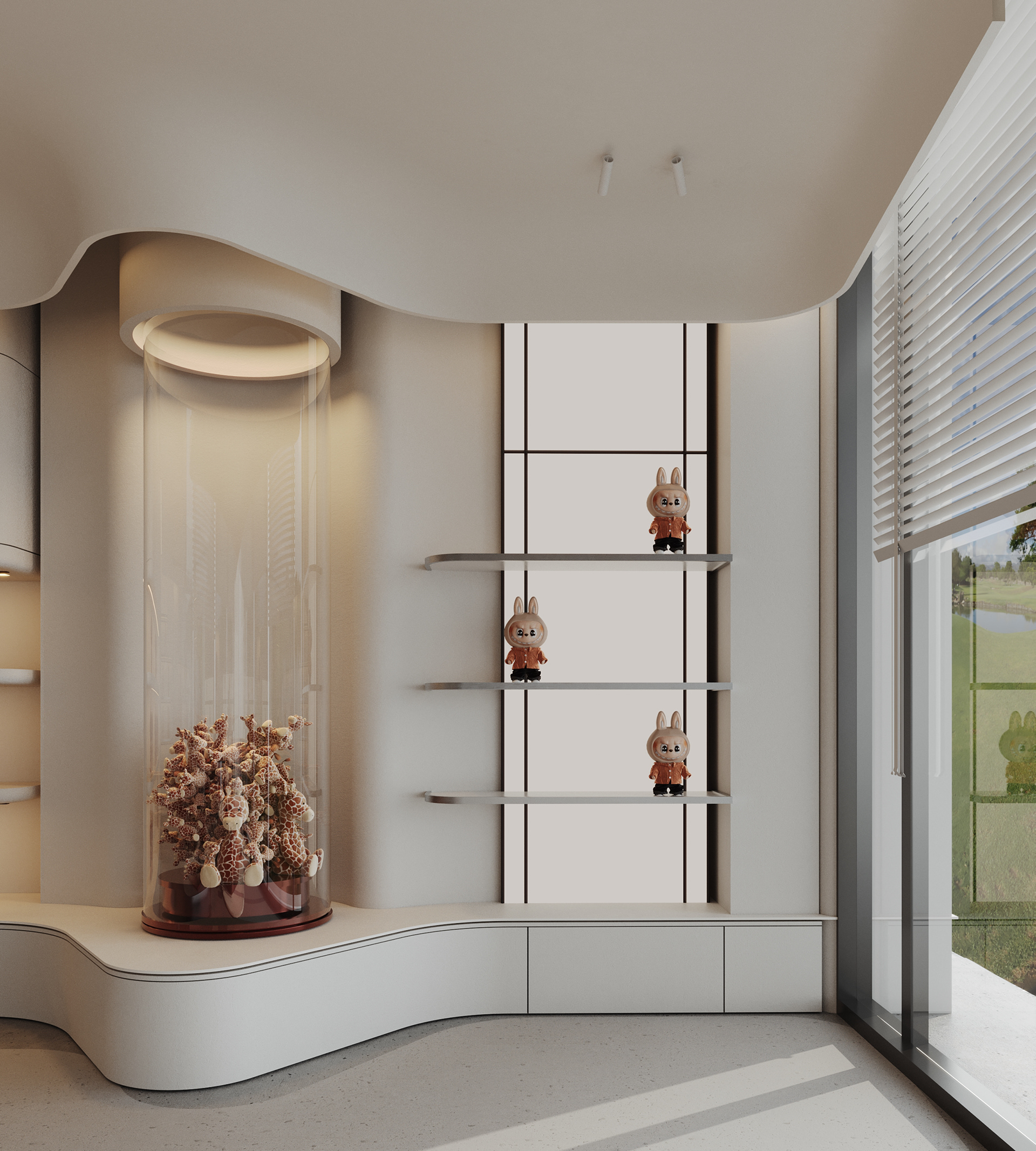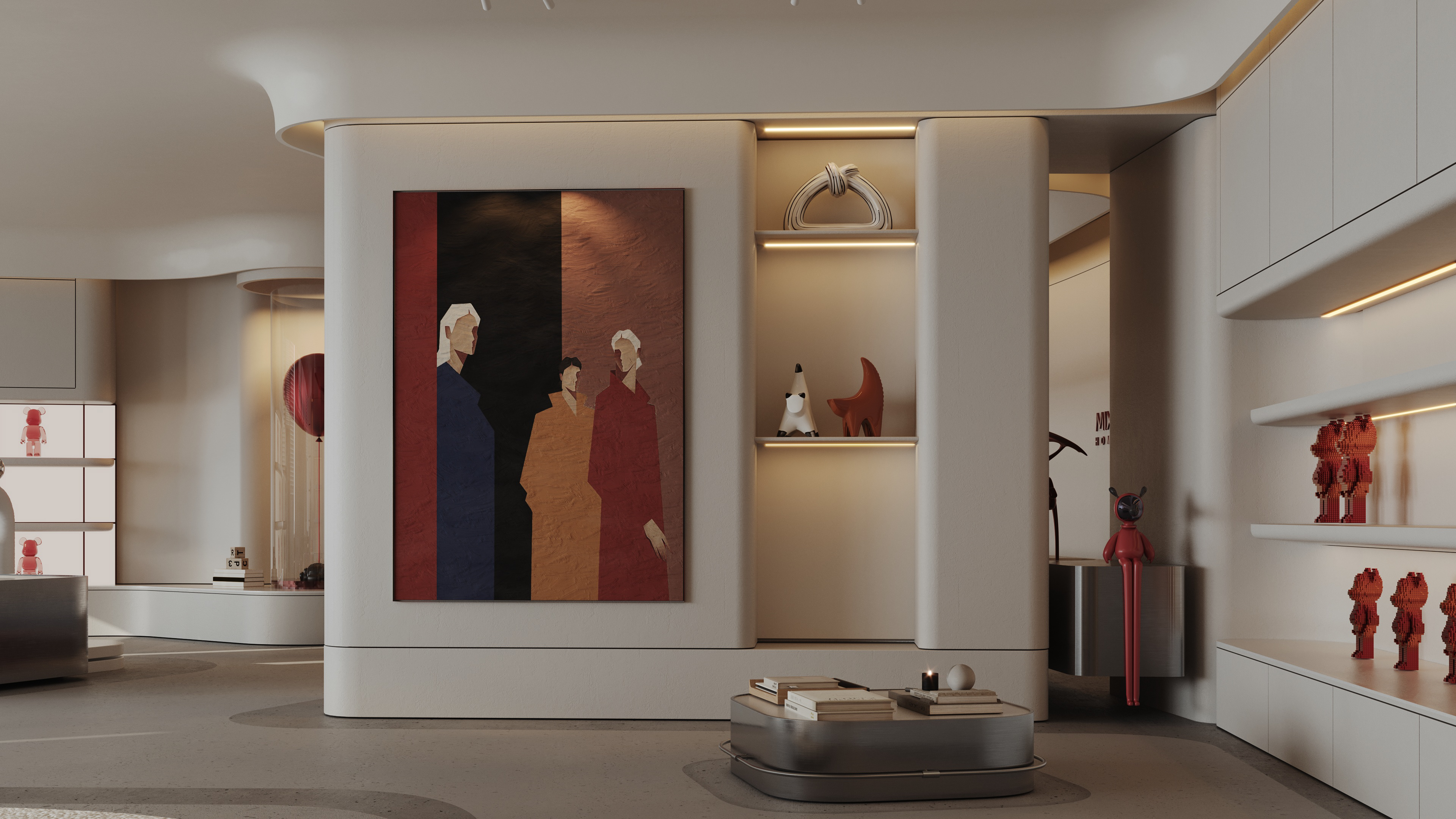 Mix and More is a home accessories and lifestyle store located in Sway Mall, New Cairo. The interior design aims to reflect the brand’s eclectic and cozy spirit, creating a welcoming space where diverse home items, from vibrant toys to elegant accessories, can be displayed harmoniously. Design Concept The core concept of the space is driven by the idea of a form-generating vertex, an imagined point in space pulled down from the ceiling to the ground. This gesture creates a fluid, down-bended ceiling that acts as a visual focal point and gives the space its unique identity. This sculptural form is then sliced to form the main lighting core, casting soft indirect light onto a display step directly beneath it. The interplay of ceiling curvature and lighting subtly guides the customer’s journey and creates moments of visual emphasis.
