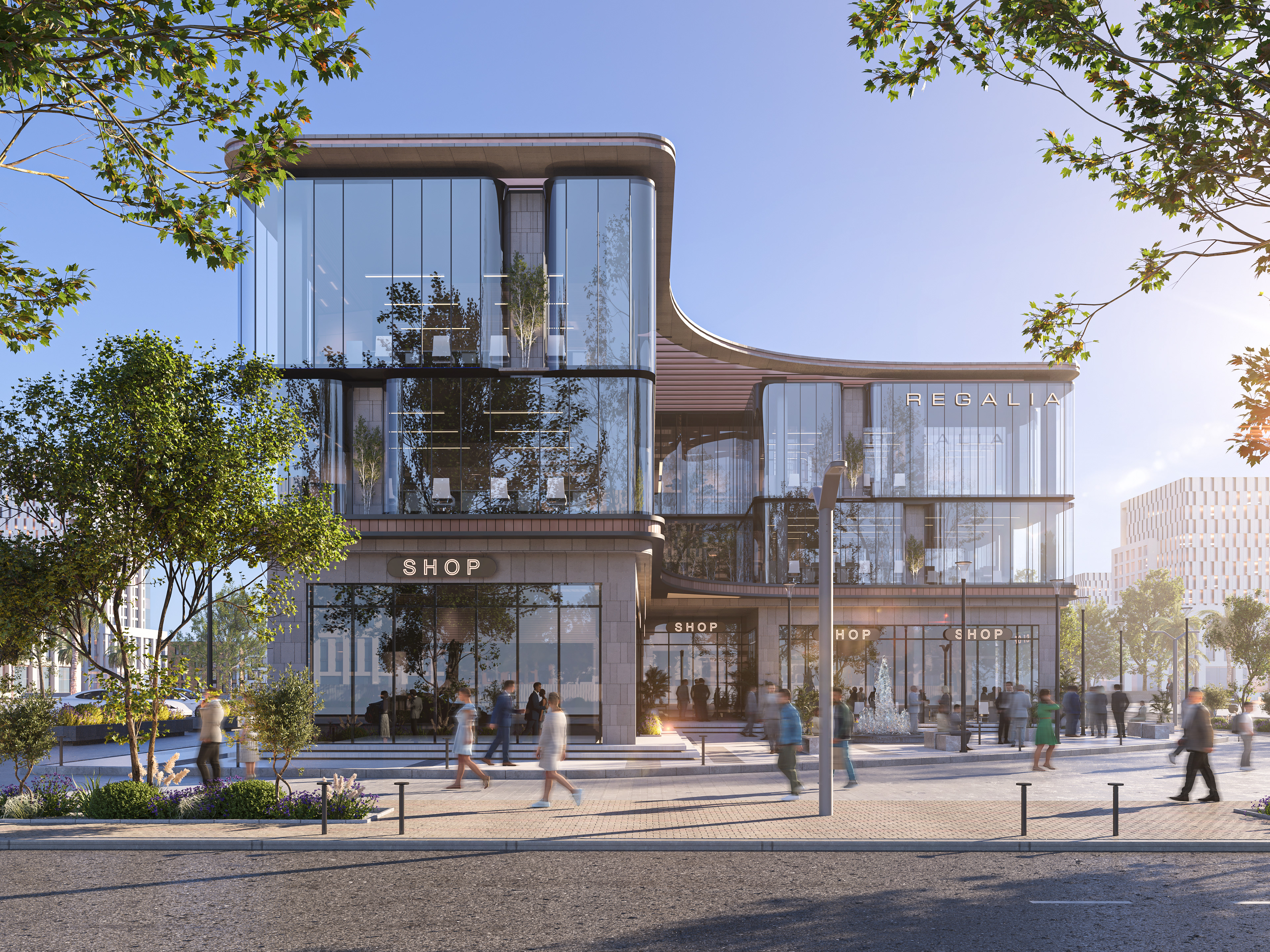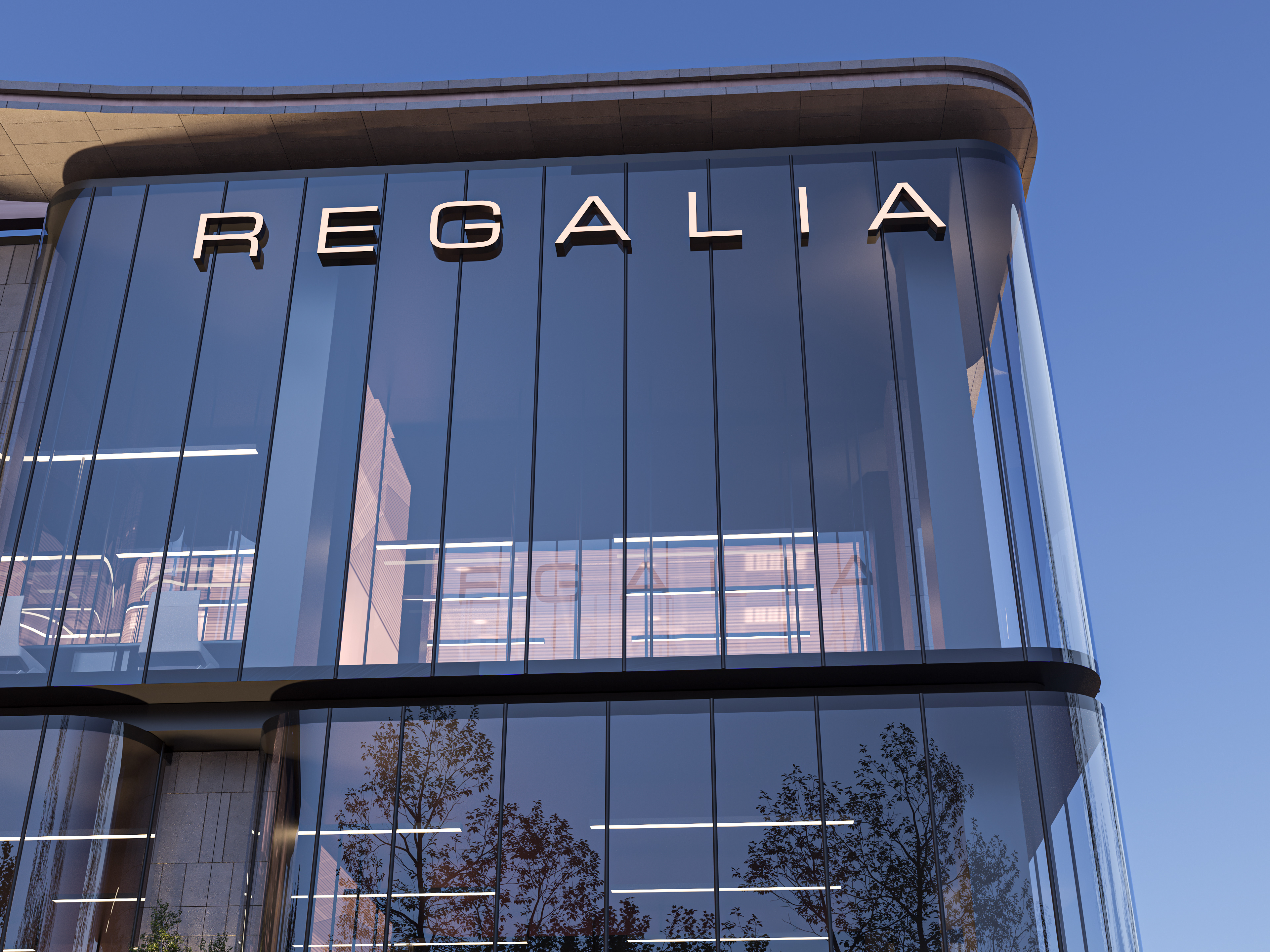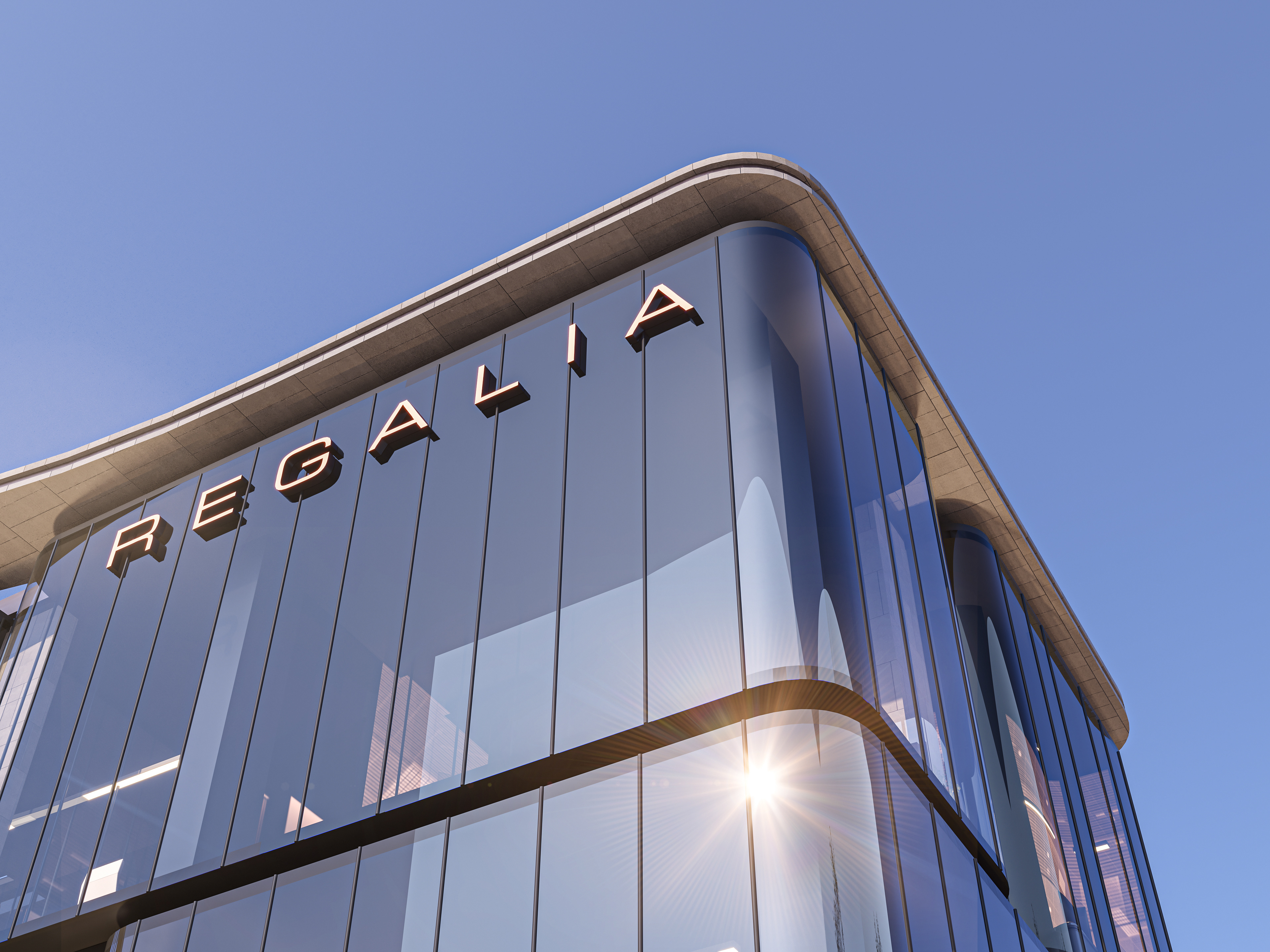 Form & Identity:The anchor commercial building, also named REGALIA, features a fluid, curved form that breaks away from typical orthogonal commercial architecture. This soft shape maximizes corner exposure for retail tenants and creates a dynamic street presence.