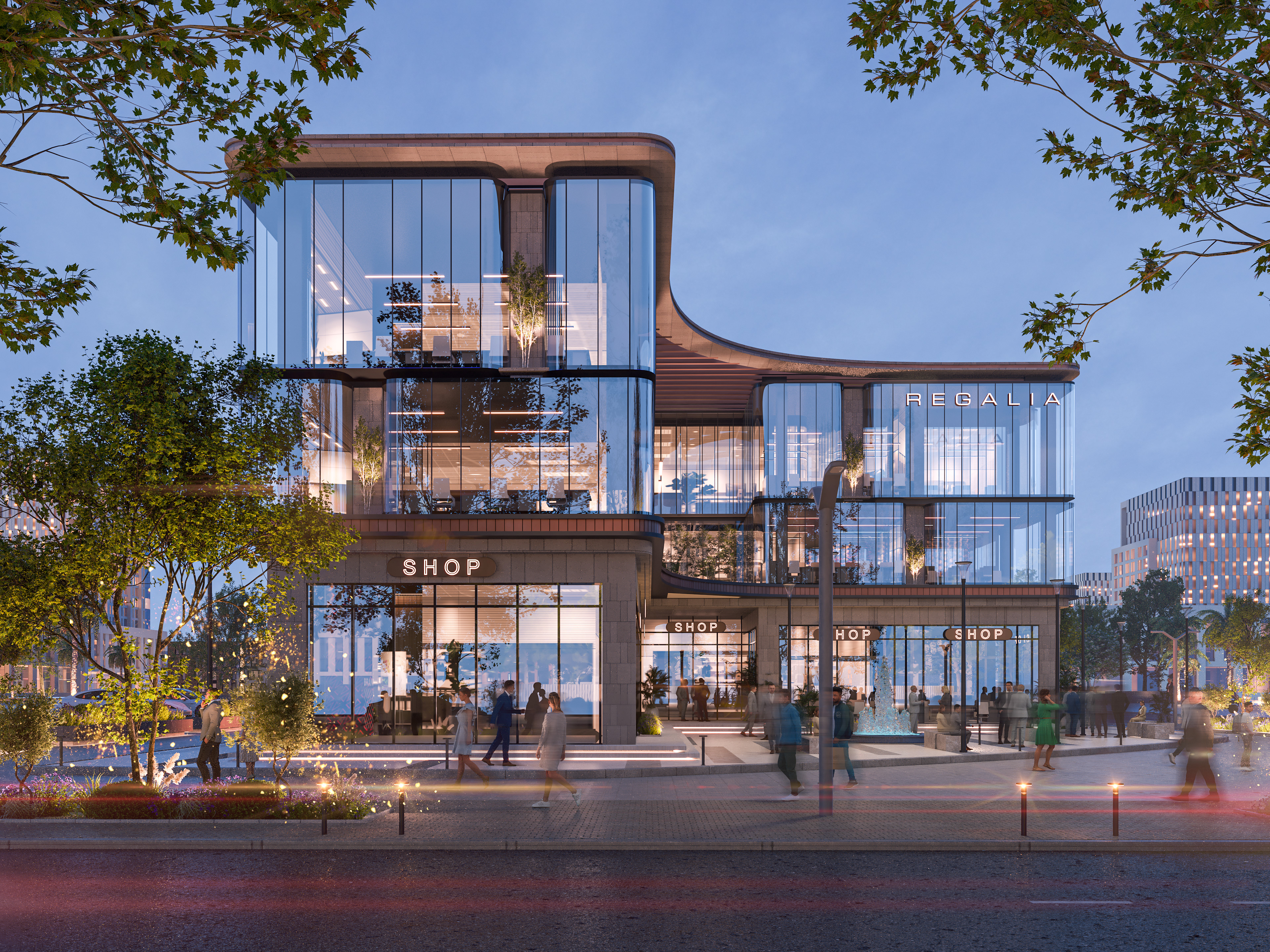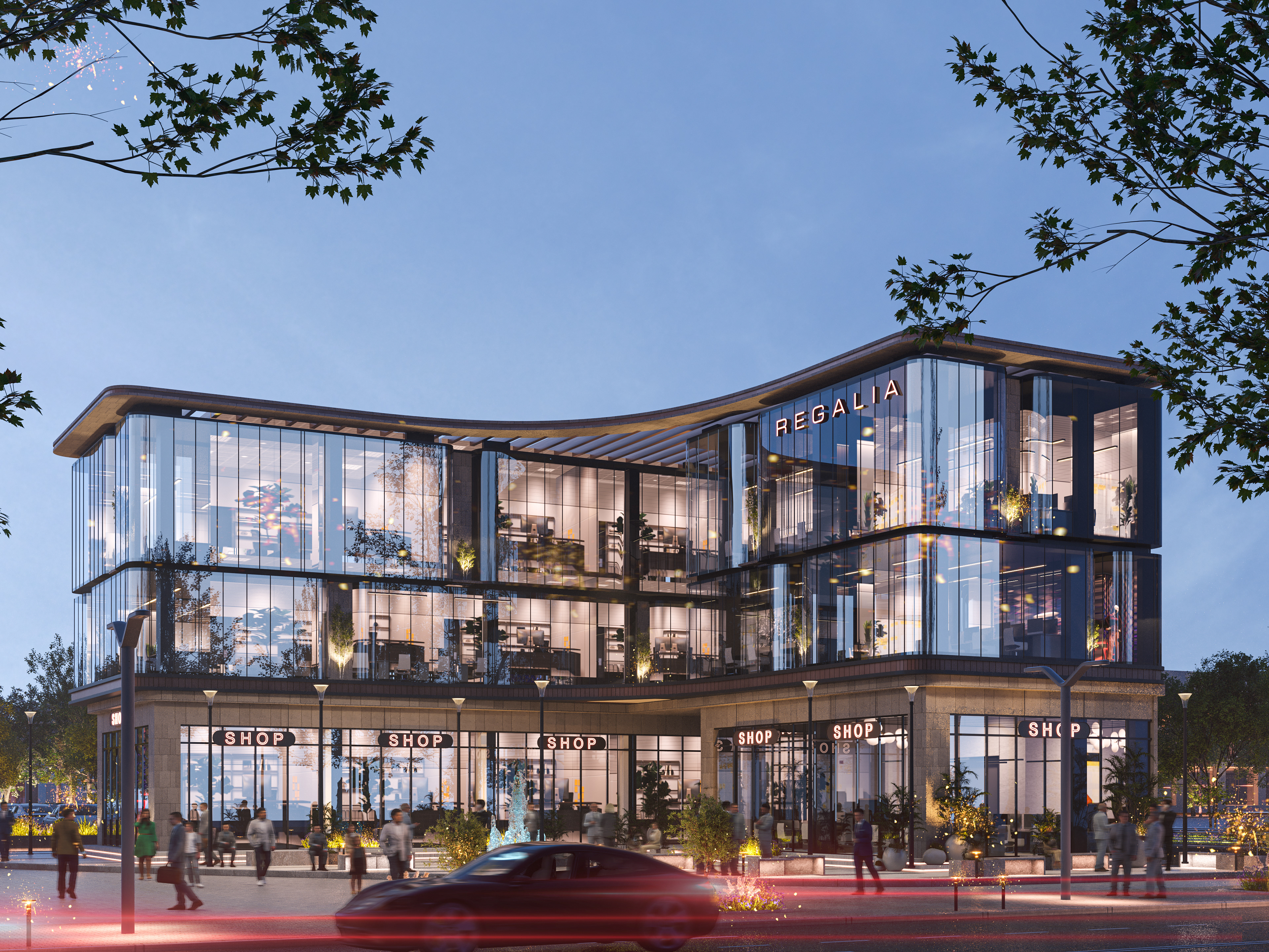 The project, branded “Regalia”, is a contemporary mixed-use commercial building designed with a strong emphasis on transparency, fluidity, and urban integration. Situated at a prominent corner location, the building establishes itself as a landmark through its striking façade, dynamic form, and inviting ground-level retail experience.