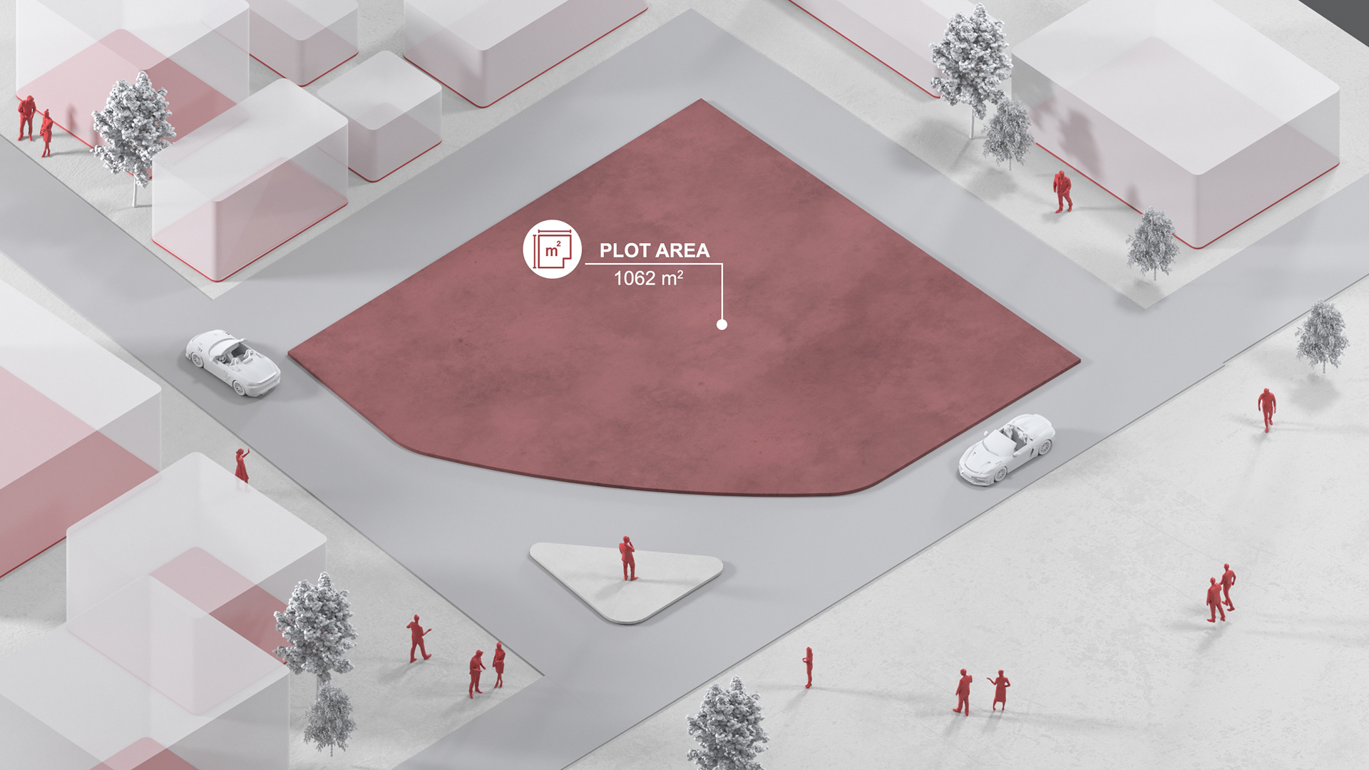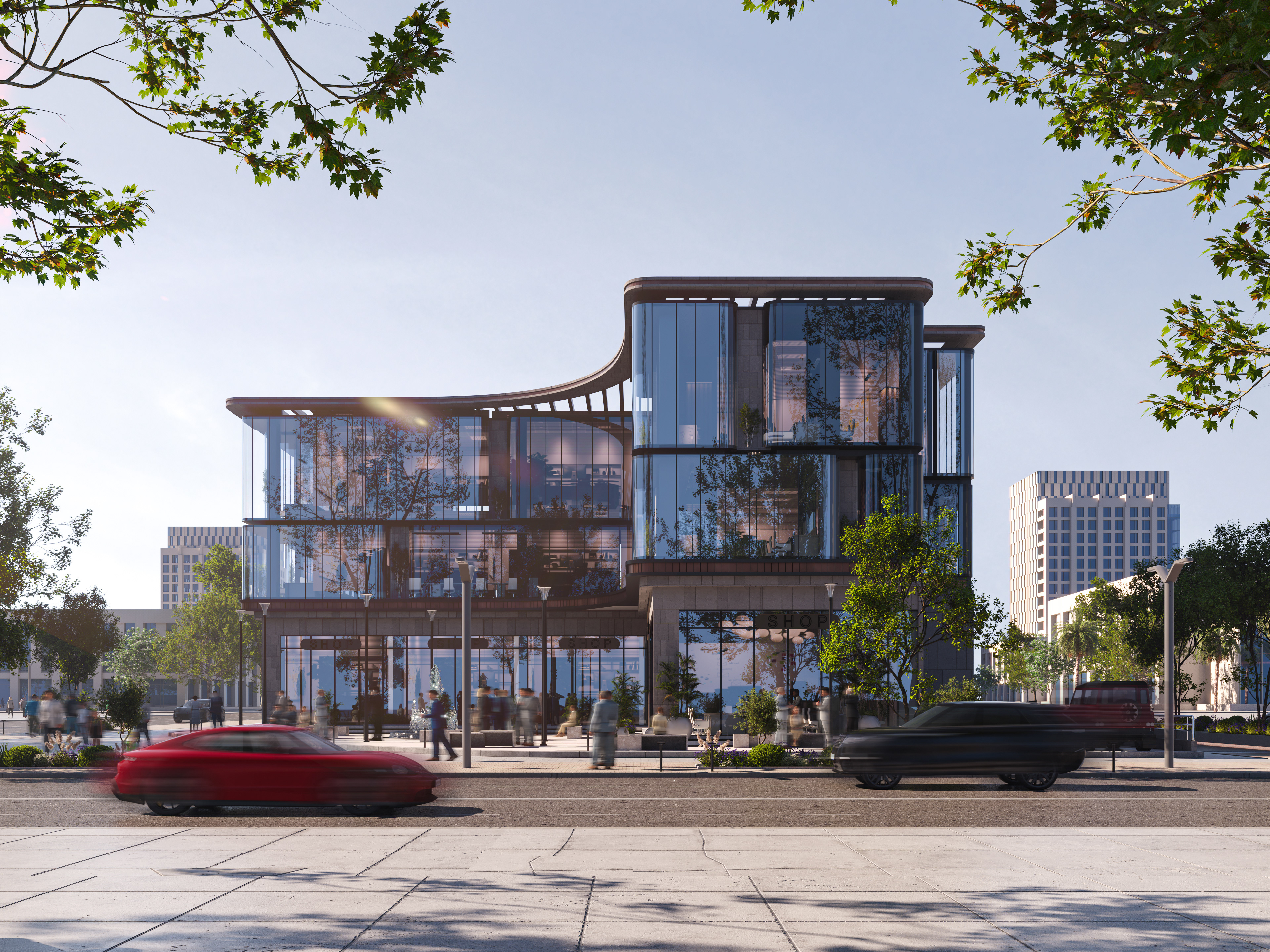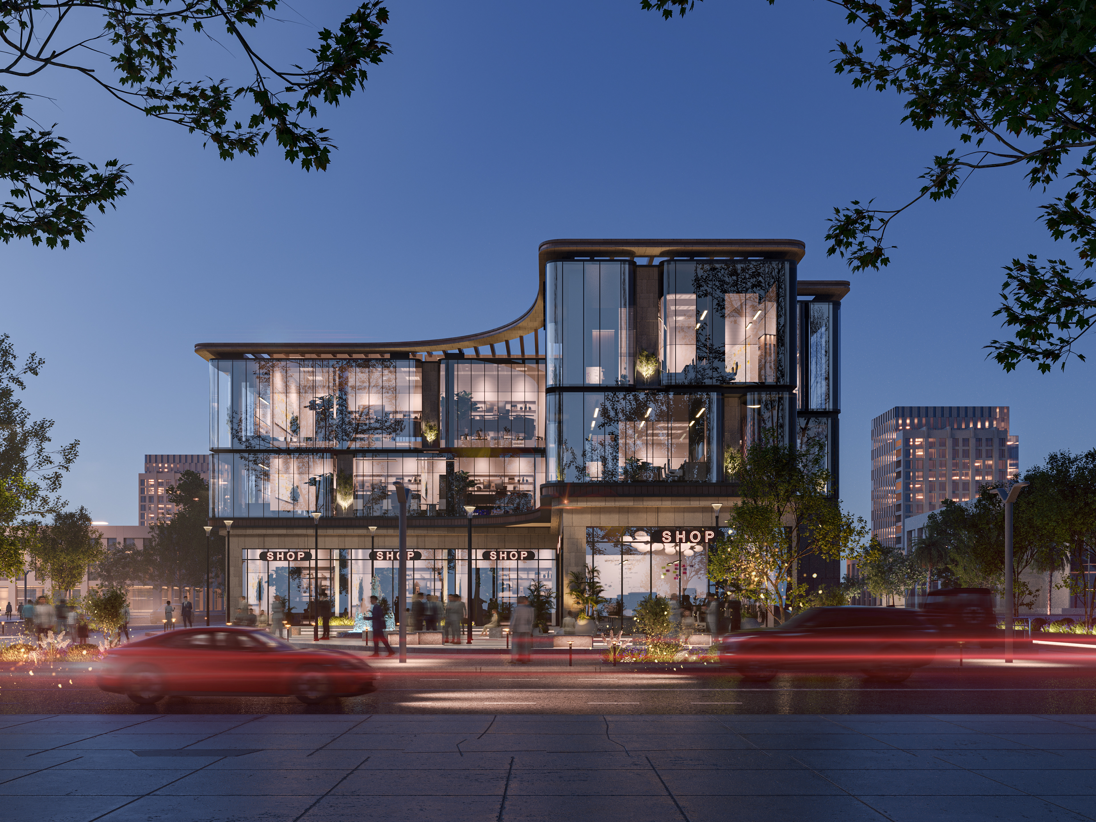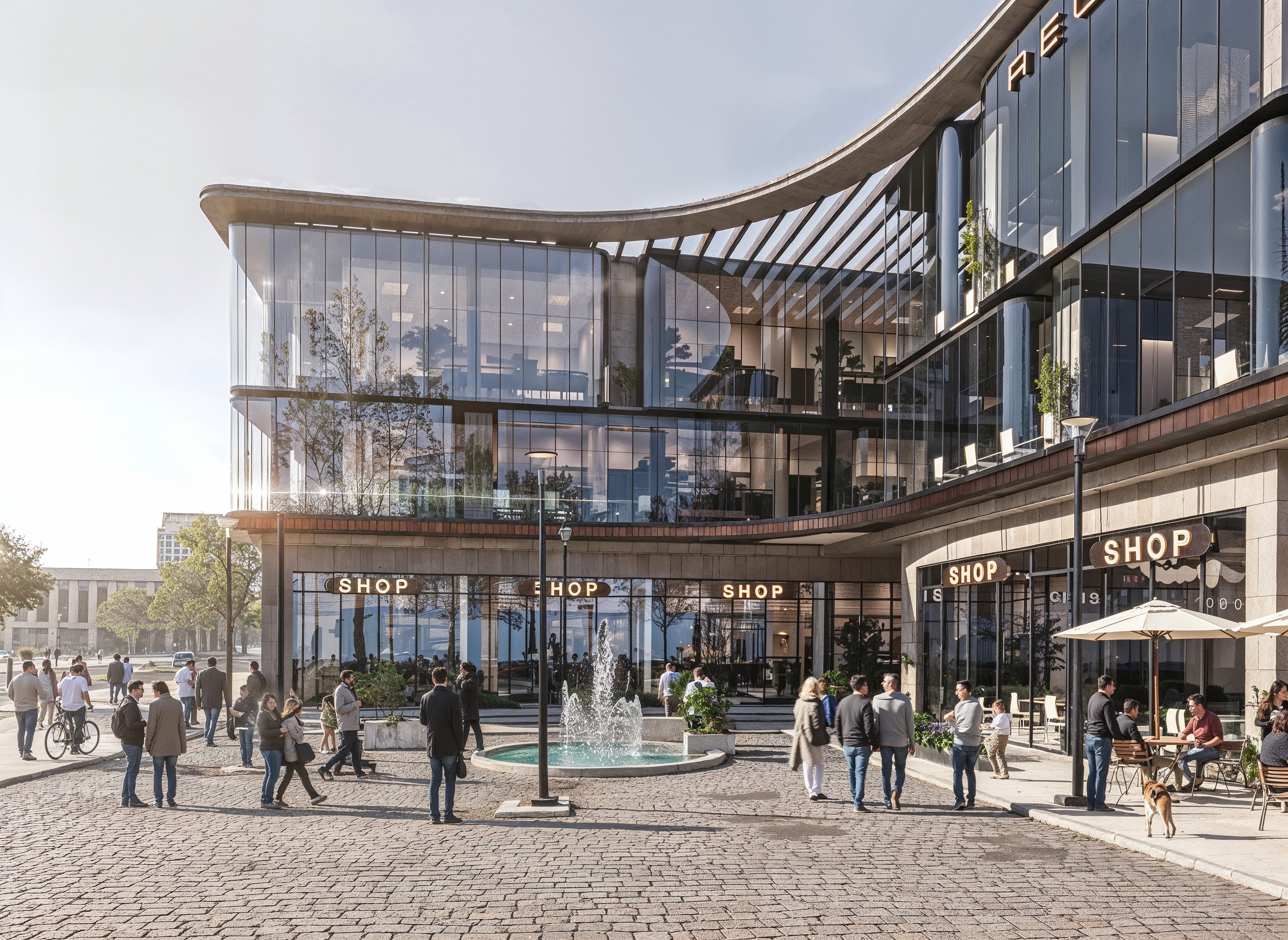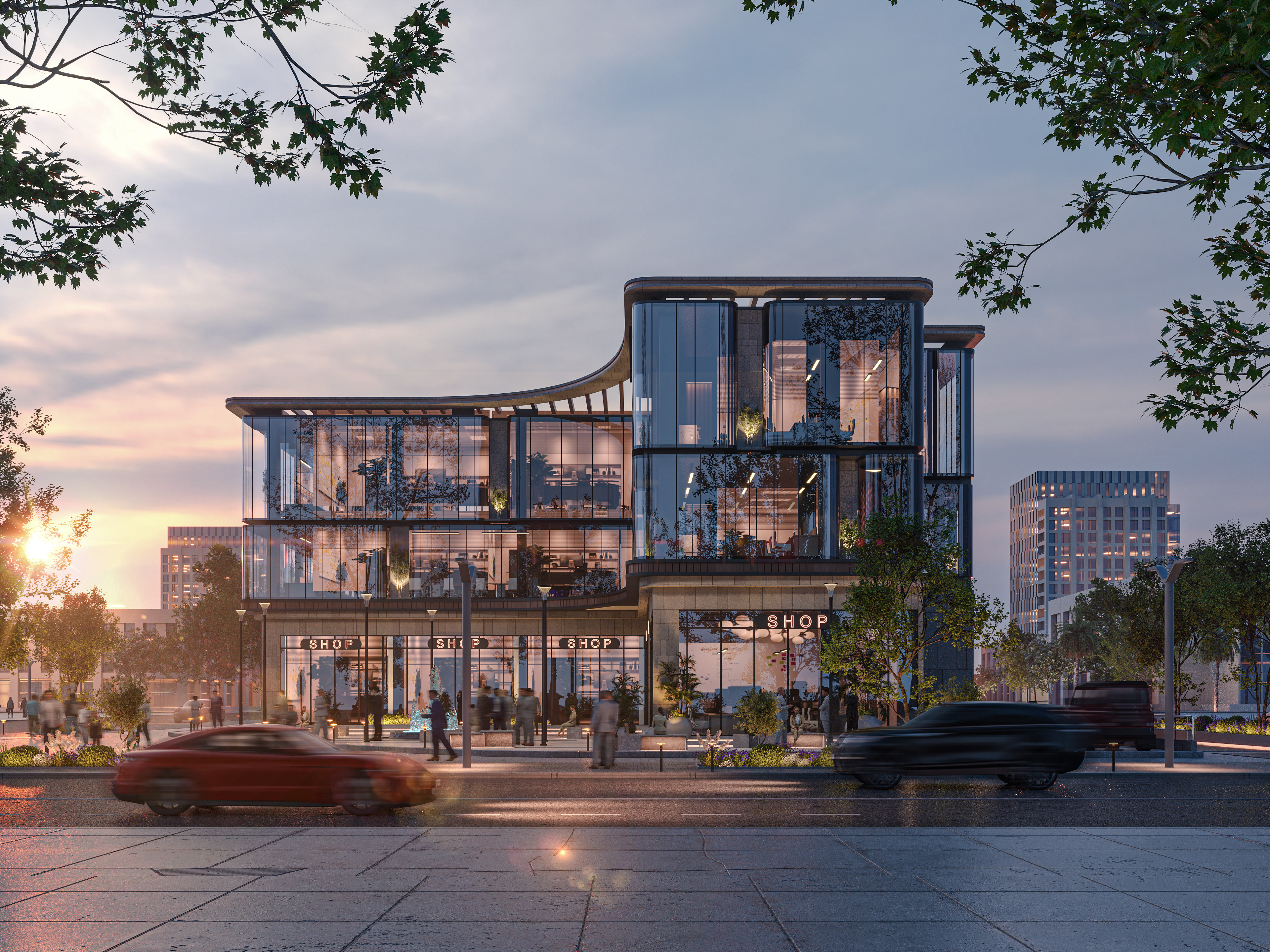 Materiality :The design employs a sophisticated contrast: a heavy, grounded base of textured stone or concrete (housing the retail 'SHOP' units) is juxtaposed with a light, transparent upper volume of floor-to-ceiling glass (for the commercial offices). This creates a sense of stability and lightness.
