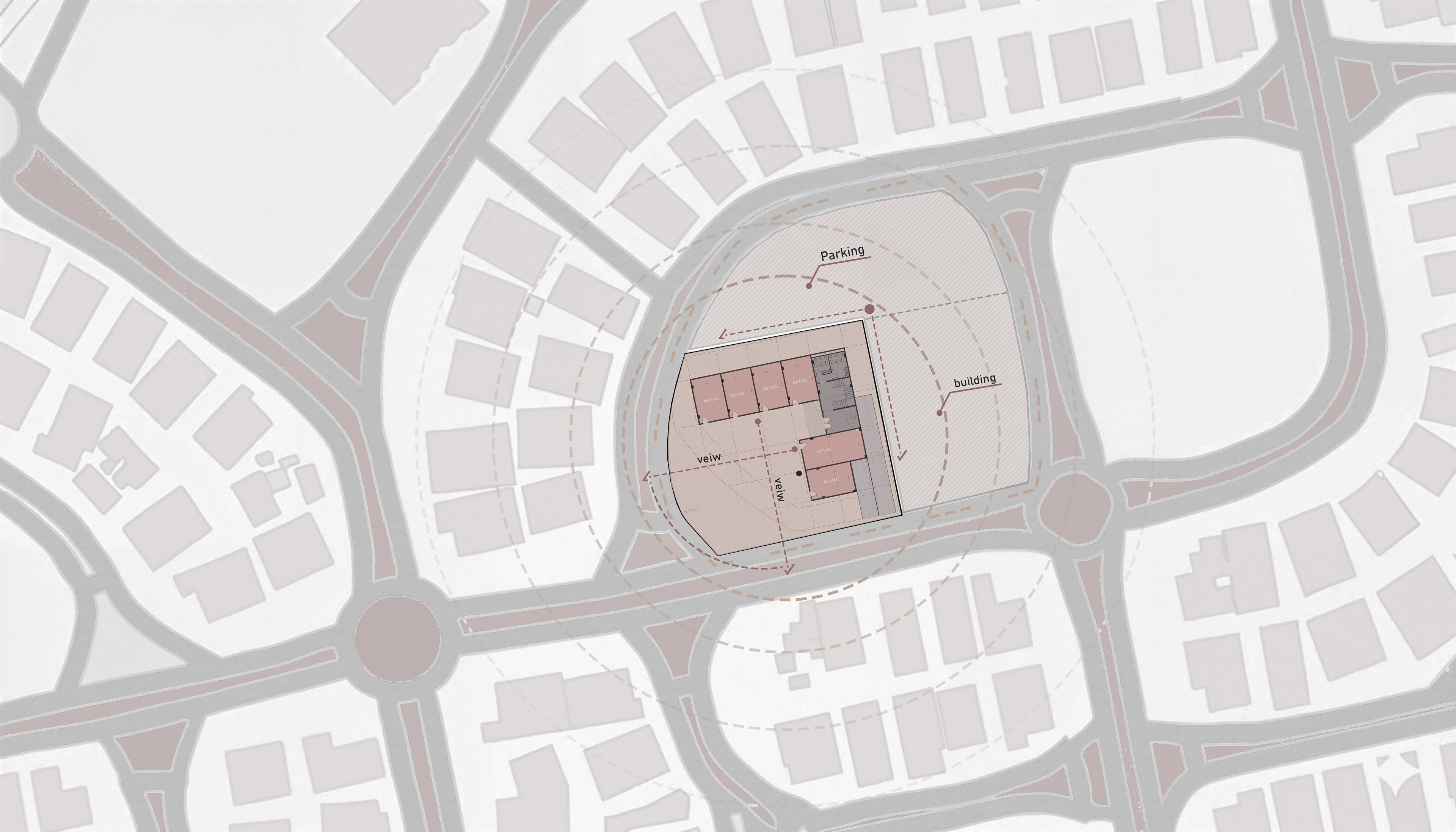 |||| Green Space :A significant focus was placed on introducing lush landscaping and active water features (the free-form pools) within the residential heart, creating an oasis effect. The large undeveloped plot at the top serves as a future public park or open buffer zone.CirculationThe design utilizes clear vehicular loops and ample parking, ensuring easy access to the retail units while prioritizing pedestrian-friendly connections between the residential blocks and the central water feature. _________________