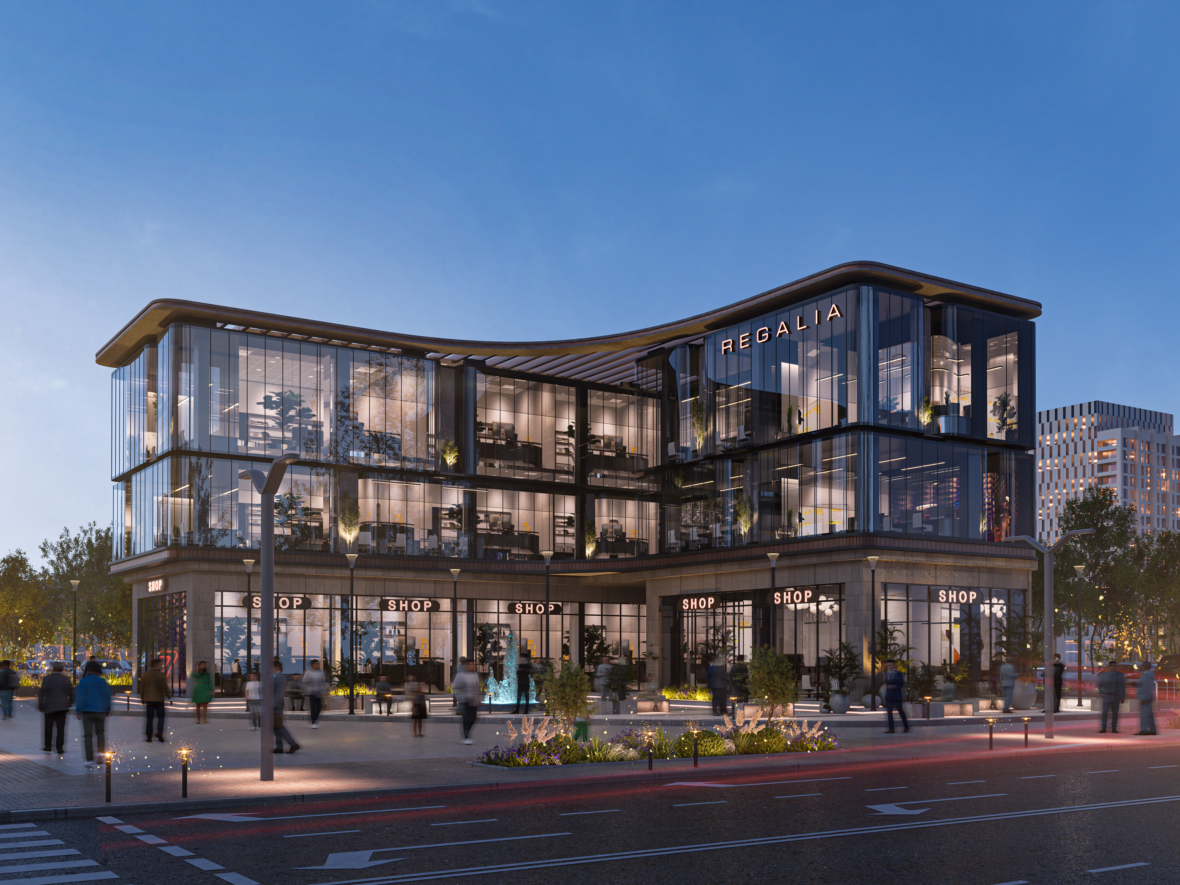 The building is branded “REGALIA” which communicates a sense of luxury, elegance, and prestige. The retail units on the ground floor attract foot traffic, while the upper floors are dedicated to mixed-use activities such as offices, showrooms, or lifestyle venues.