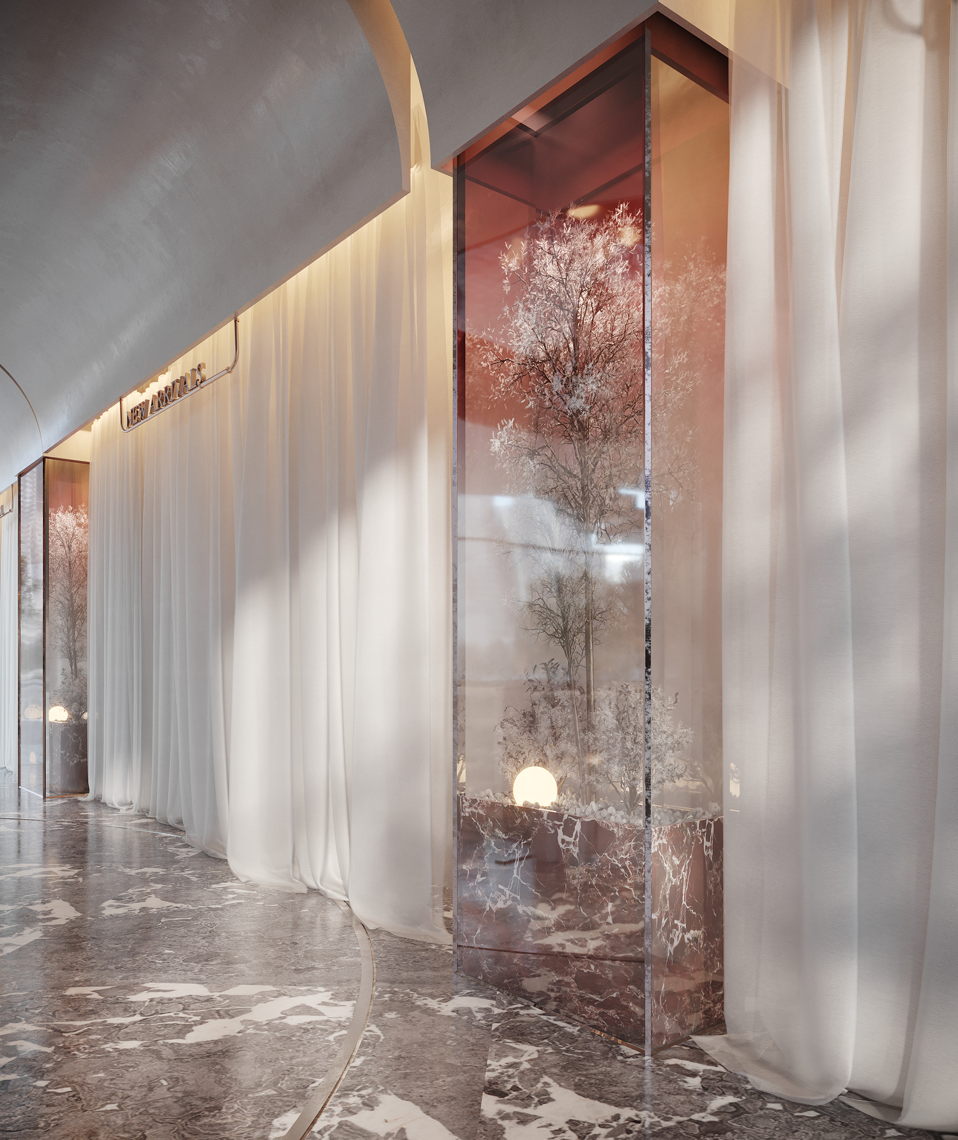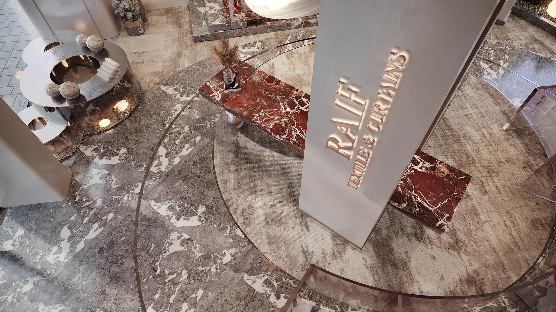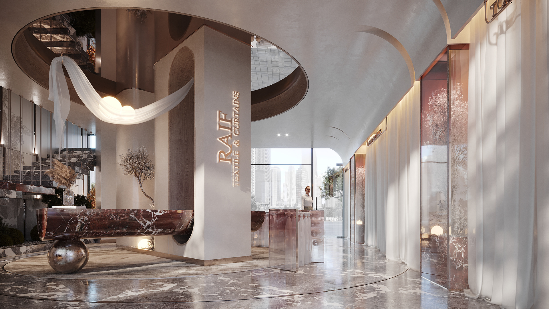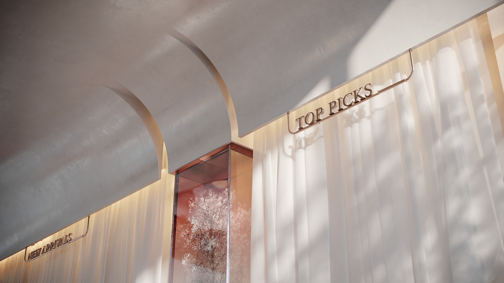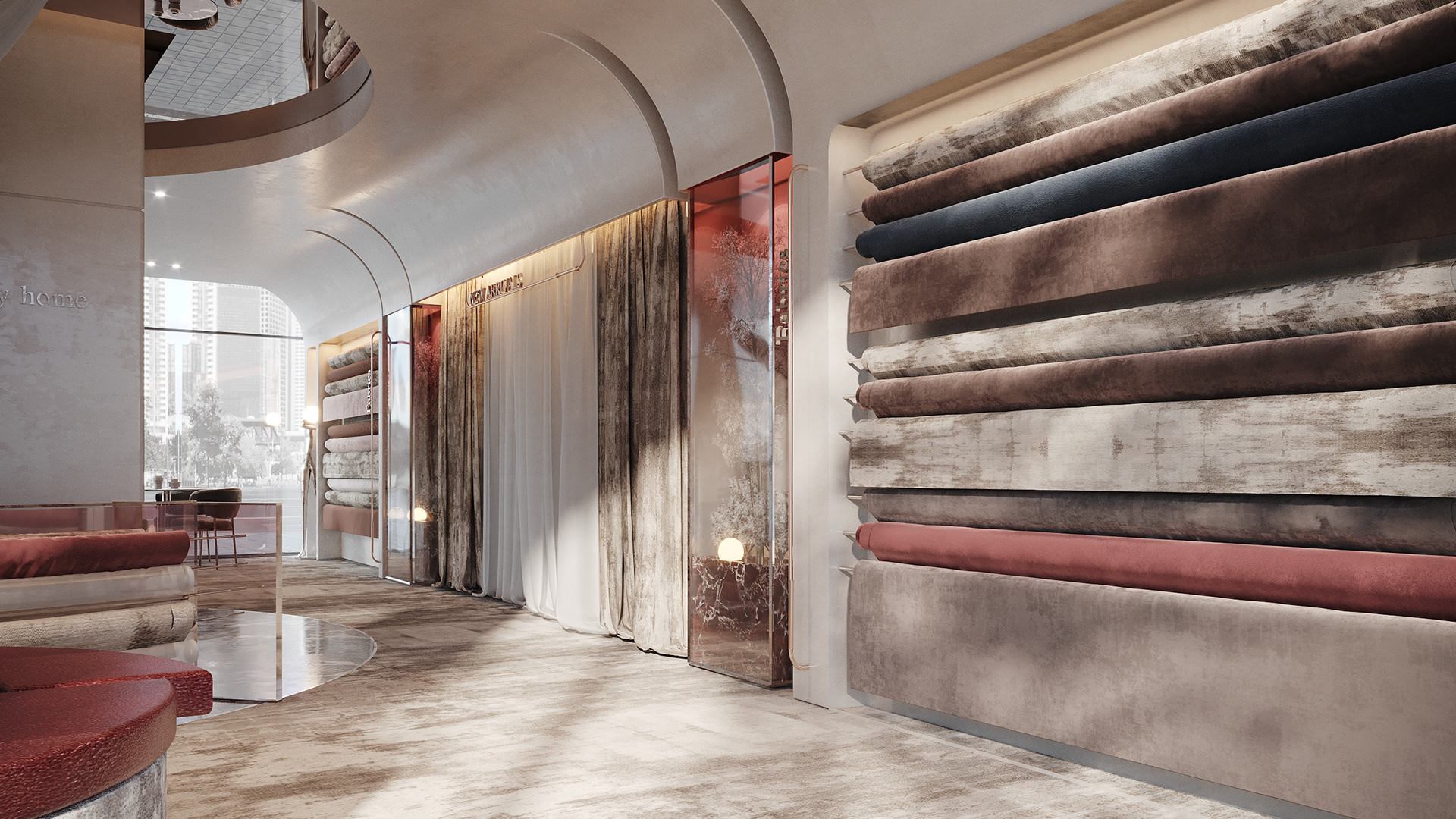 This design concept aims to elevate the display of fabrics and curtains while providing a flexible, visually appealing environment for customers to explore and imagine possibilities for their own spaces.