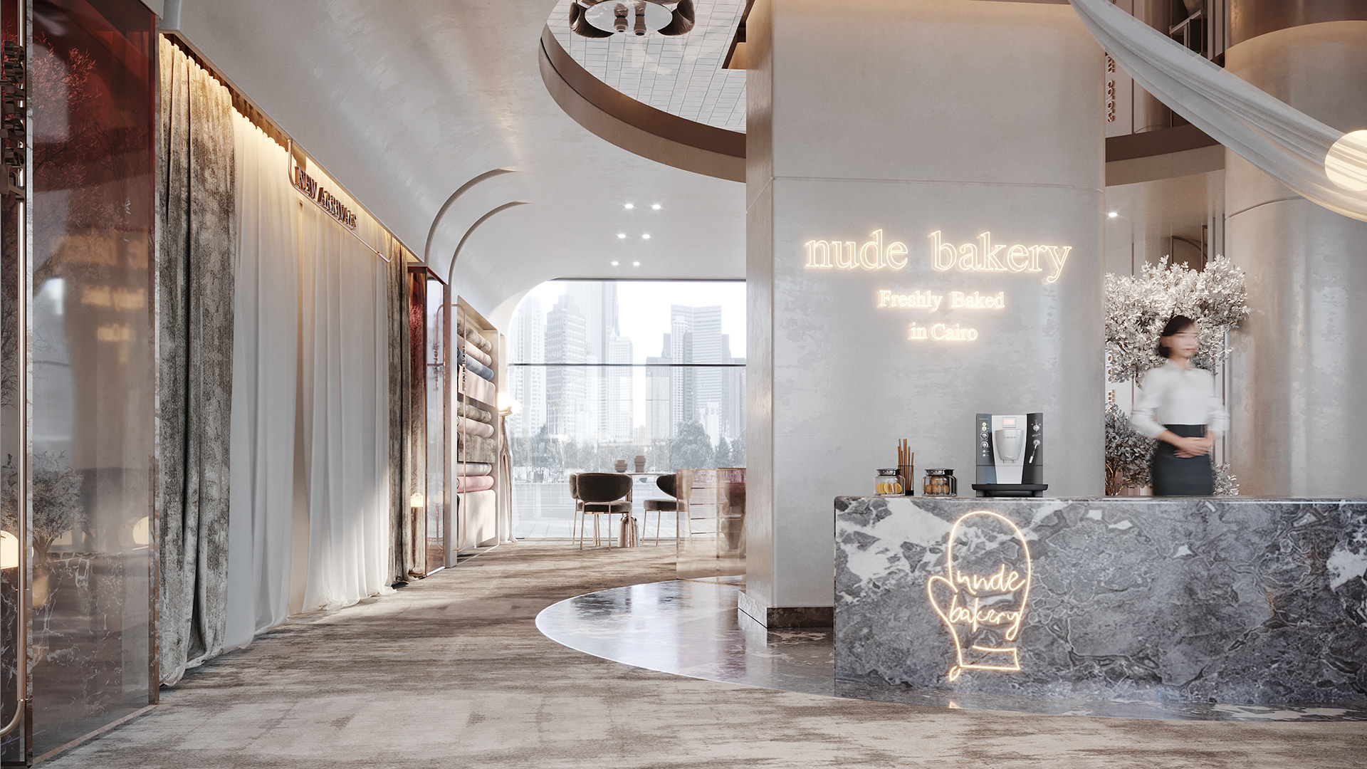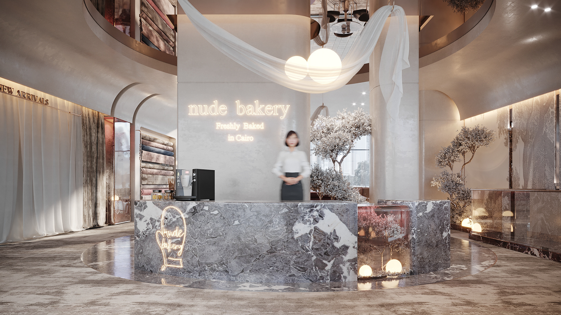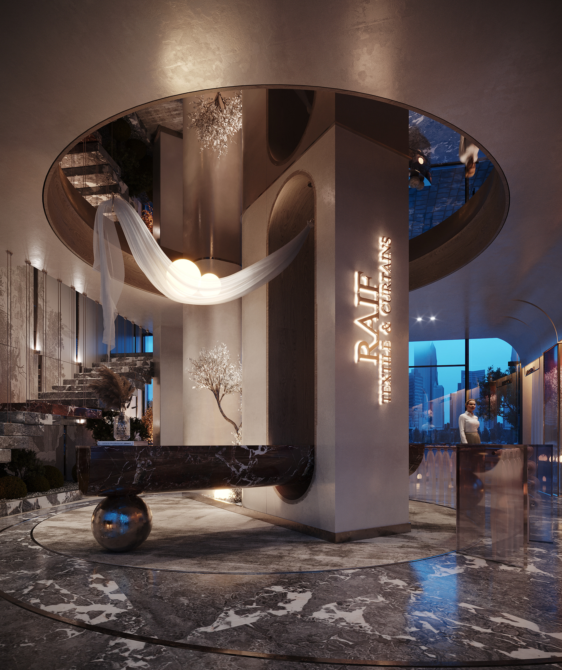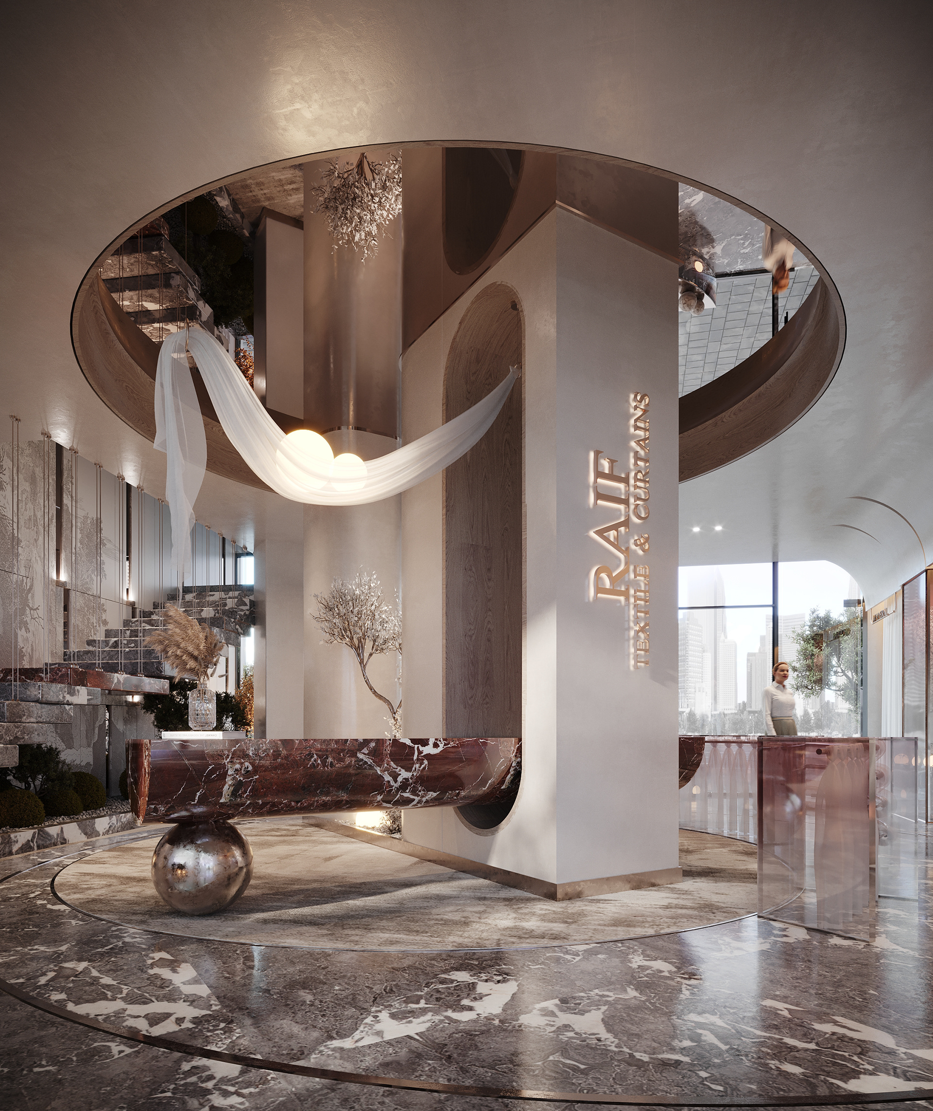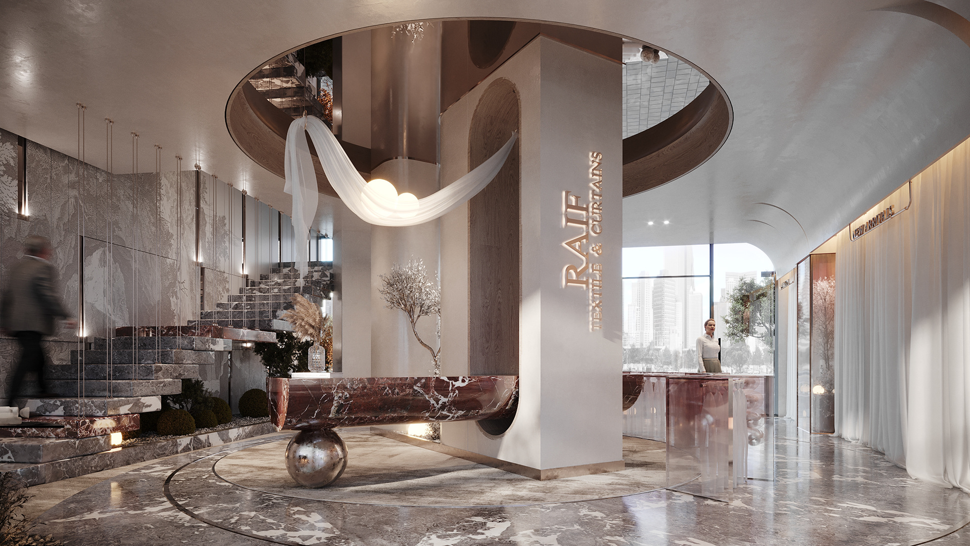This design concept aims to elevate the display of fabrics and curtains while providing a flexible, visually appealing environment for customers to explore and imagine possibilities for their own spaces.