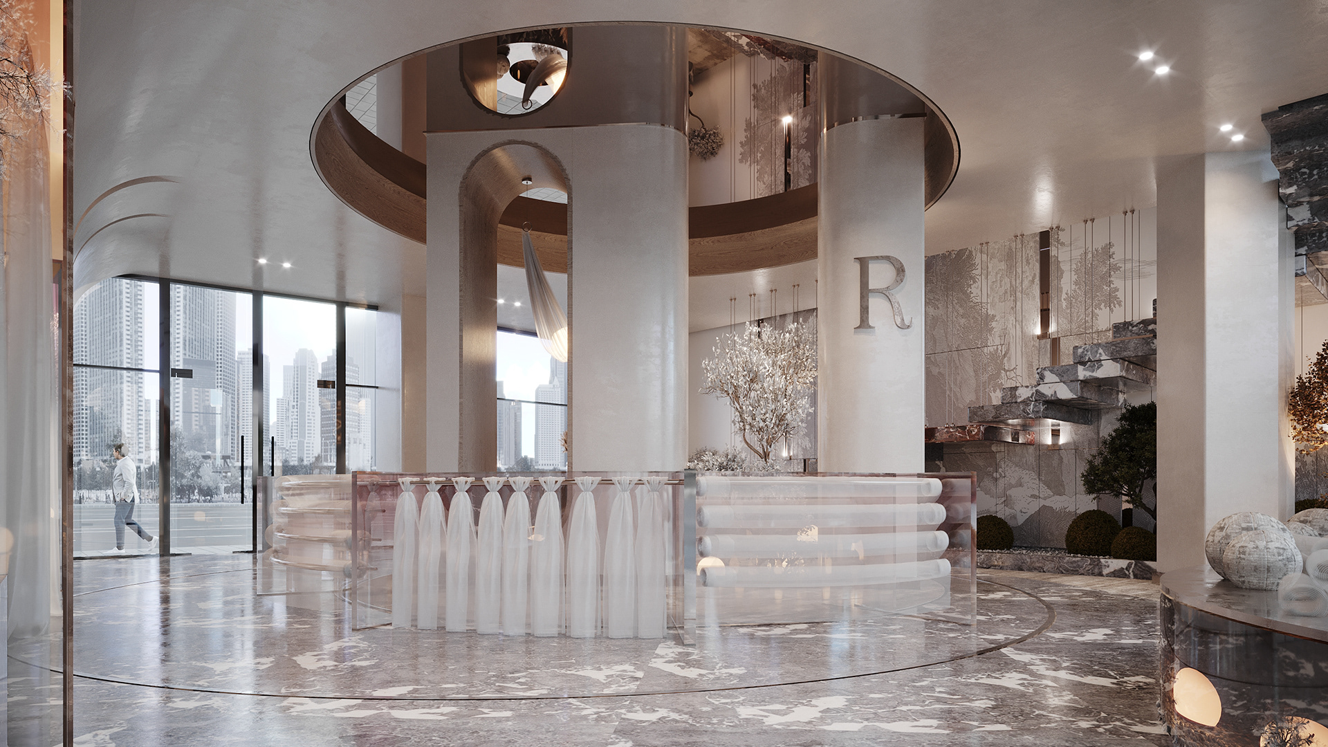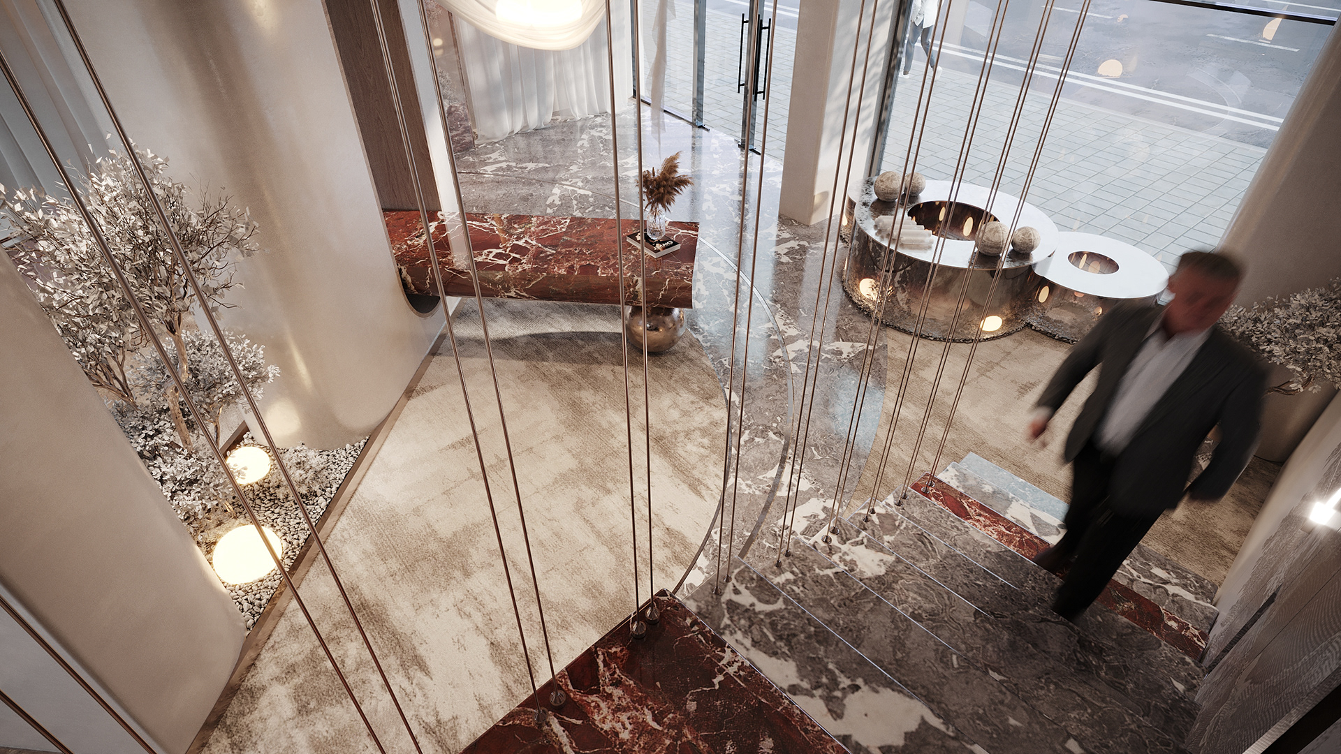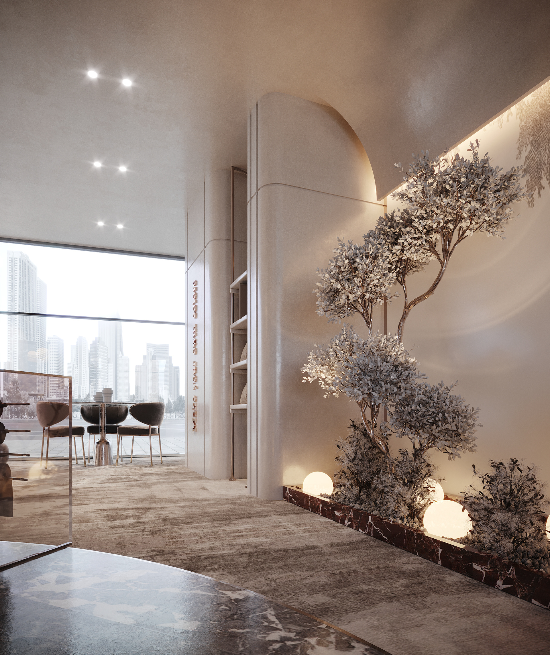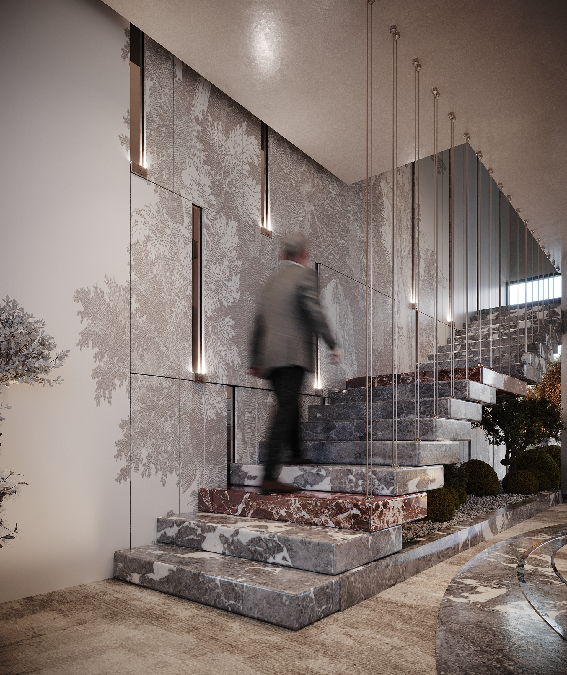 4.Modern aesthetic: The mix of traditional (wallpaper) and contemporary (gradient glass) materials creates a timeless yet current ambiance.