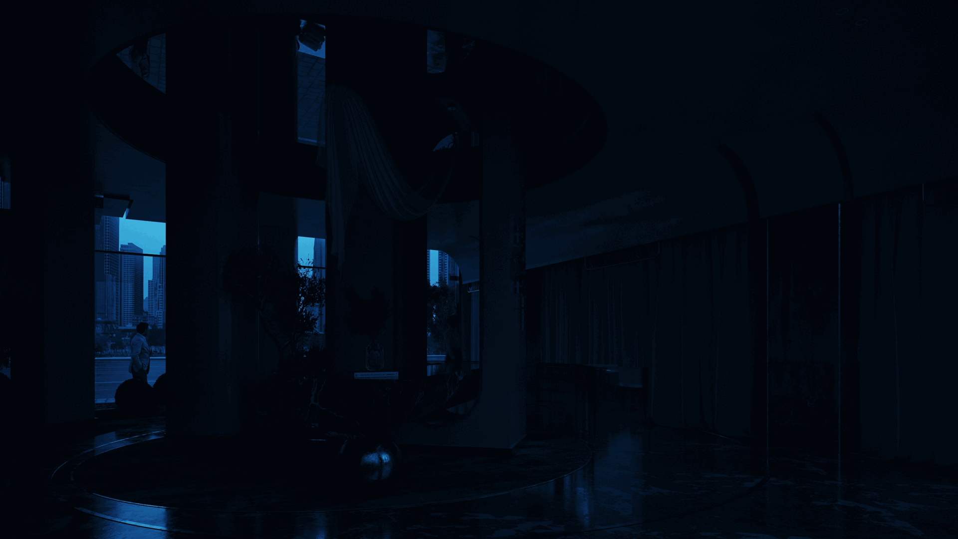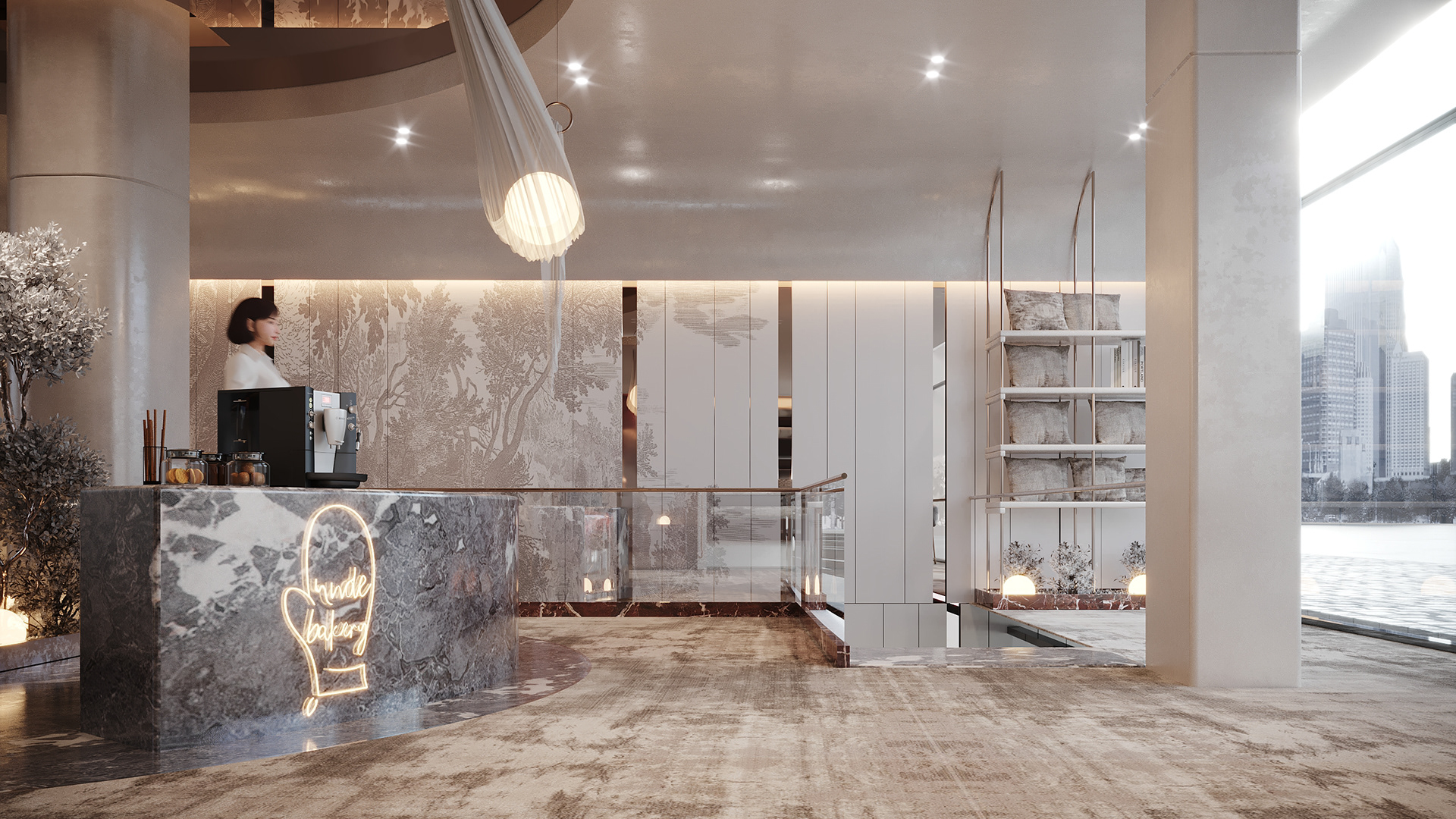 The showroom design harmoniously blends wallpaper, gradient glass, and white paint to create a sophisticated and versatile backdrop for displaying fabrics and curtains. This combination of elements offers: