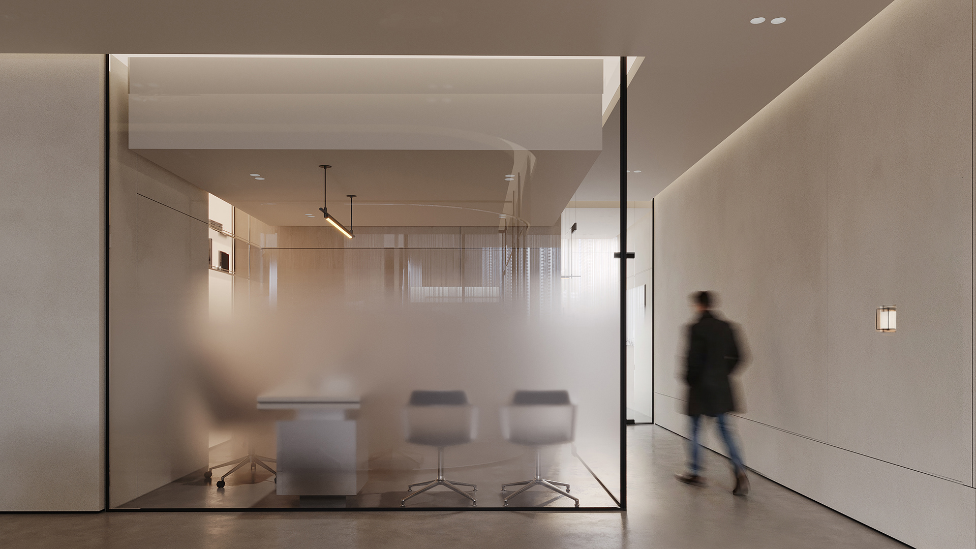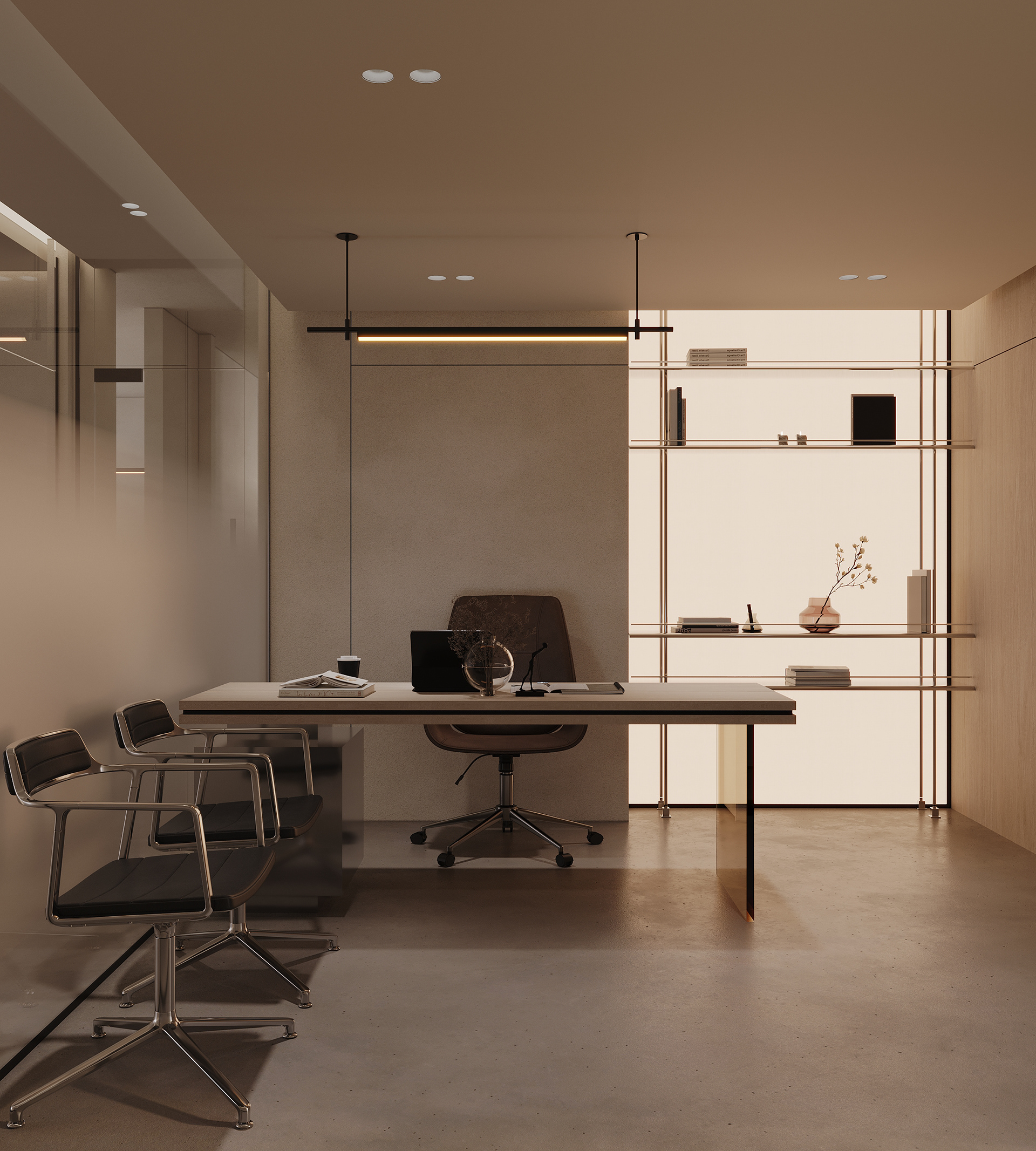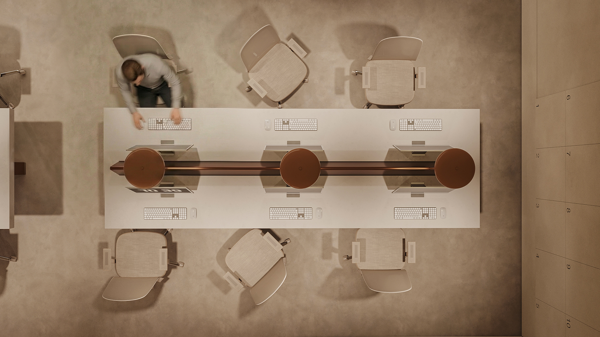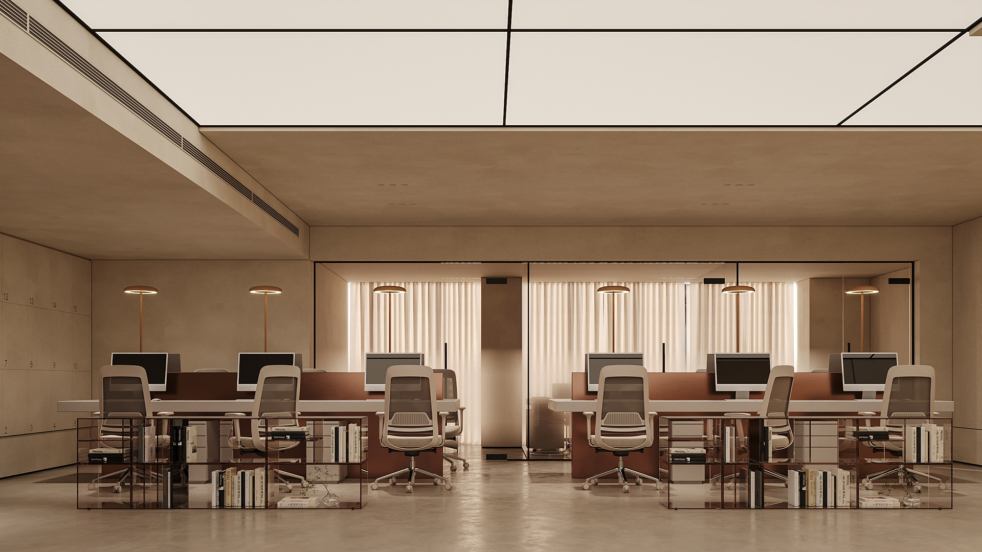 The workstations are defined by a simple yet confident design language, drawing on the same materials and elements introduced in the reception area to maintain visual continuity throughout the space. Integrated lighting is built directly into the workstations, providing focused illumination while keeping the ceiling clean, seamless, and free of visual clutter. This approach reinforces a sense of order and calm, allowing the architecture and furnishings to speak with quiet strength.