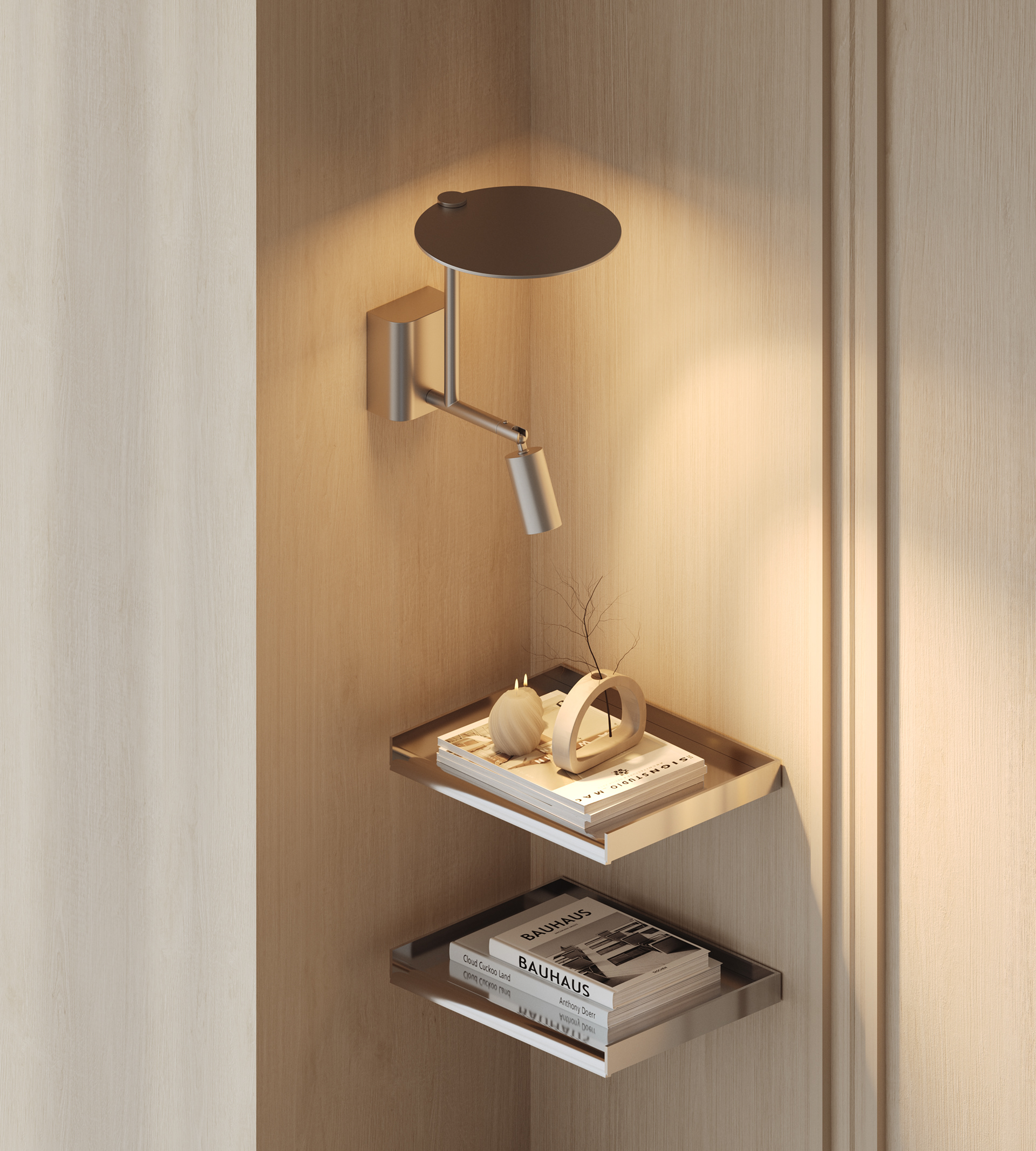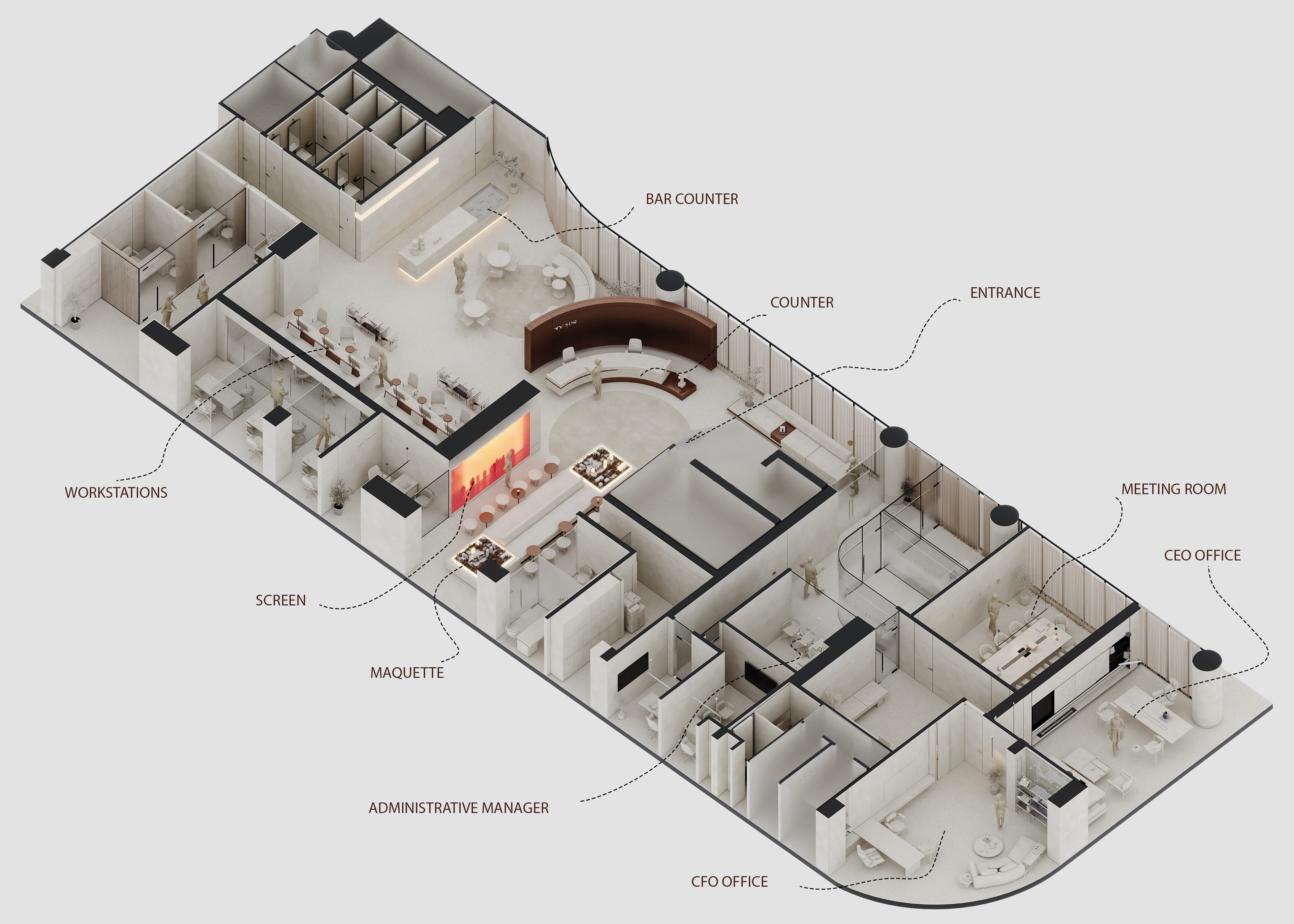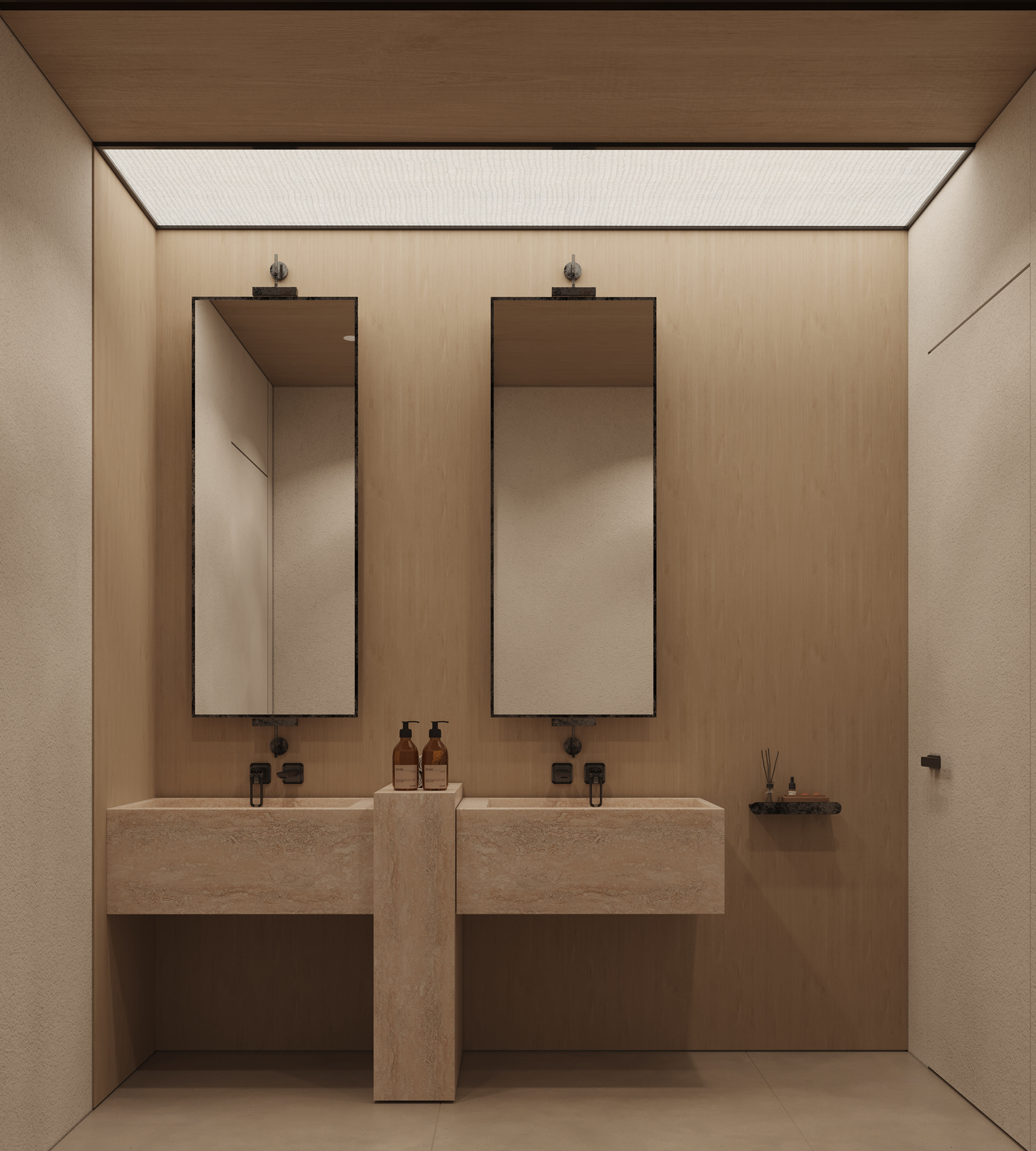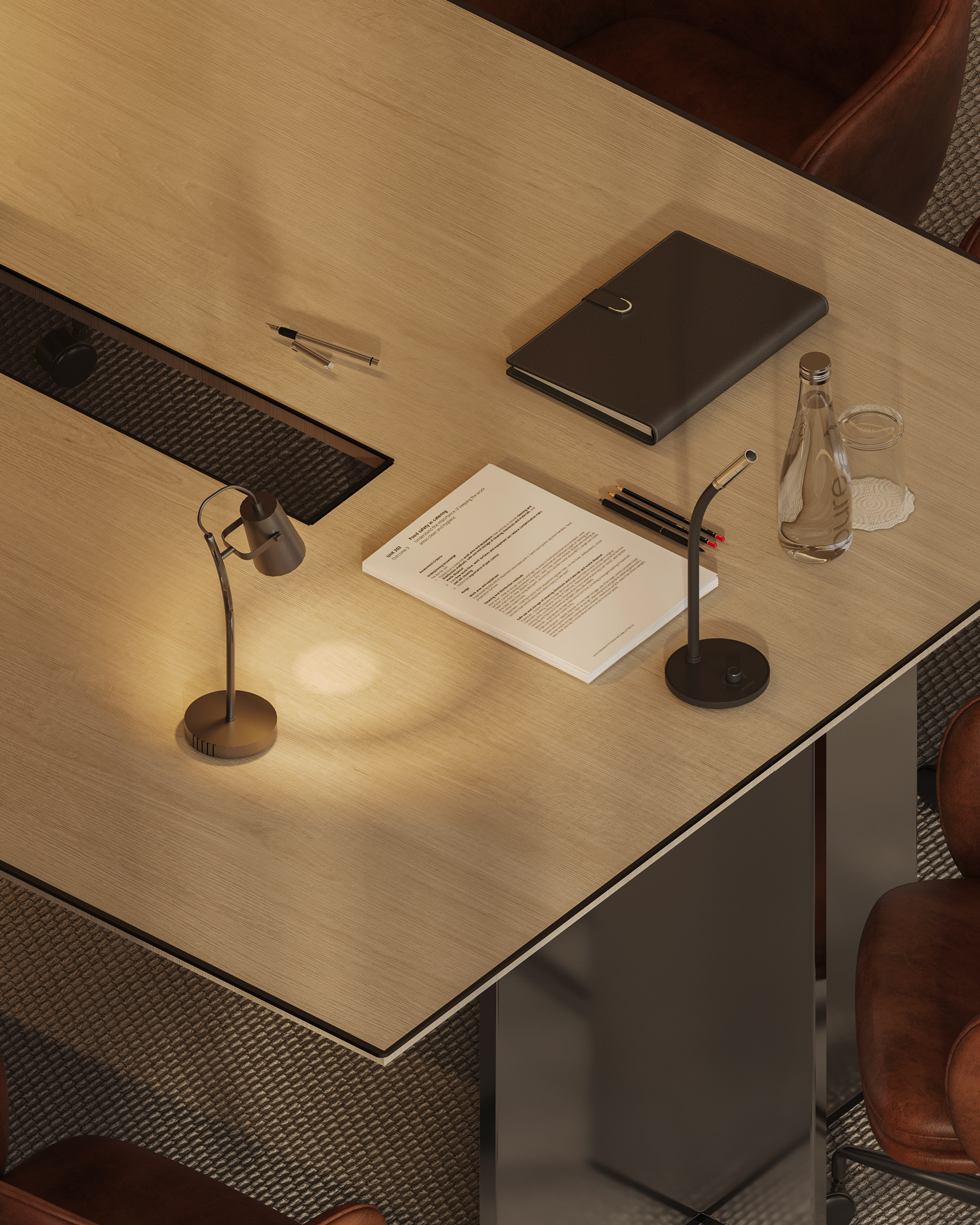 The workstations are defined by a simple yet confident design language, drawing on the same materials and elements introduced in the reception area to maintain visual continuity throughout the space. Integrated lighting is built directly into the workstations, providing focused illumination while keeping the ceiling clean, seamless, and free of visual clutter. This approach reinforces a sense of order and calm, allowing the architecture and furnishings to speak with quiet strength.