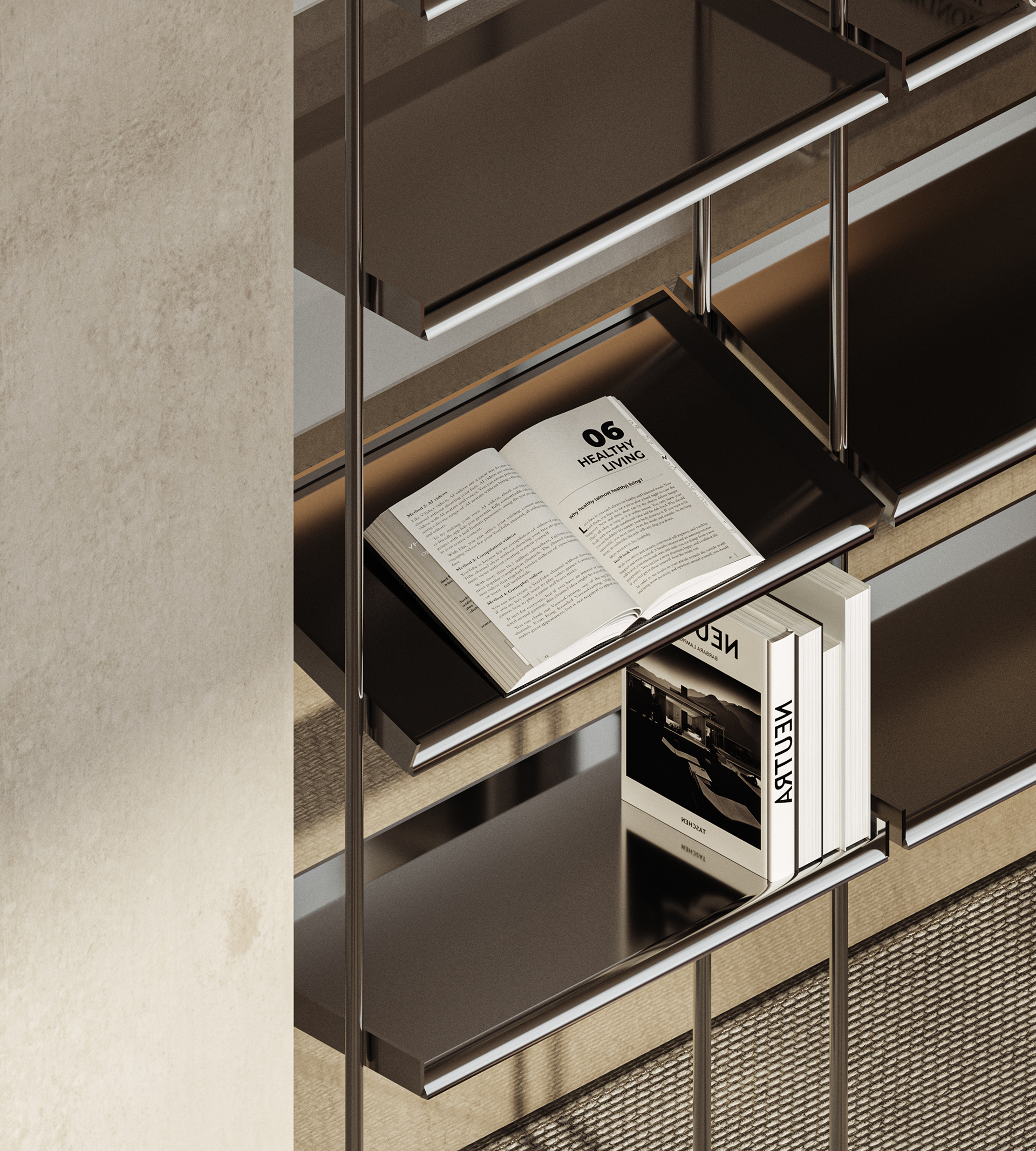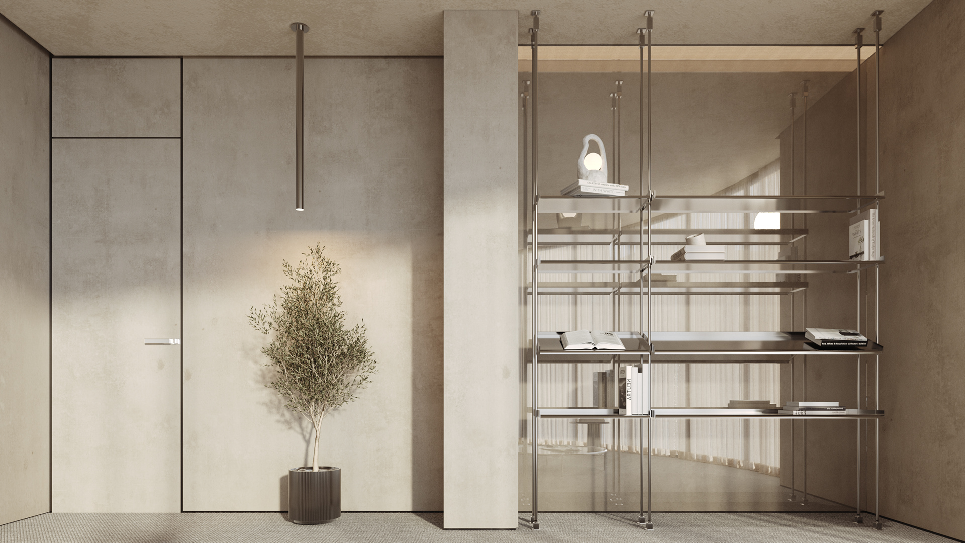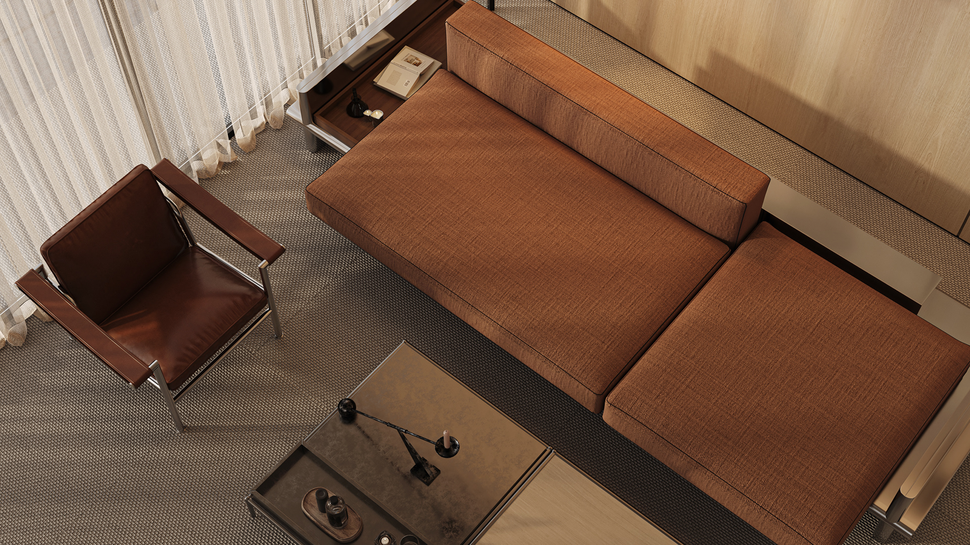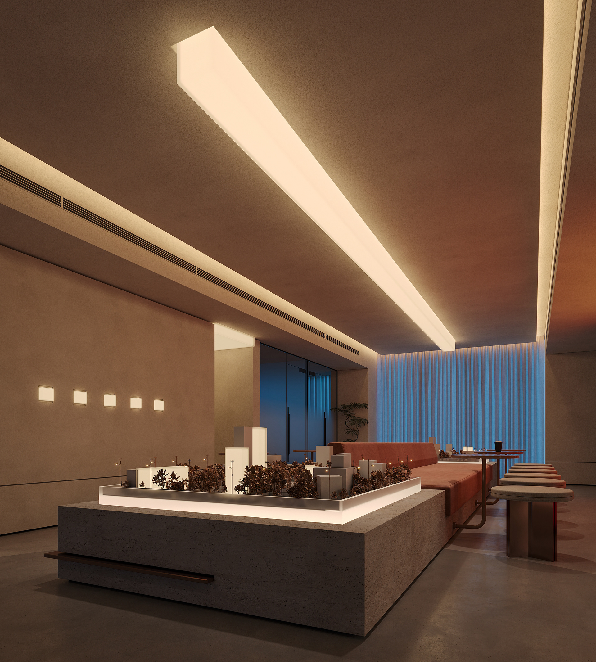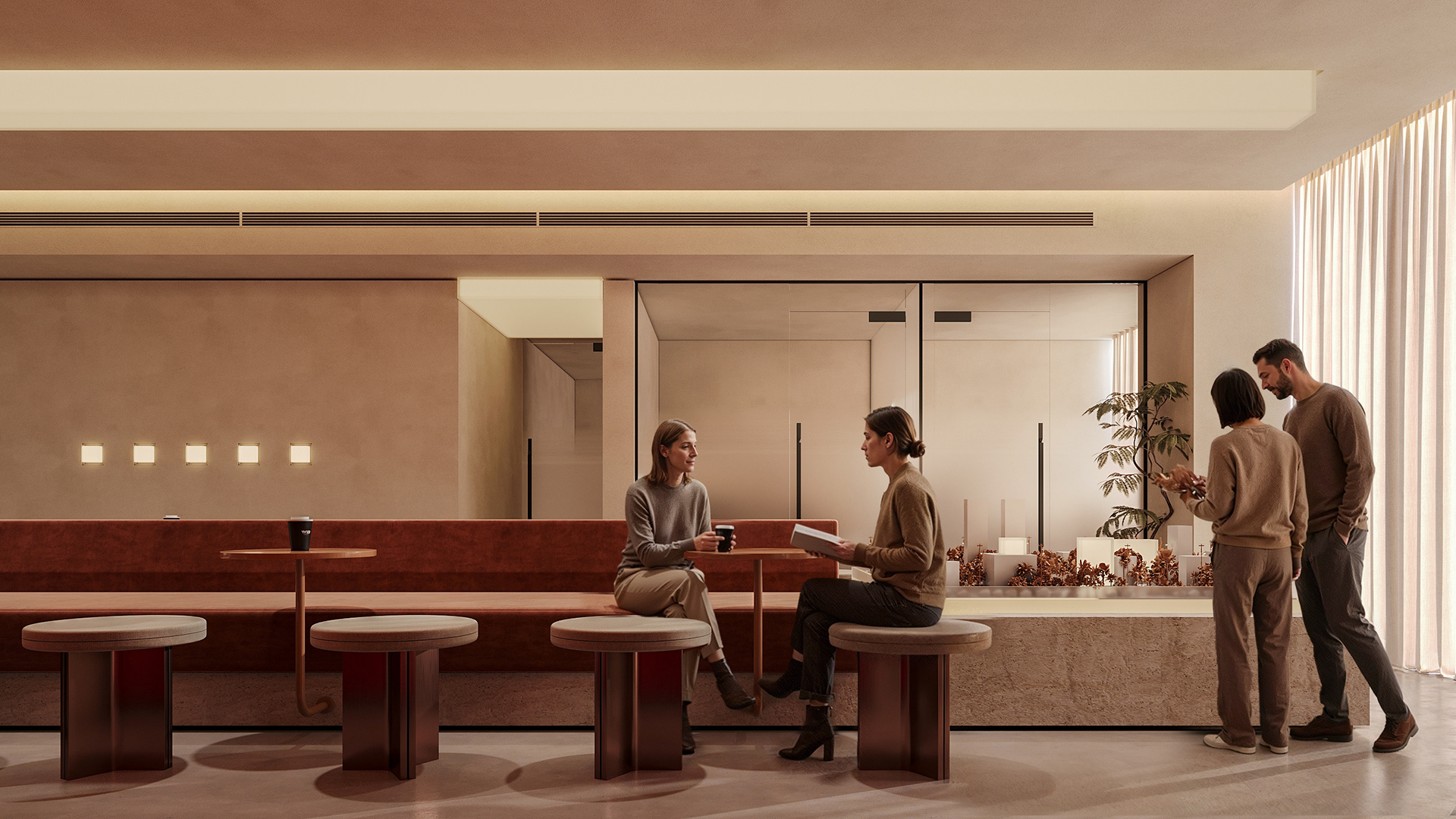 The lounge is conceived as an easygoing, multi-use space where informal sales meetings can happen naturally, without the feel of a formal meeting room. At the same time, it acts as a subtle showcase for the company’s projects, with display elements woven into the design rather than standing out on their own